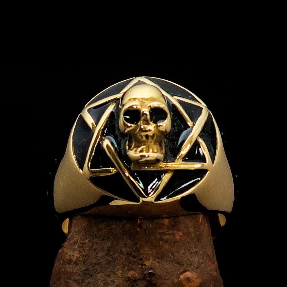 This ring showcases a unique hexagram skull design that is both edgy and stylish. The combination of the skull motif with the hexagram symbol creates a powerful visual impact, making it an ideal accessory for those who want to express their individuality. The black enamel finish adds depth and contrast to the polished brass, ensuring that this ring stands out in any setting.
