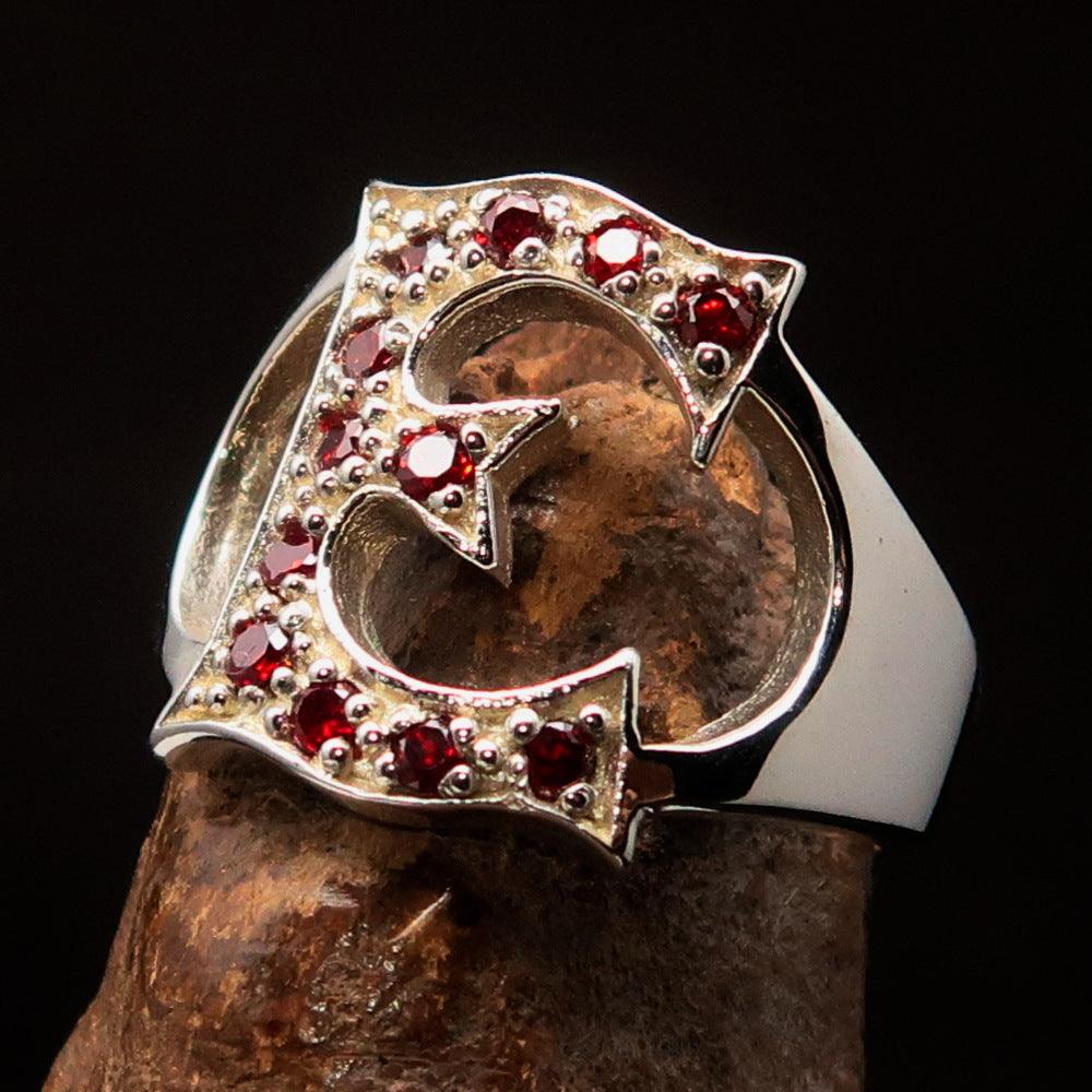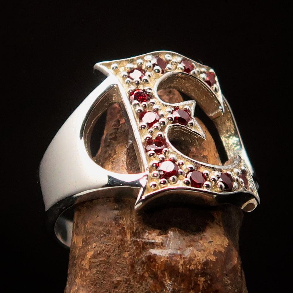 A beautifully crafted Sterling Silver Initial Ring featuring a bold letter E adorned with 12 red Cubic Zirconias, showcasing elegance and style.