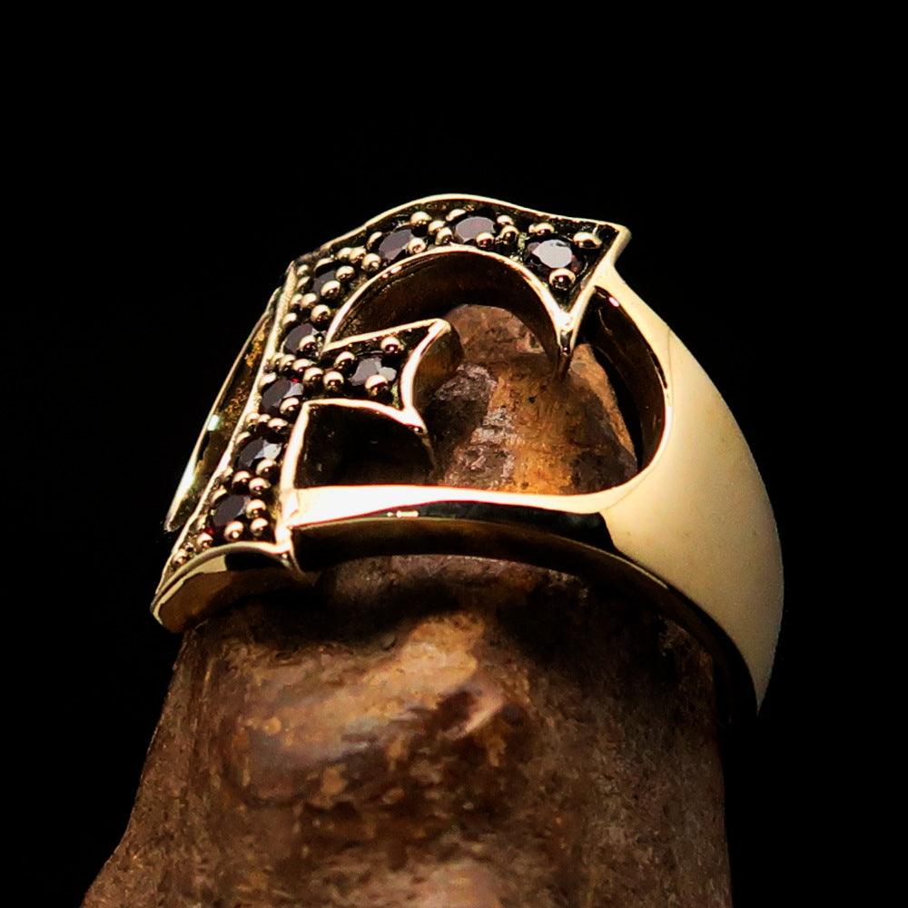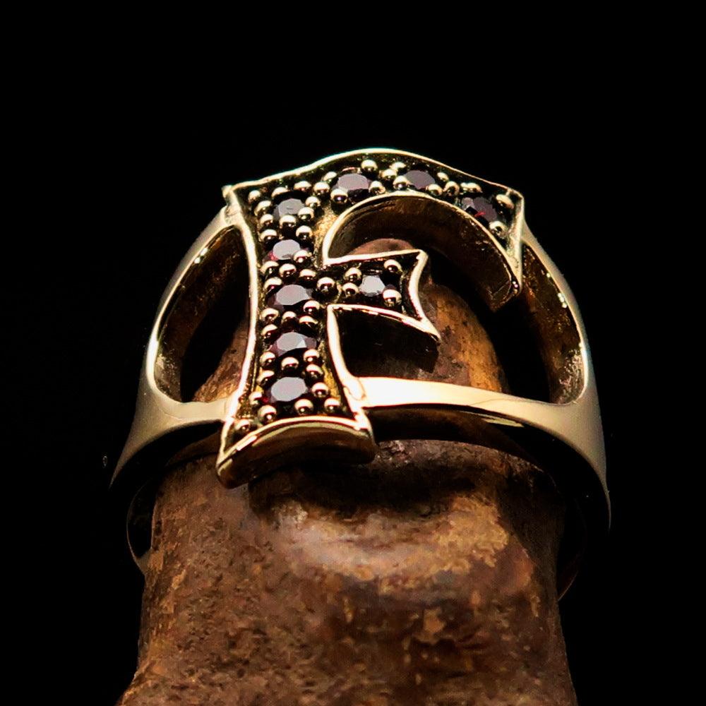 The mirror polished finish of the ring enhances its elegance, making it suitable for both casual and formal occasions. The bold letter 'F' stands out prominently, making it an ideal gift for someone whose name starts with this letter or for anyone who appreciates unique jewelry pieces. The combination of the solid Brass and the red CZ stones creates a striking contrast that is sure to draw attention.