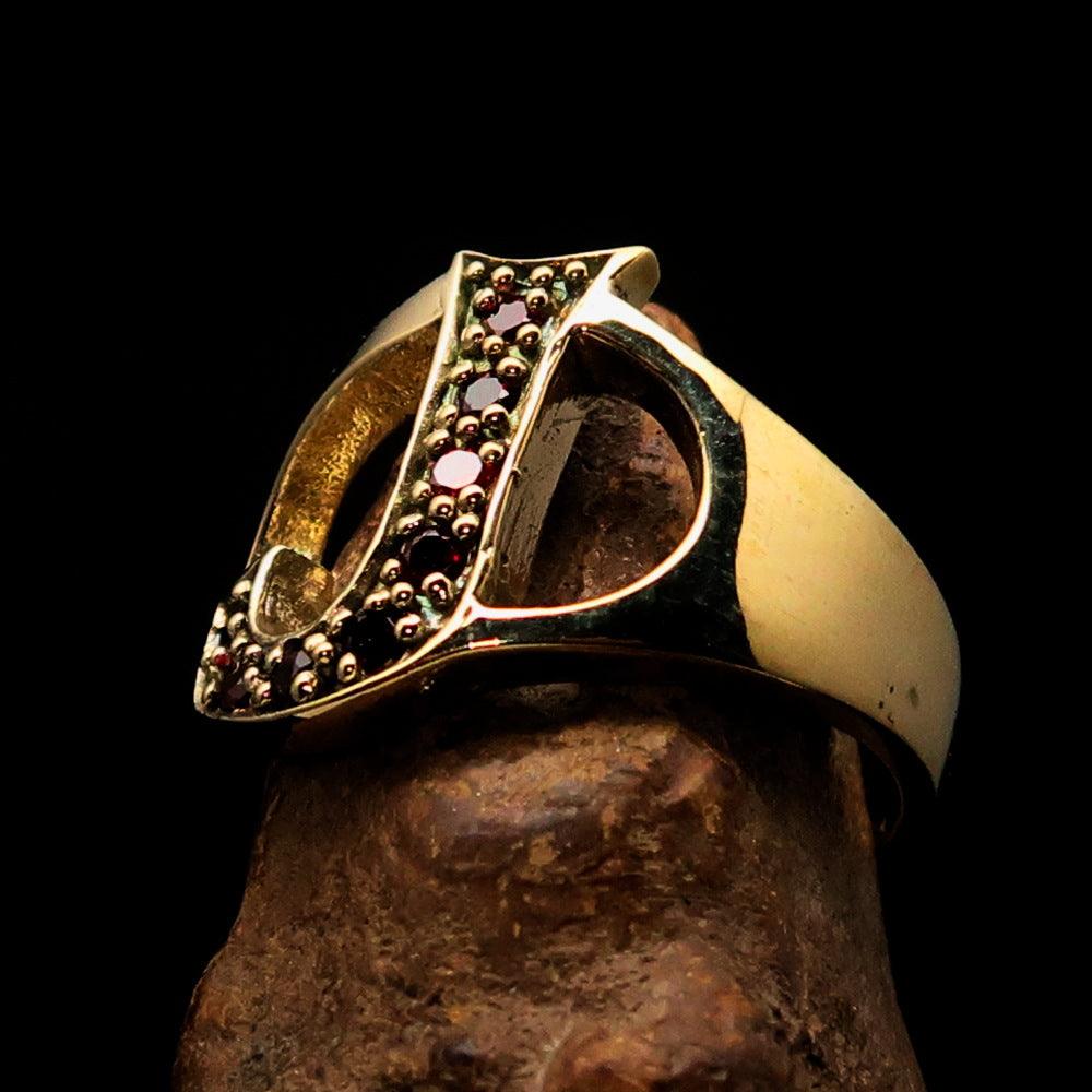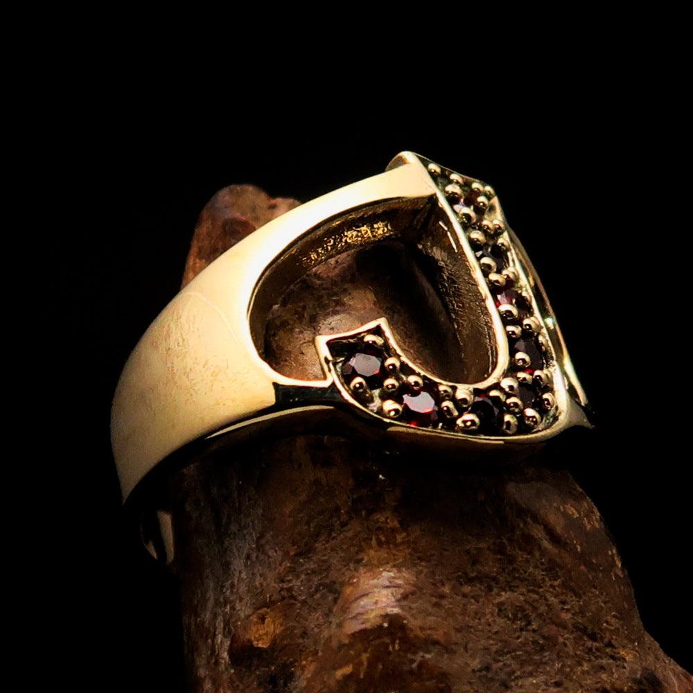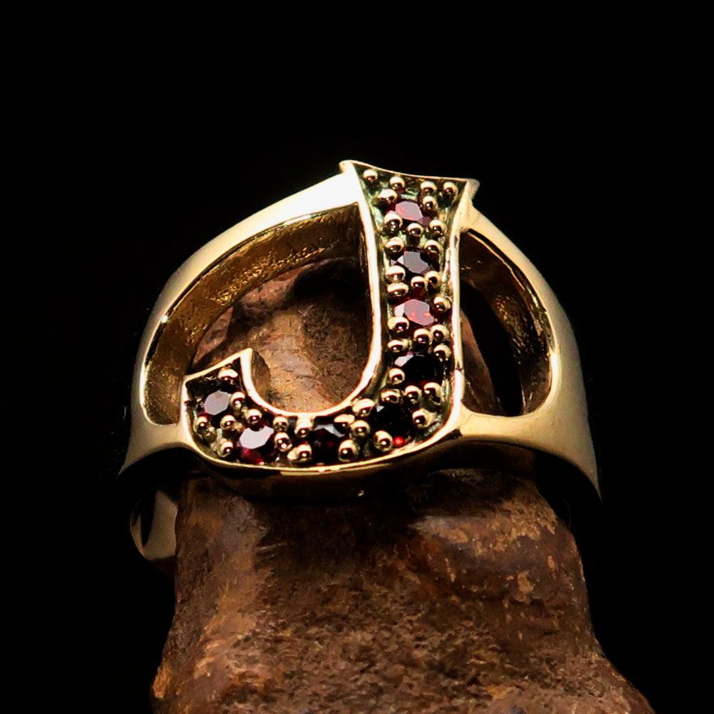 This Initial Ring is a stunning piece of jewelry that is expertly crafted from solid brass. The bold letter J is the focal point of the ring, making it a unique and personalized accessory. The ring is mirror polished, giving it a sleek and shiny finish. It also features 8 red Cubic Zirconias, adding a touch of sparkle and color to the design.