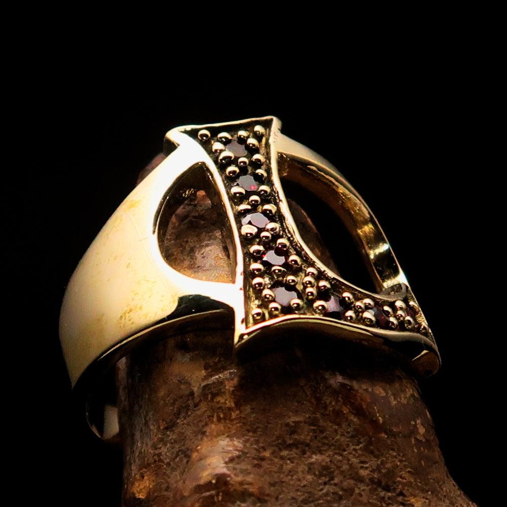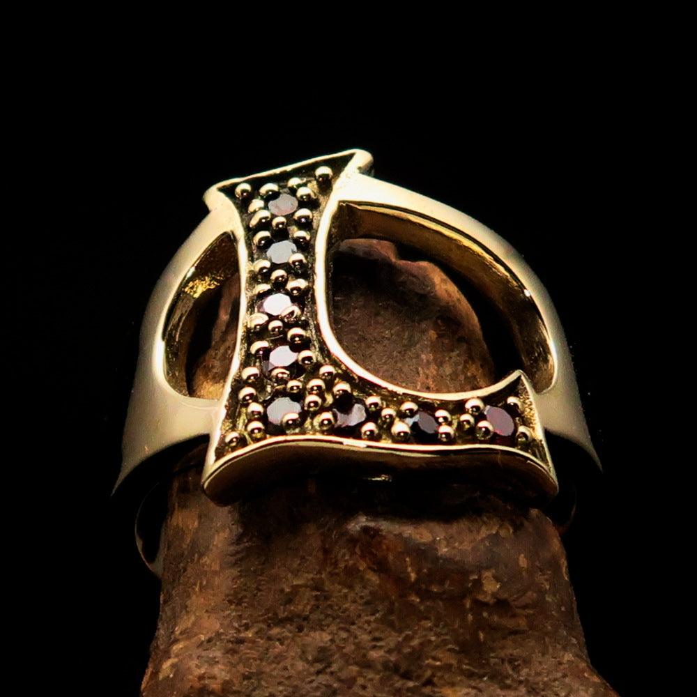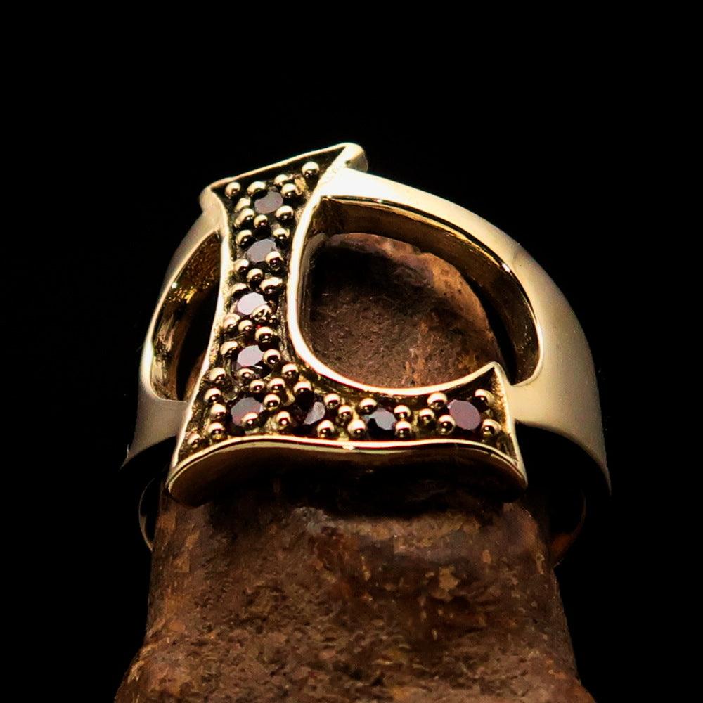 Excellent crafted Initial Ring featuring a bold letter L design with 8 red CZ stones, made from solid brass with a polished finish.