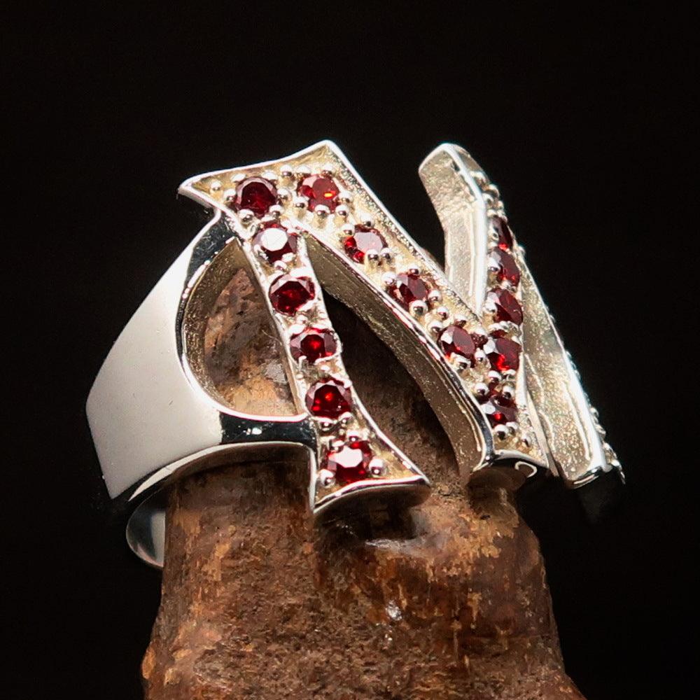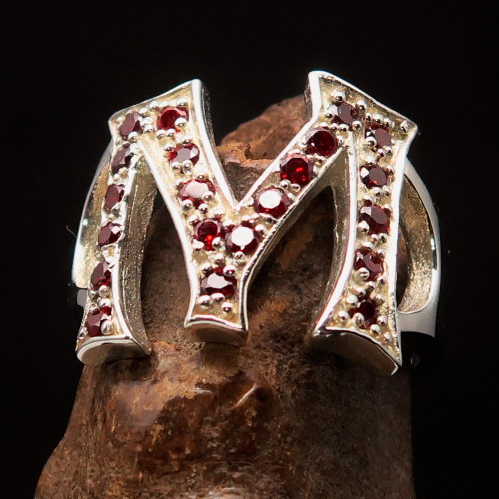 A beautifully crafted sterling silver ring featuring a bold letter M adorned with 21 red cubic zirconia stones, showcasing elegance and luxury.