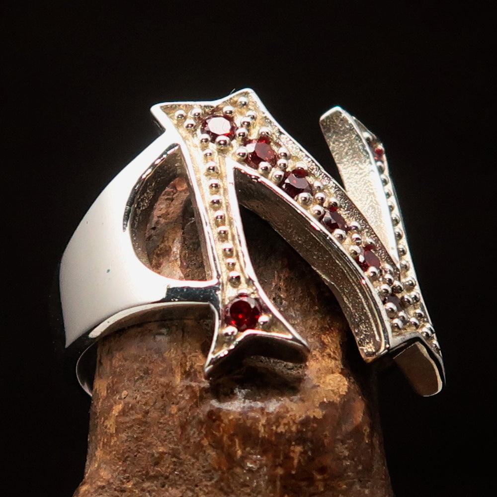 Excellent crafted Initial Ring featuring a bold letter N in sterling silver with 8 red Cubic Zirconias, showcasing a high-polished finish.
