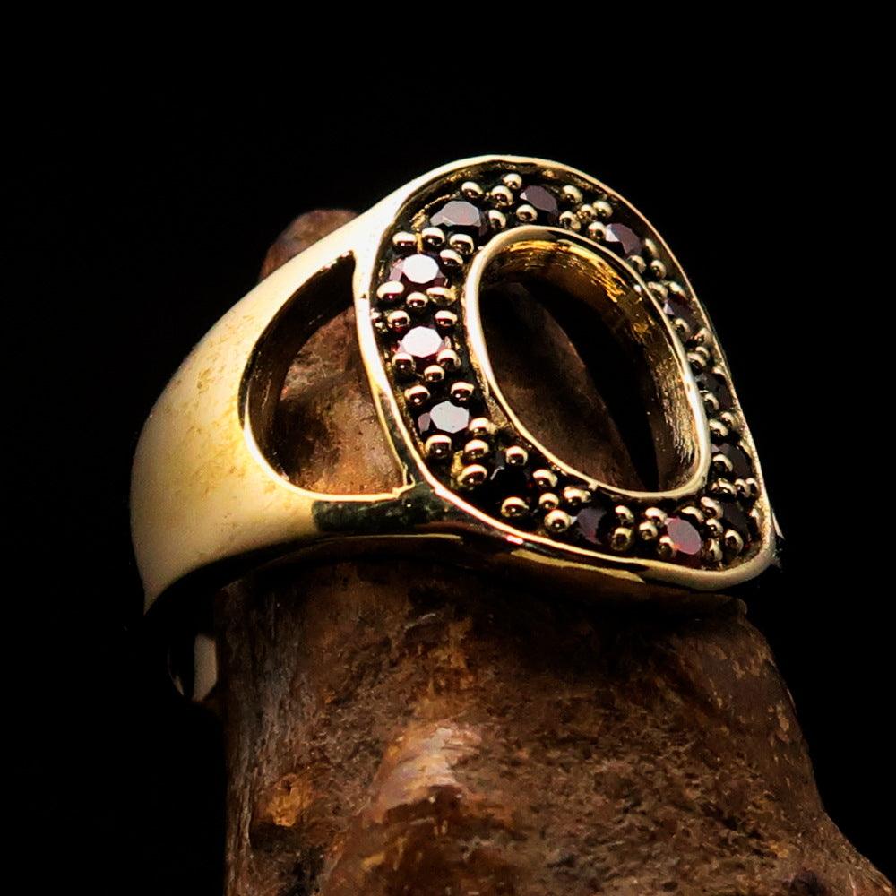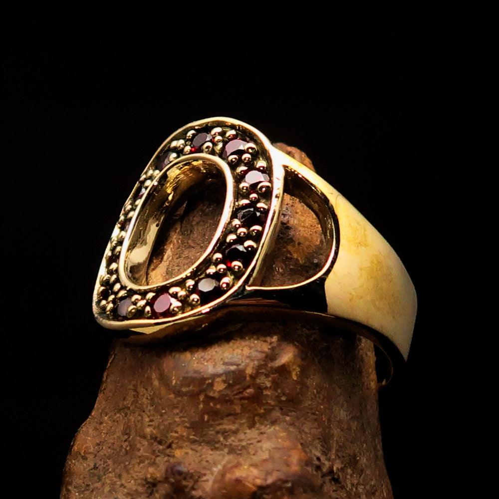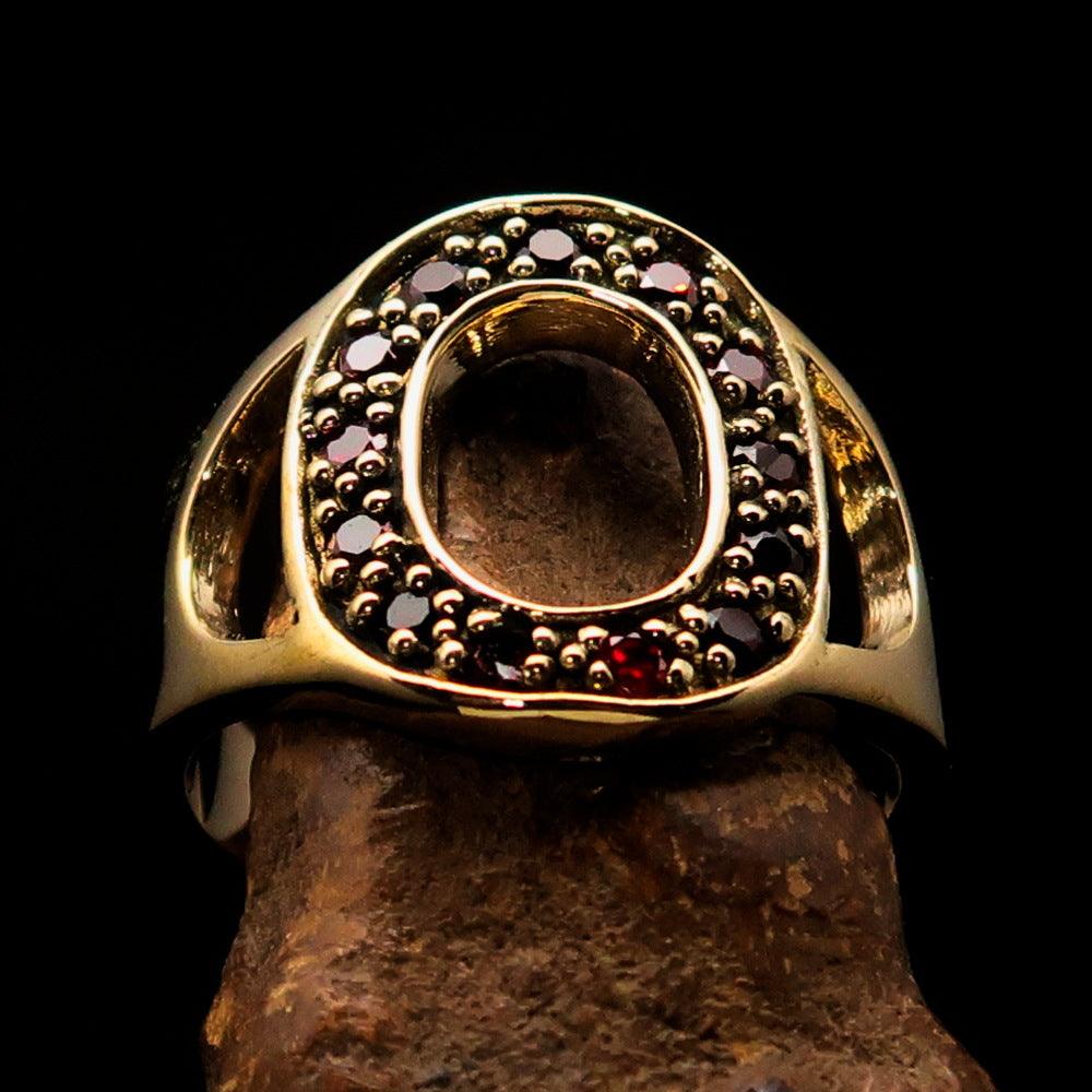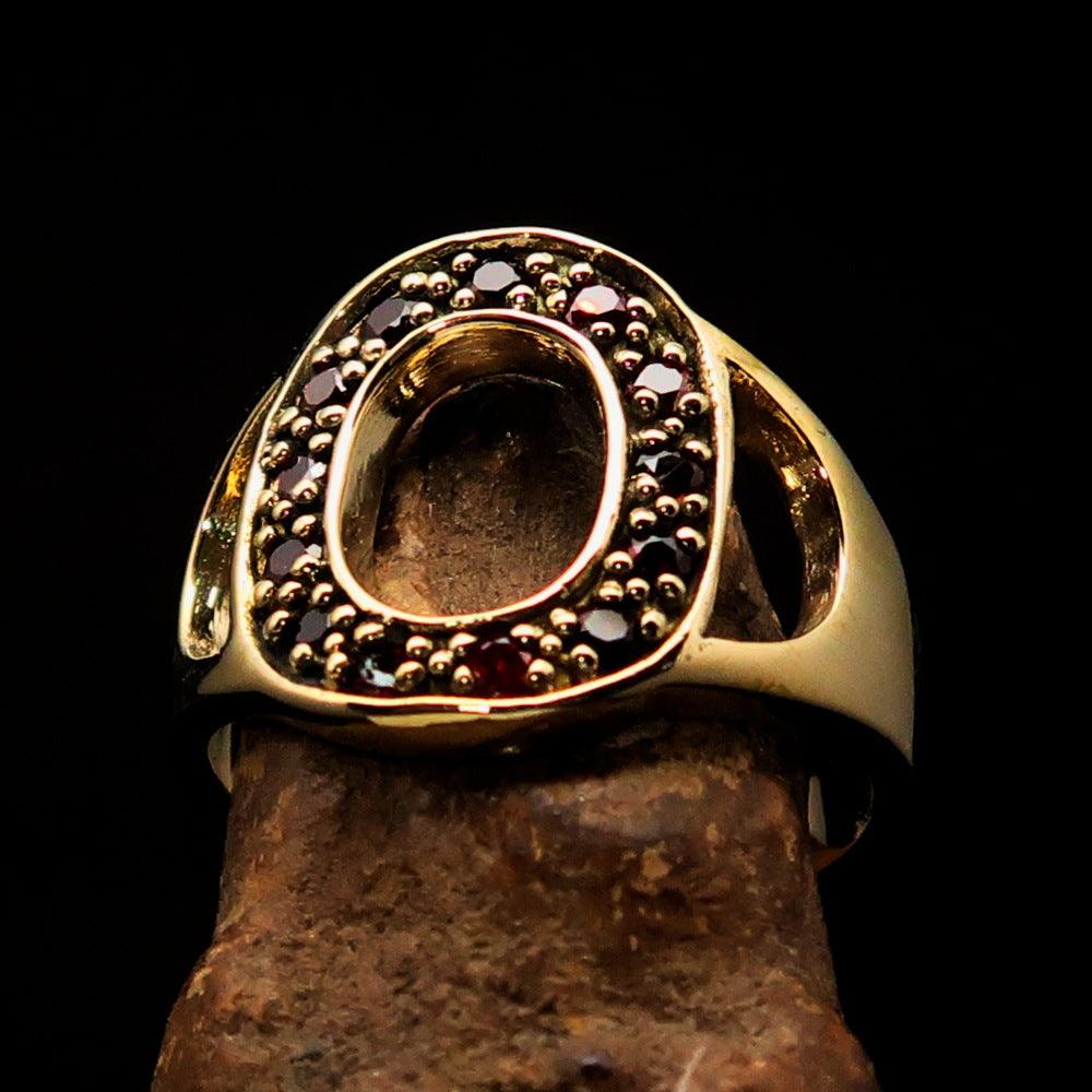 Excellent crafted Initial Ring featuring a bold letter O, adorned with 13 red Cubic Zirconias, made from solid brass with a mirror polished finish.
