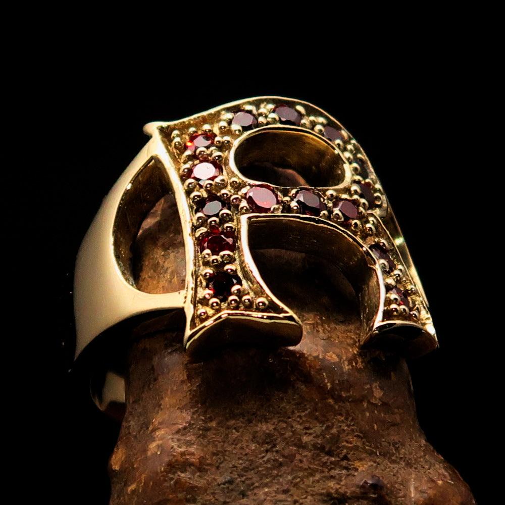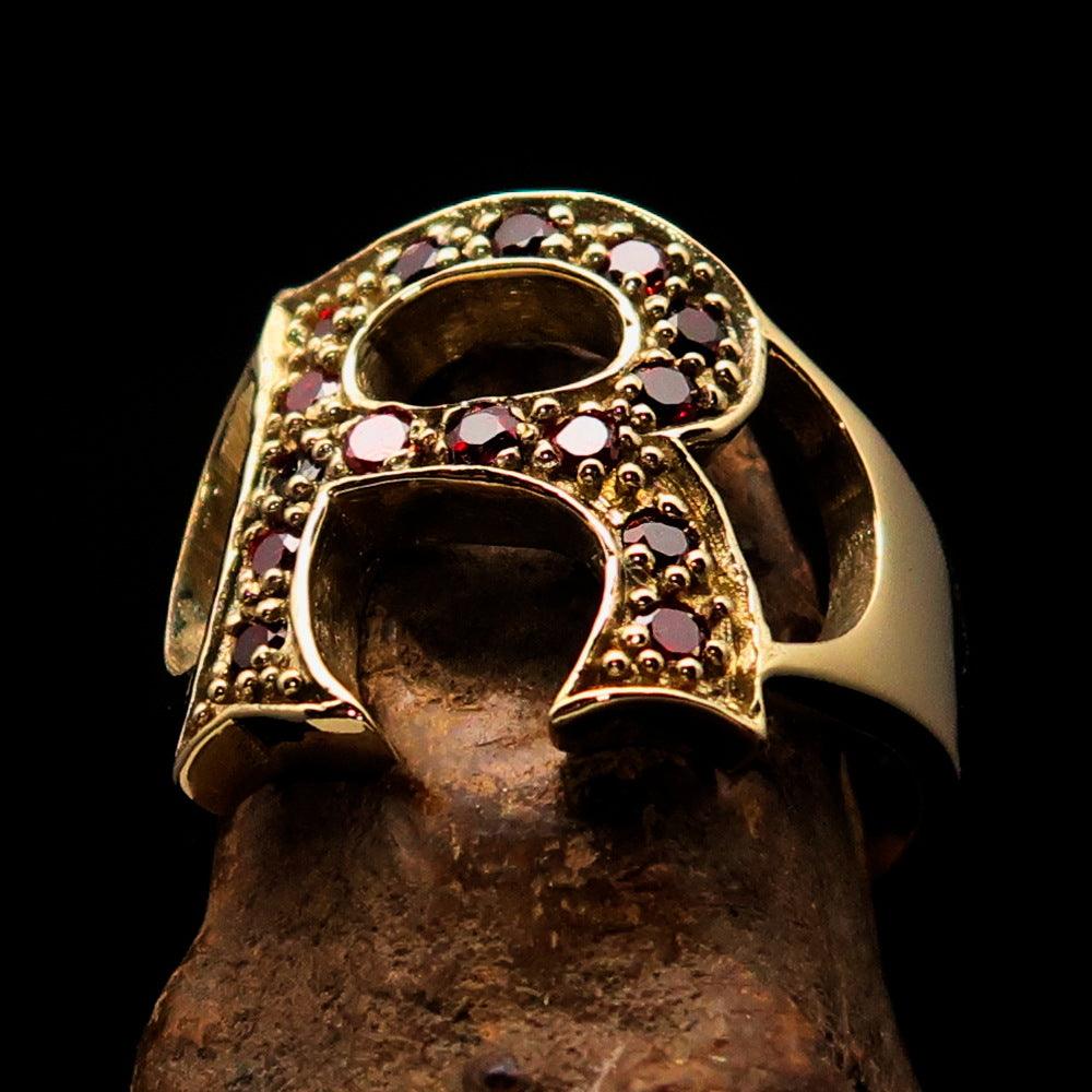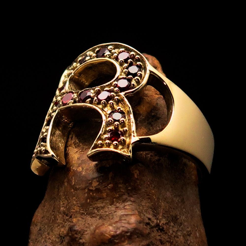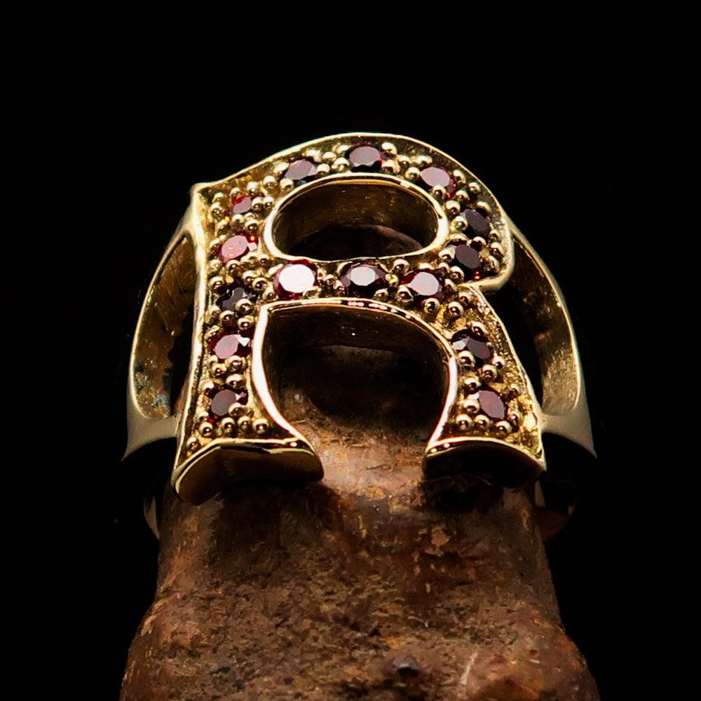 Excellent crafted Initial Ring featuring a bold letter R adorned with 15 red Cubic Zirconias, made from solid Brass with a mirror polish finish.