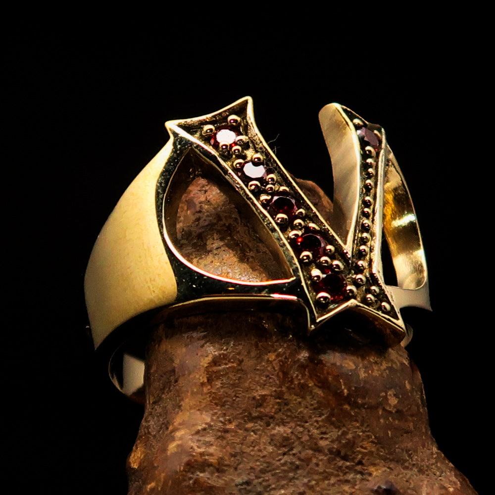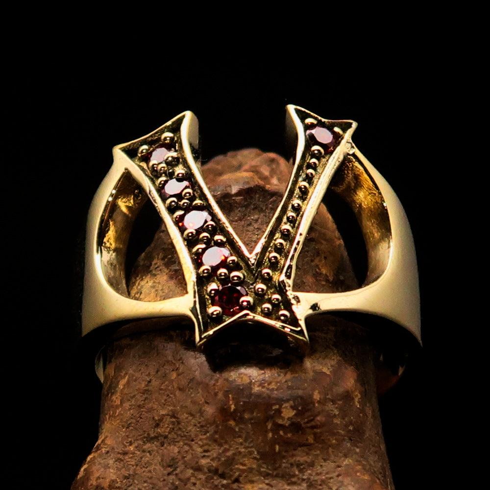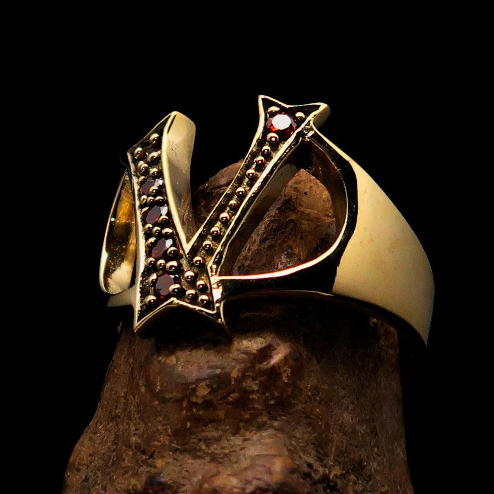 Don’t miss out on the opportunity to own this unique and eye-catching Initial Ring Bold Letter V - 6 red CZ - solid Brass. Order yours today and elevate your jewelry collection with this stunning piece that embodies both elegance and boldness.