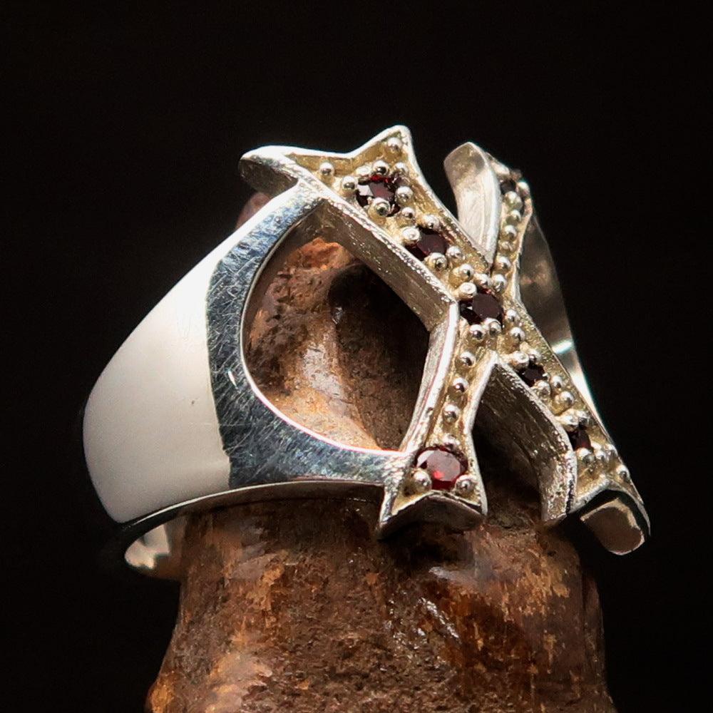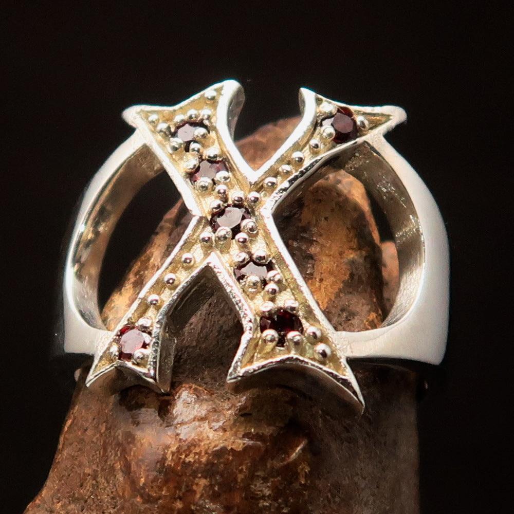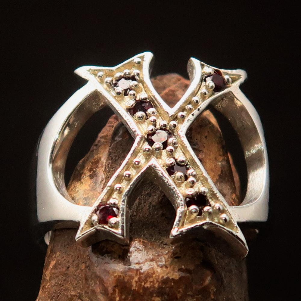 A bold sterling silver initial ring featuring the letter X, adorned with 7 vibrant red cubic zirconia stones, showcasing its elegant design.