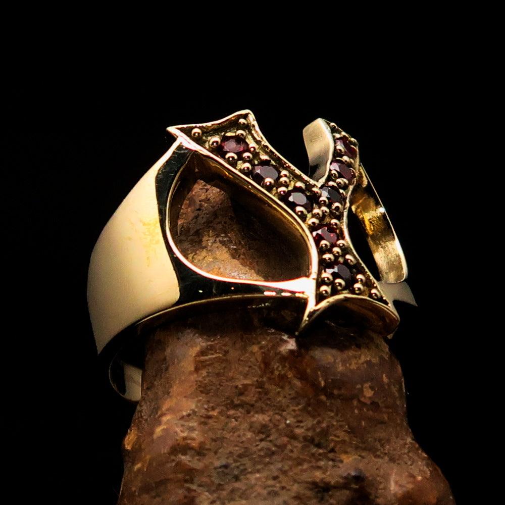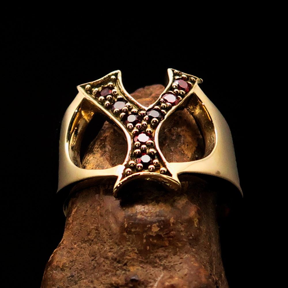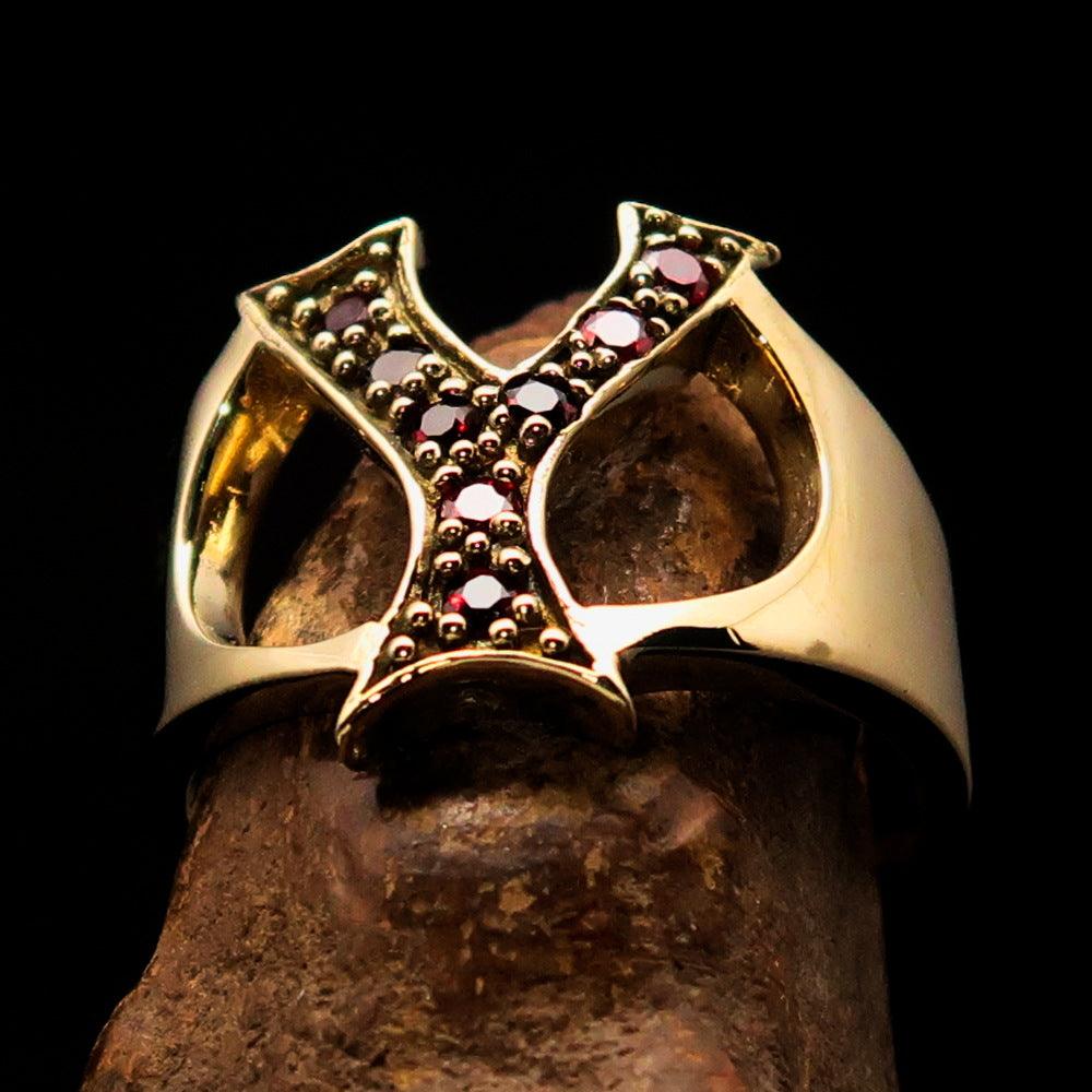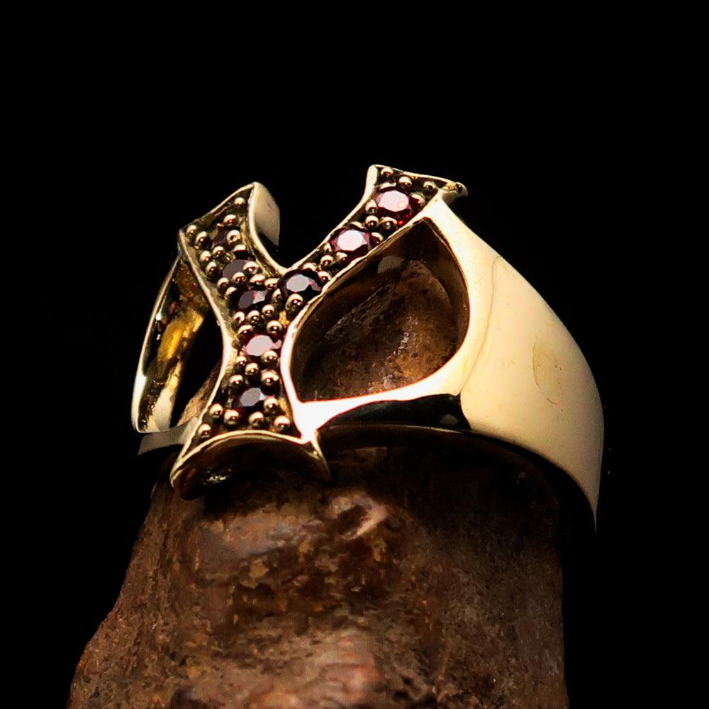 What sets this ring apart is the incorporation of 8 vibrant red Cubic Zirconias (CZ) that are meticulously set on the letter Y. These gemstones are known for their brilliance and clarity, providing a striking contrast against the polished brass. The red color symbolizes passion and energy, making this ring a perfect accessory for any occasion, whether it's a casual outing or a formal event.