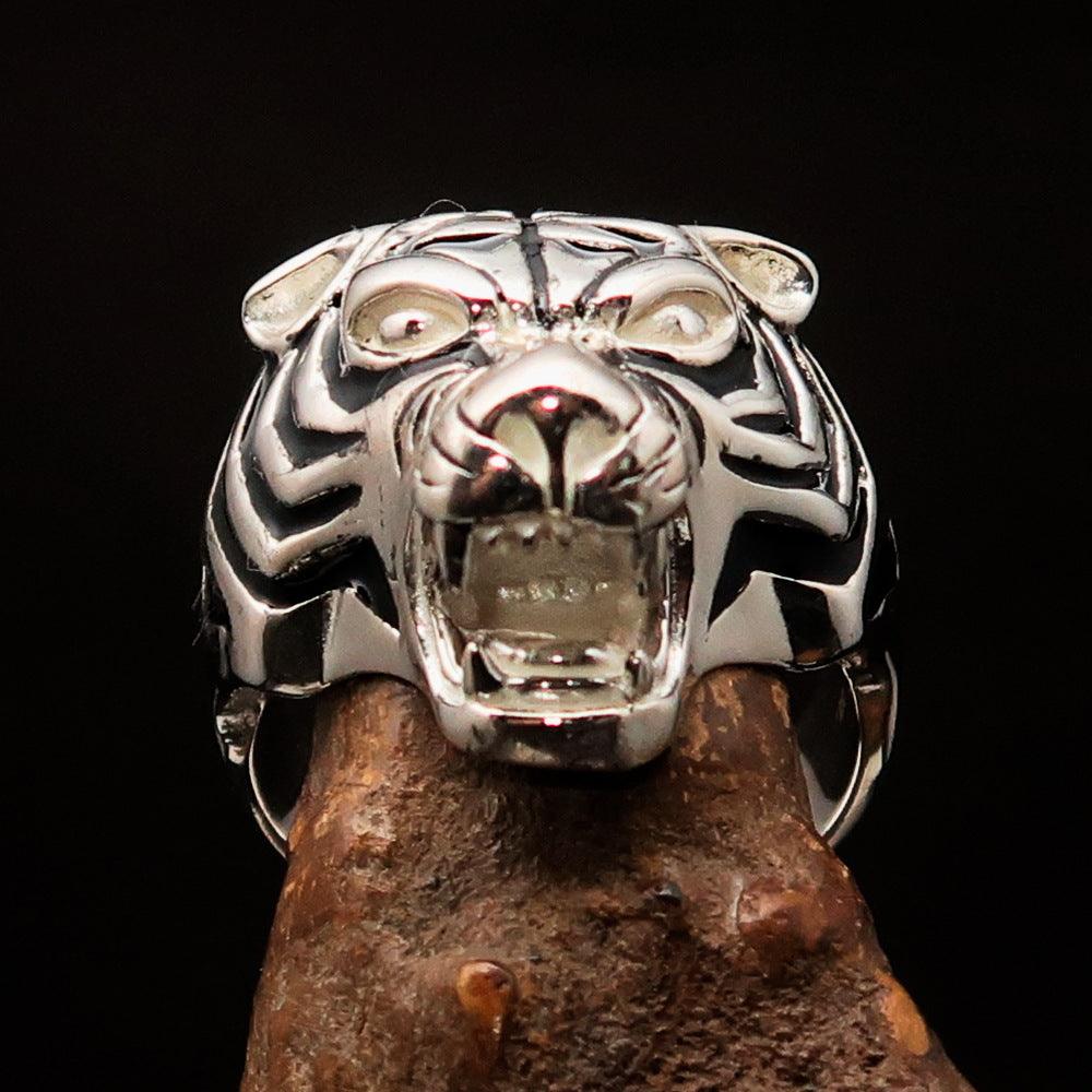 Introducing the Excellent crafted Men's Animal Ring black Male Tiger in Sterling Silver, a remarkable accessory designed for the modern man who appreciates both style and craftsmanship. This ring is not just a piece of jewelry; it is a statement of individuality and sophistication. Made from solid sterling silver, this ring showcases a stunning black enamel design that captures the essence of the majestic tiger, making it a unique addition to any collection.