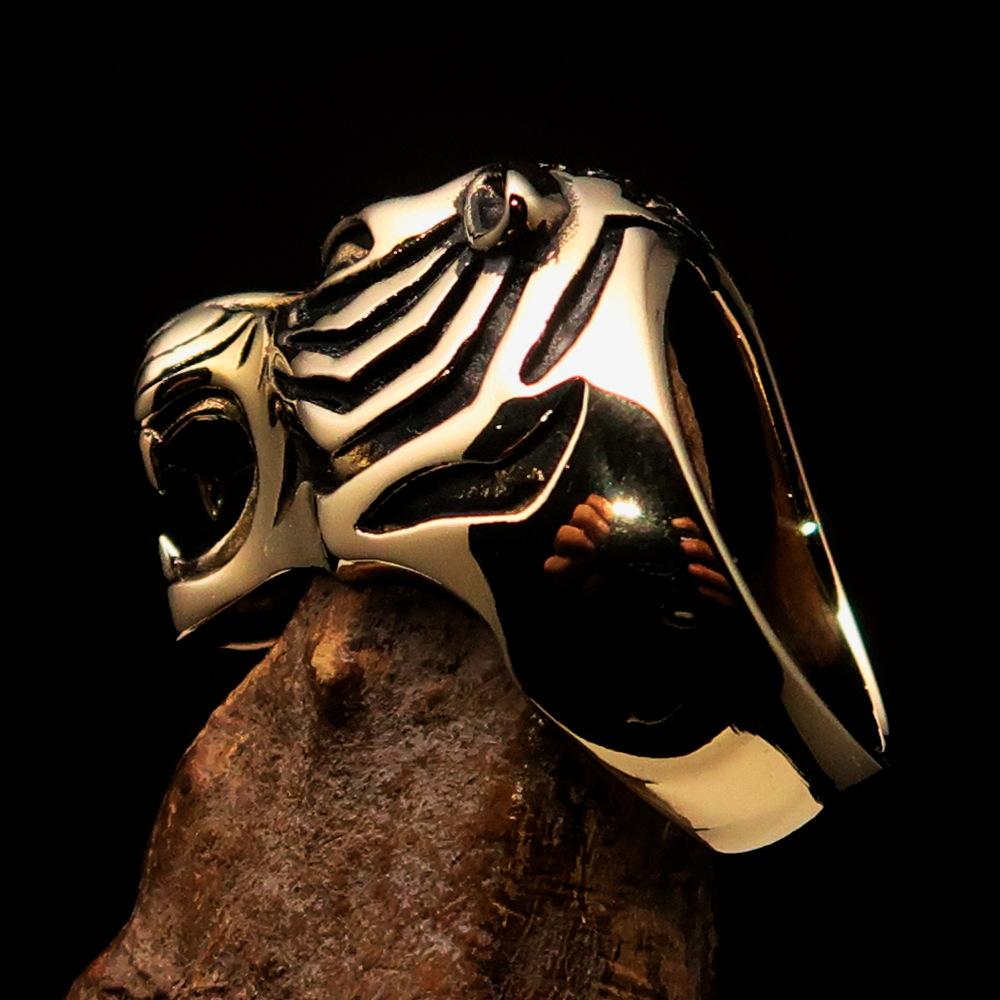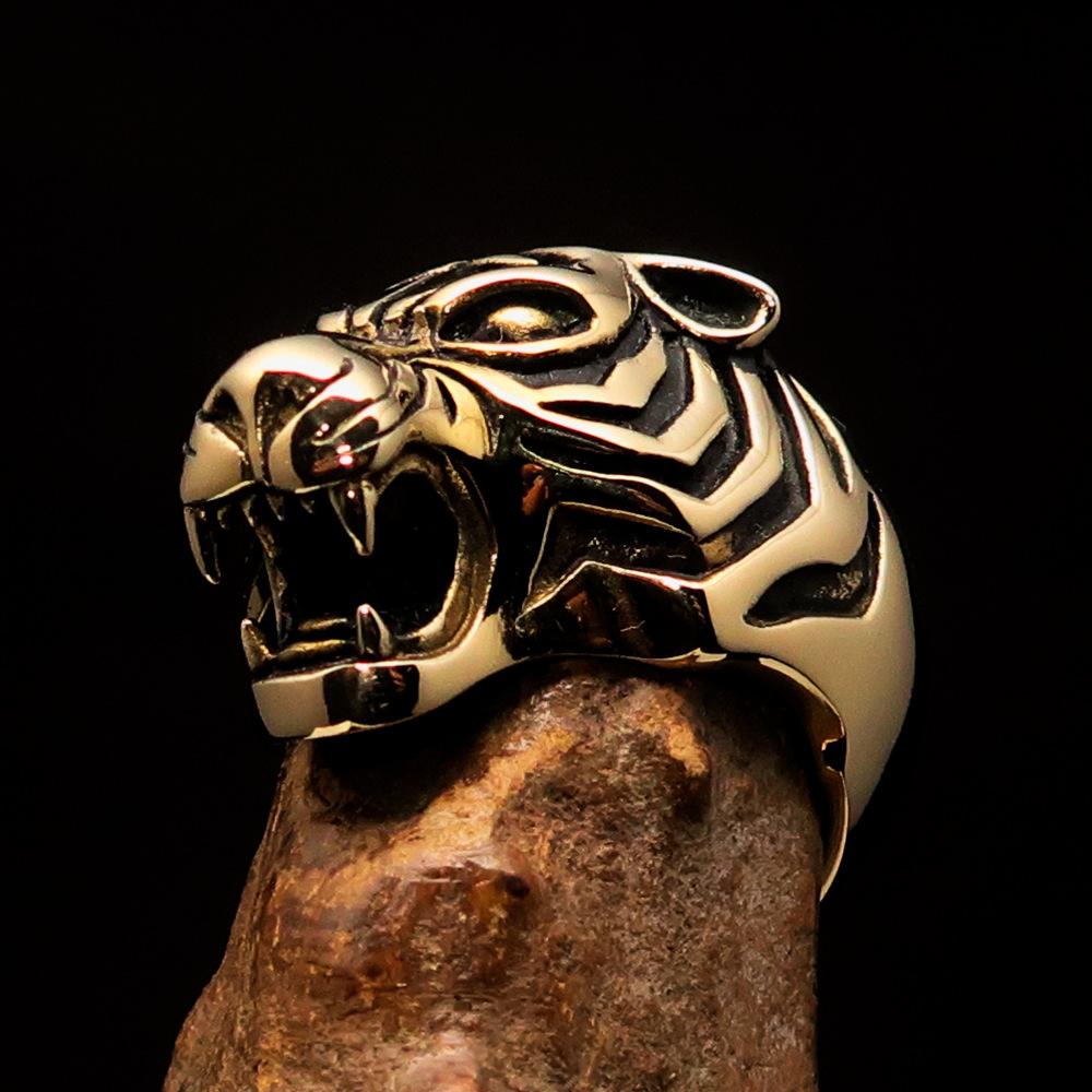 Introducing the Excellent Crafted Men's Animal Ring Male Tiger Antiqued in Brass, the ultimate accessory for the modern man. This exquisite ring showcases a striking male tiger design, symbolizing strength and courage. Made from solid brass, this ring not only offers durability but also a unique aesthetic appeal that sets it apart from ordinary jewelry.