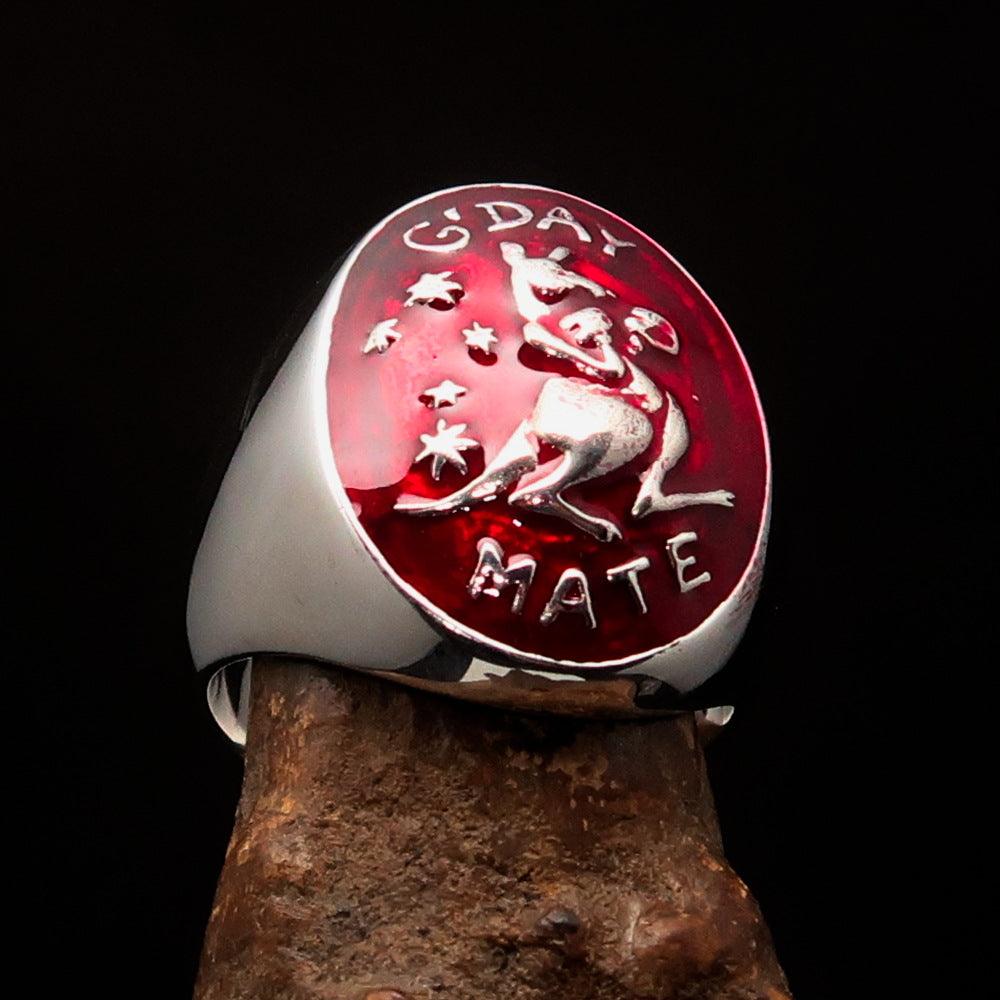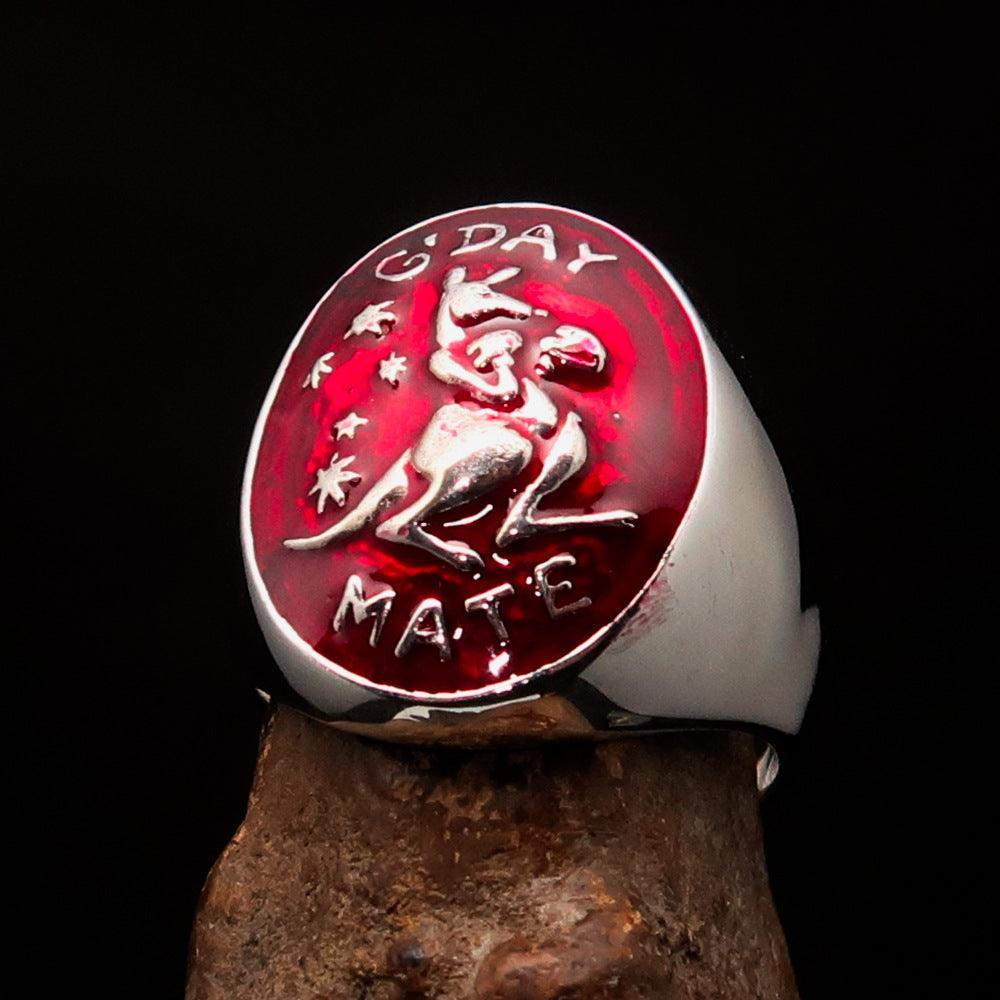 Men's Aussie Ring made of sterling silver featuring a red boxing kangaroo design, polished with enamel for a shiny finish.
