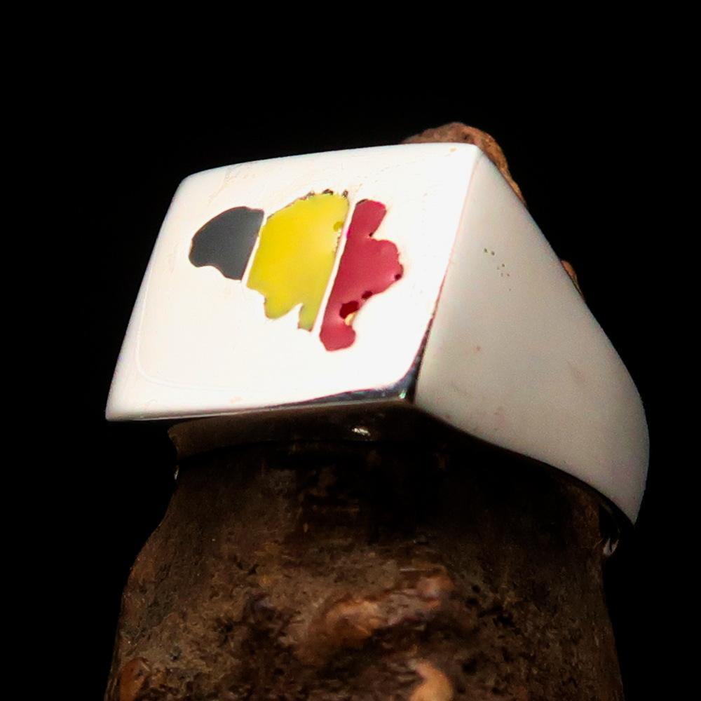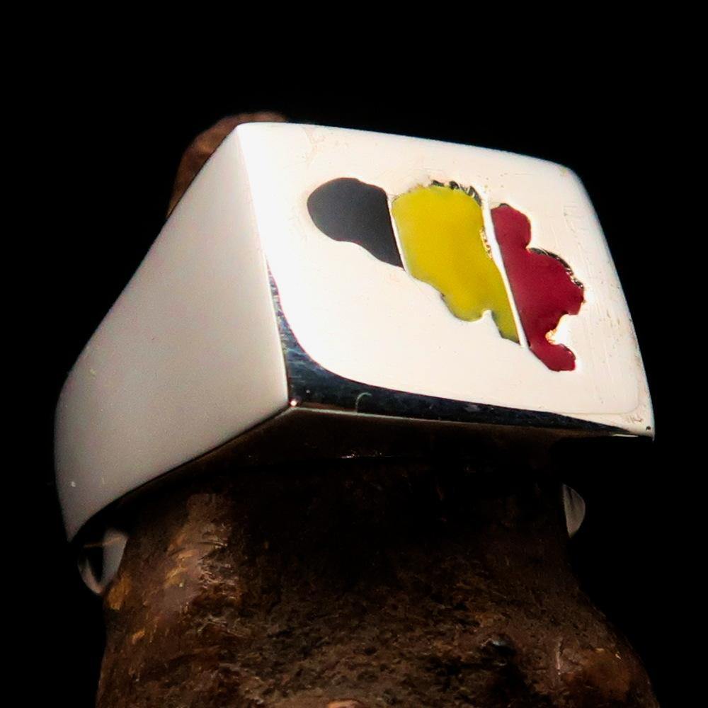 Introducing the stunning Men's Belgian Flag Ring, a perfect blend of elegance and national pride. Crafted from high-quality sterling silver, this ring showcases a beautifully high-polished finish that enhances its aesthetic appeal. The ring is adorned with the vibrant colors of the Belgian flag, making it a unique accessory for anyone who wishes to celebrate their heritage or show support for Belgium.