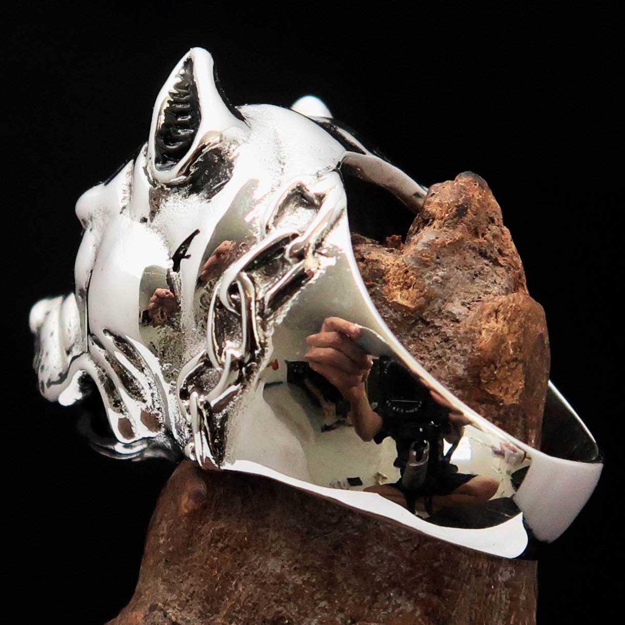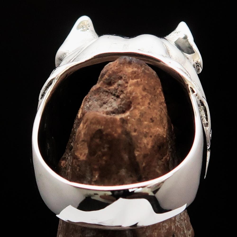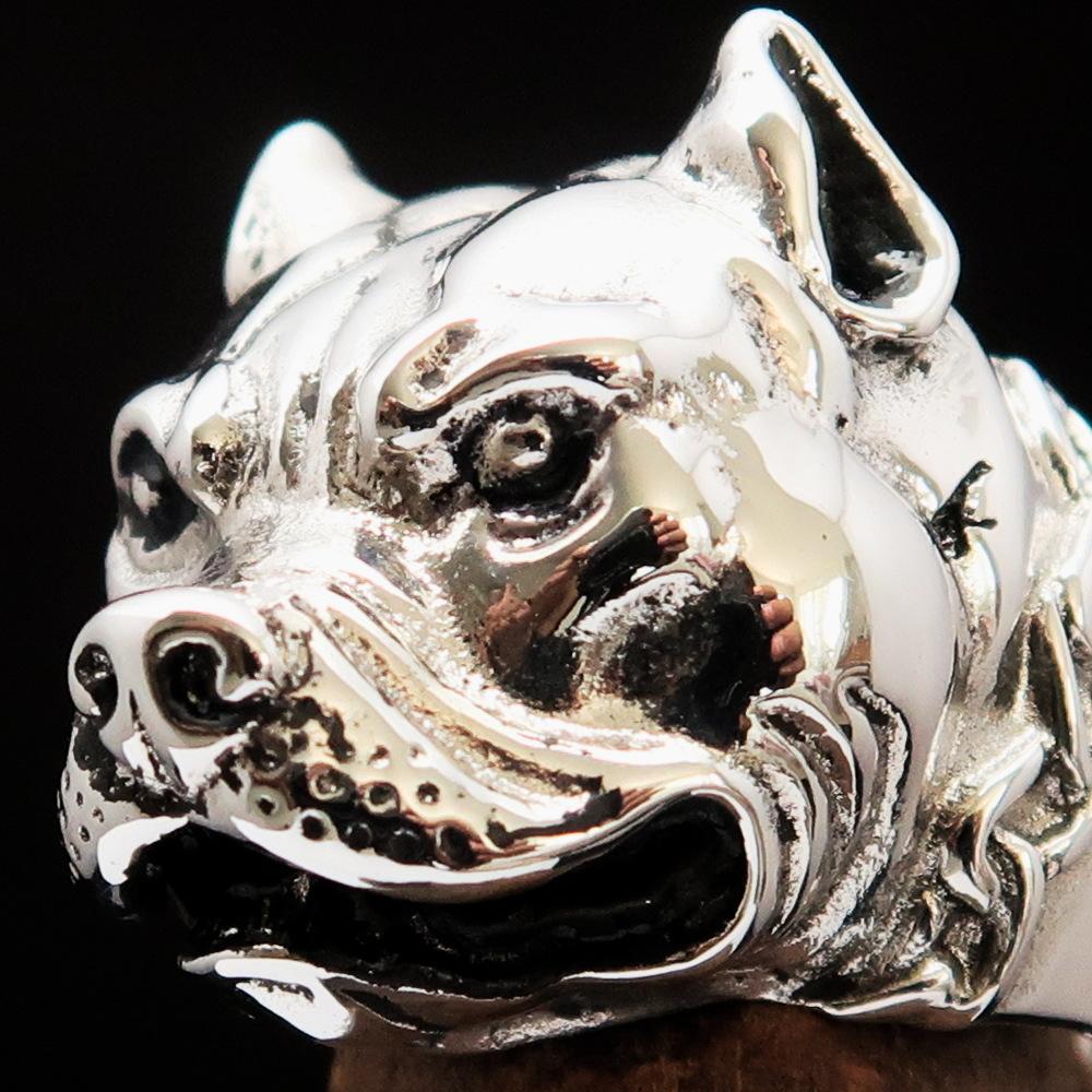 Crafted from solid sterling silver, this ring is not only visually appealing but also durable and long-lasting. The high polish and antiqued finishes enhance the intricate details of the pitbull in chains design, giving it a unique and edgy look that stands out in any collection. The ring is hallmarked with 925, ensuring its authenticity and quality, so you can wear it with confidence.