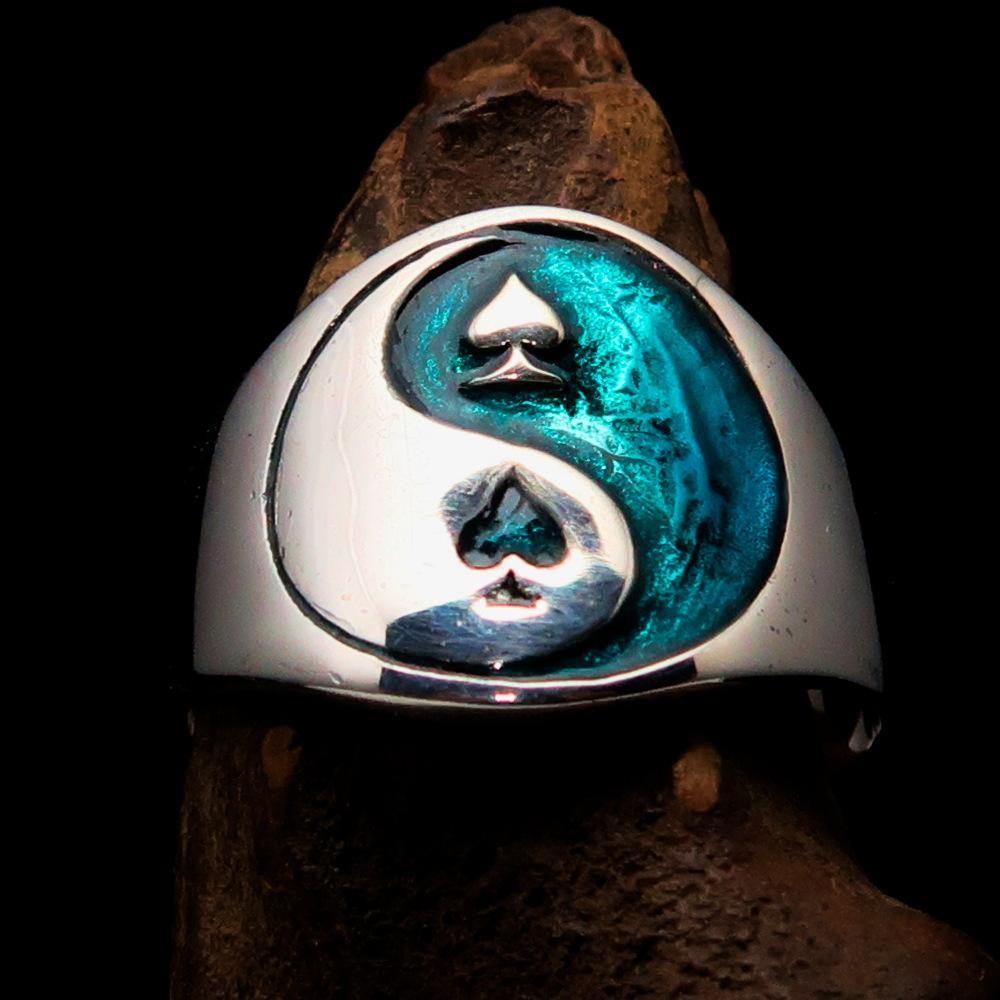 The ring features a captivating Yin Yang design, symbolizing balance and harmony. The blue spades add a playful touch, making it an ideal choice for those who appreciate both elegance and fun. Whether you're at the poker table or out on the town, this ring is sure to draw attention and spark conversations.