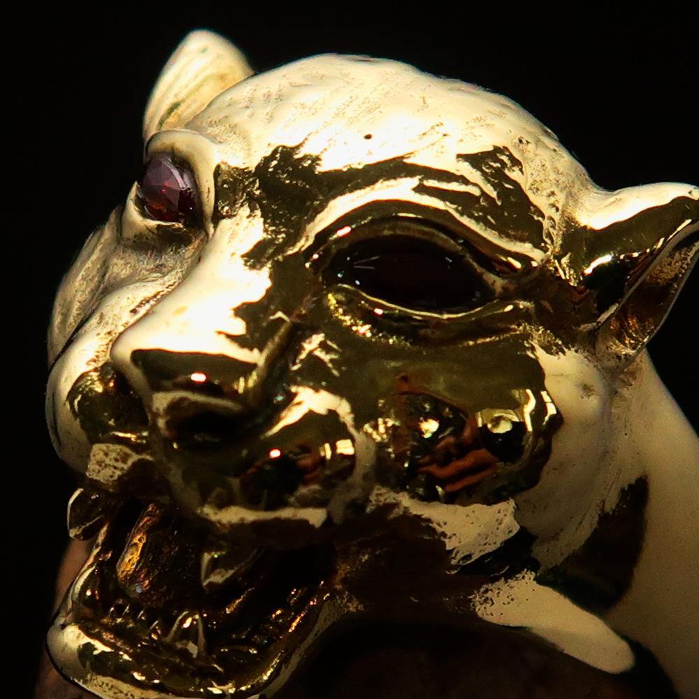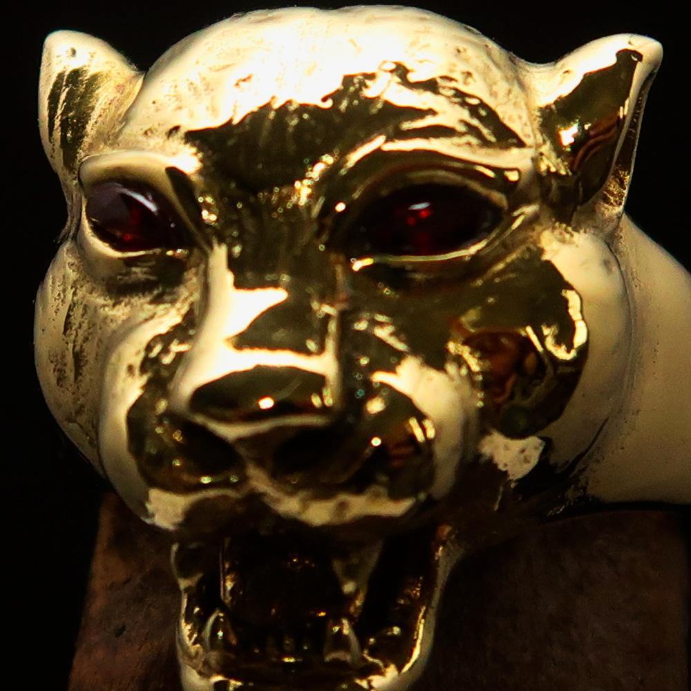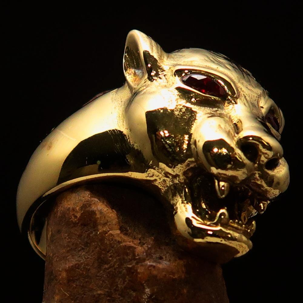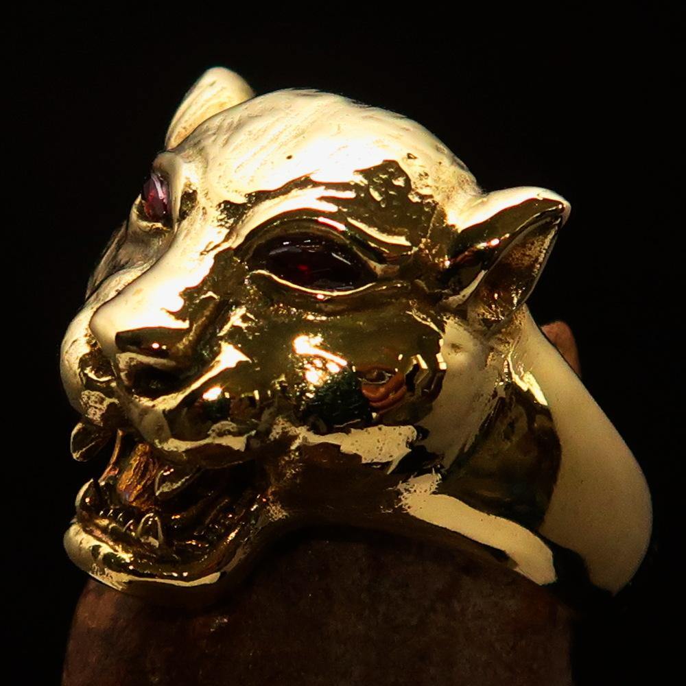 The craftsmanship of this ring is exceptional, showcasing the artistry involved in creating such a detailed piece. The cougar, a symbol of strength and courage, is intricately designed to capture its fierce essence. The red cubic zirconia eyes, measuring 4 mm x 2 mm in a marquise cut, provide a stunning contrast against the brass, making the ring stand out beautifully.