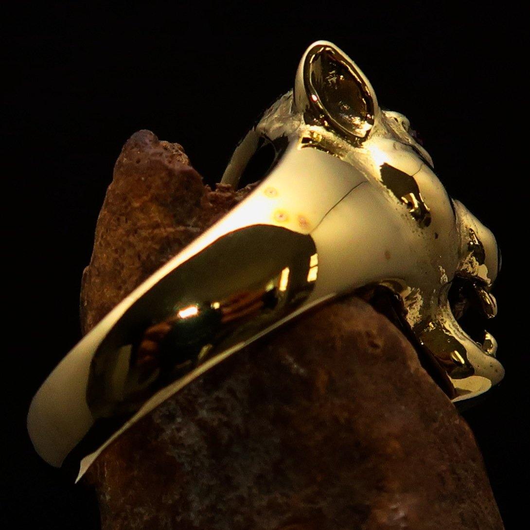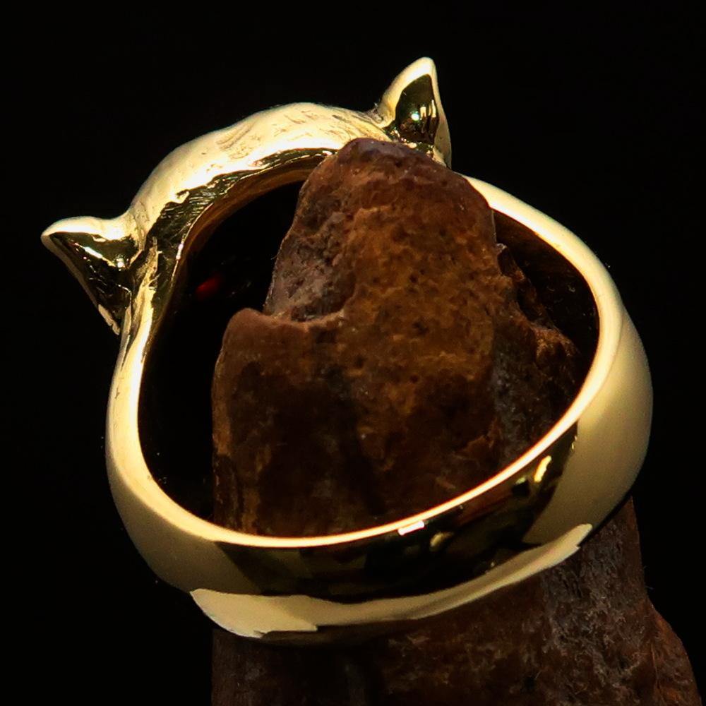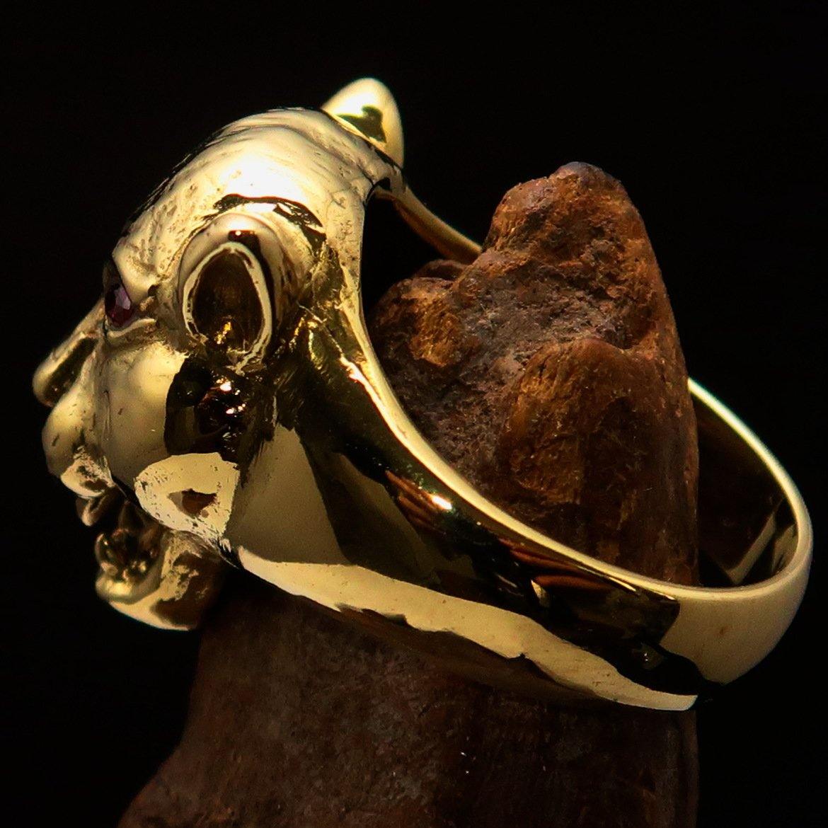 The craftsmanship of this ring is exceptional, showcasing the artistry involved in creating such a detailed piece. The cougar, a symbol of strength and courage, is intricately designed to capture its fierce essence. The red cubic zirconia eyes, measuring 4 mm x 2 mm in a marquise cut, provide a stunning contrast against the brass, making the ring stand out beautifully.