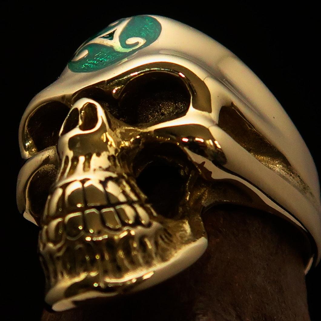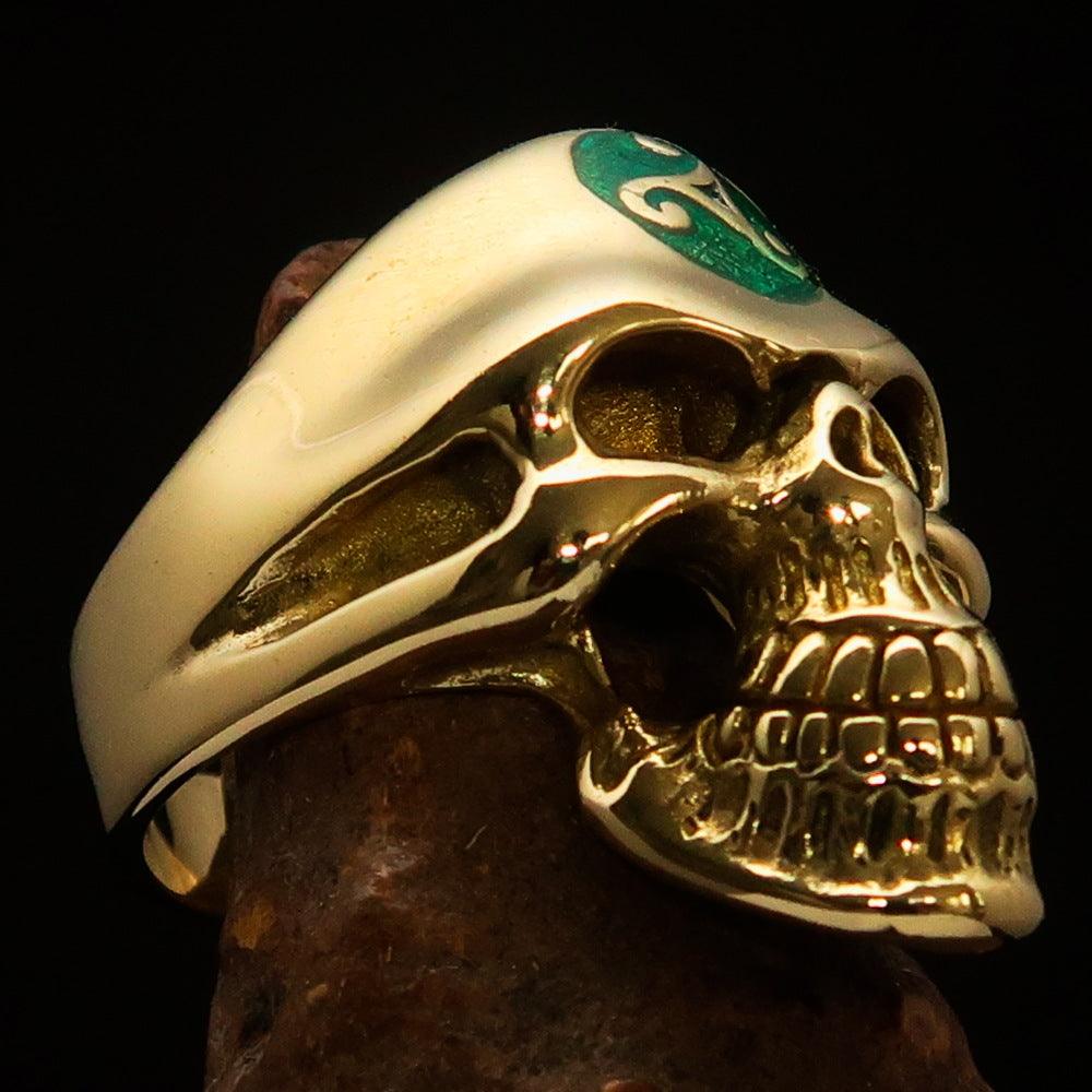 Men's Celtic Triskelia Triad Skull Ring made of solid brass with green enamel finish, showcasing intricate Celtic design.