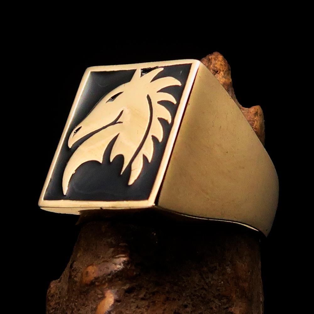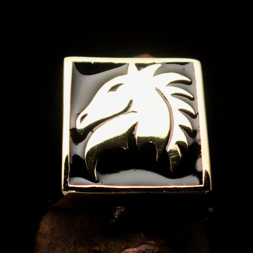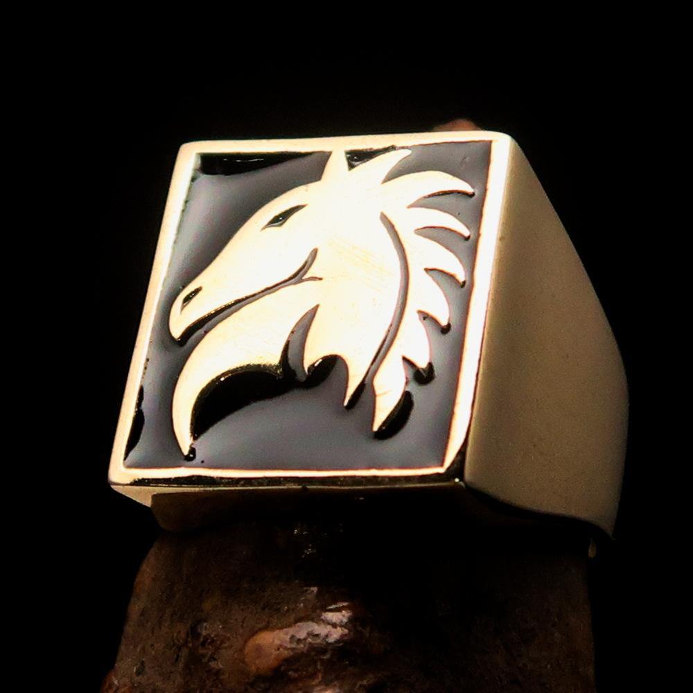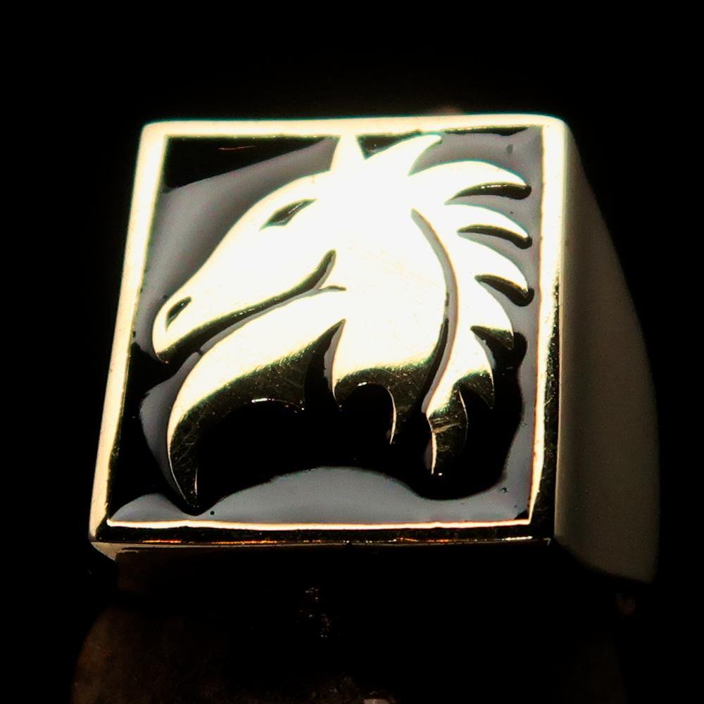 Men's Chess Ring featuring a Black Horse Head design, crafted from solid brass with a high polished finish and enamel coating.