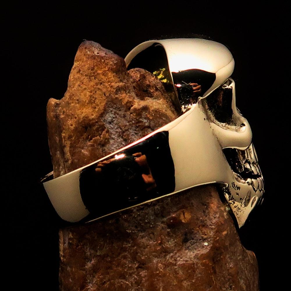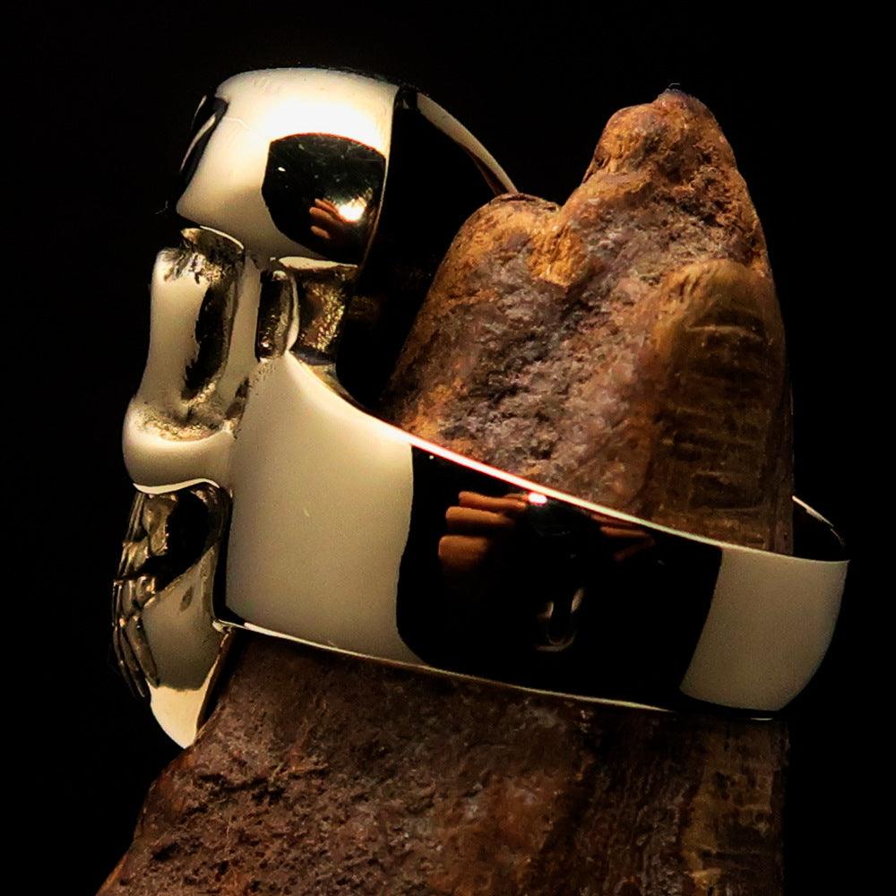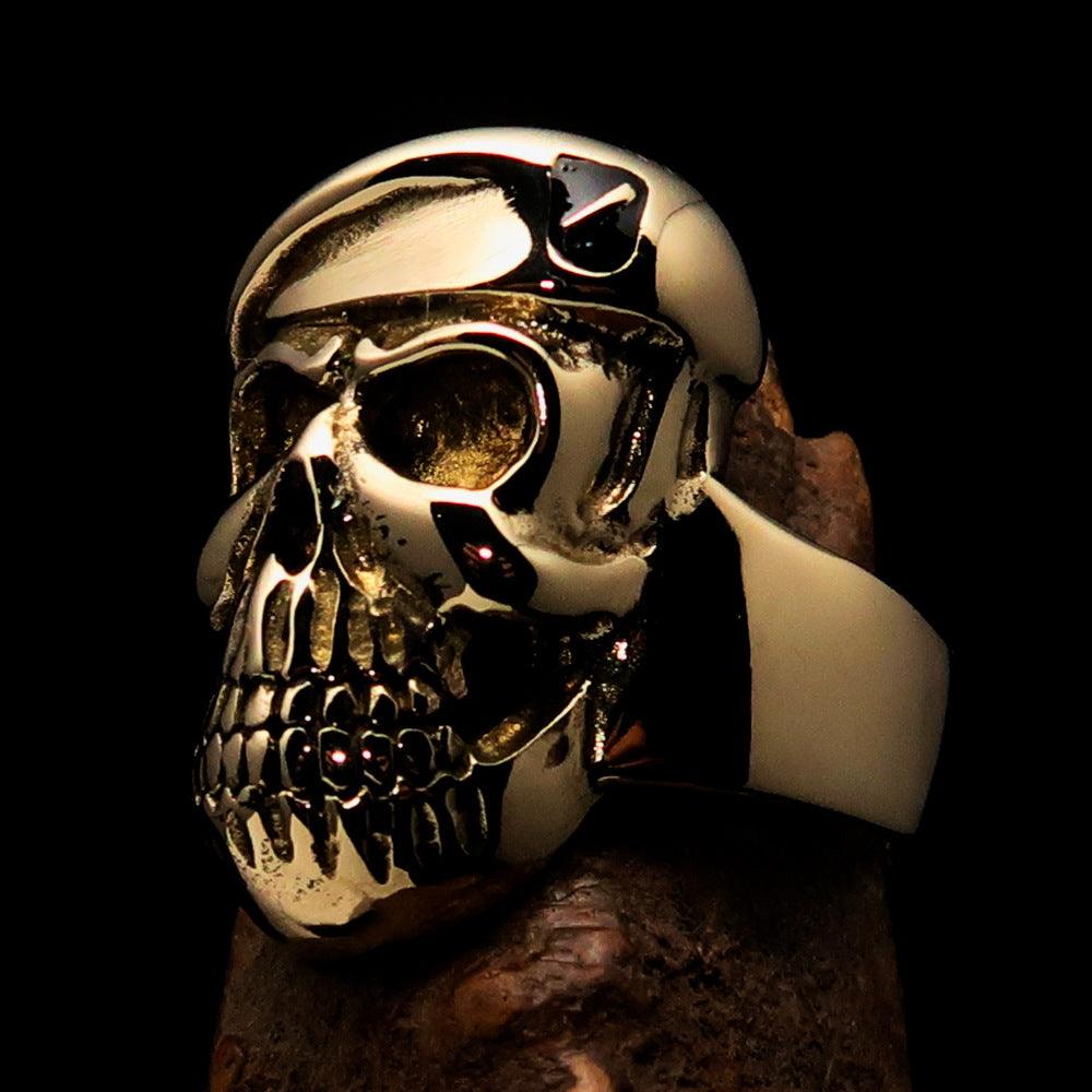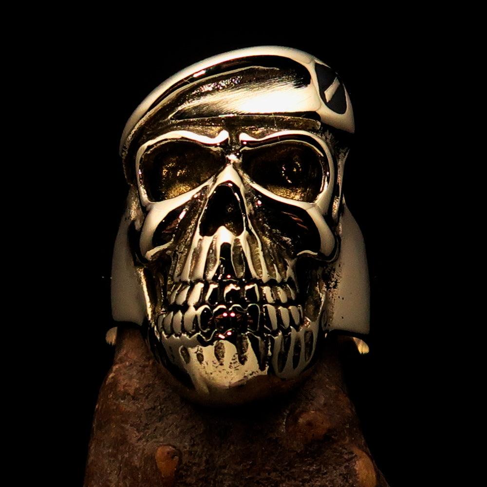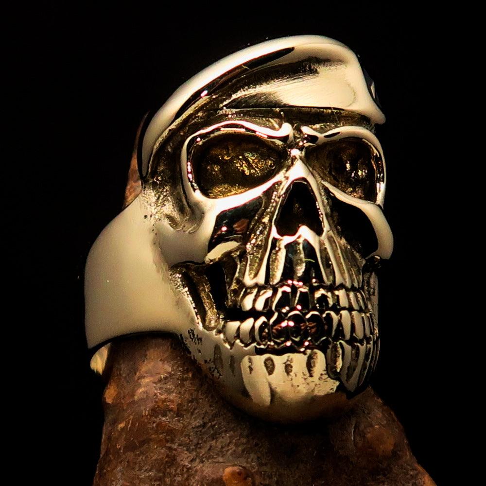 Solid brass men's army skull ring with antiqued and polished finish, showcasing intricate skull design.