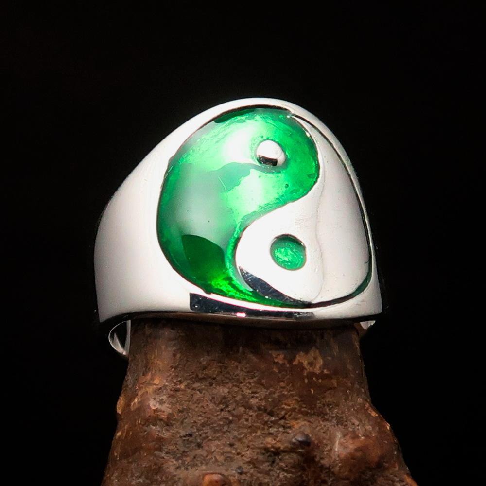 Men's sterling silver Yin Yang ring with green enamel, showcasing a polished finish and intricate design.