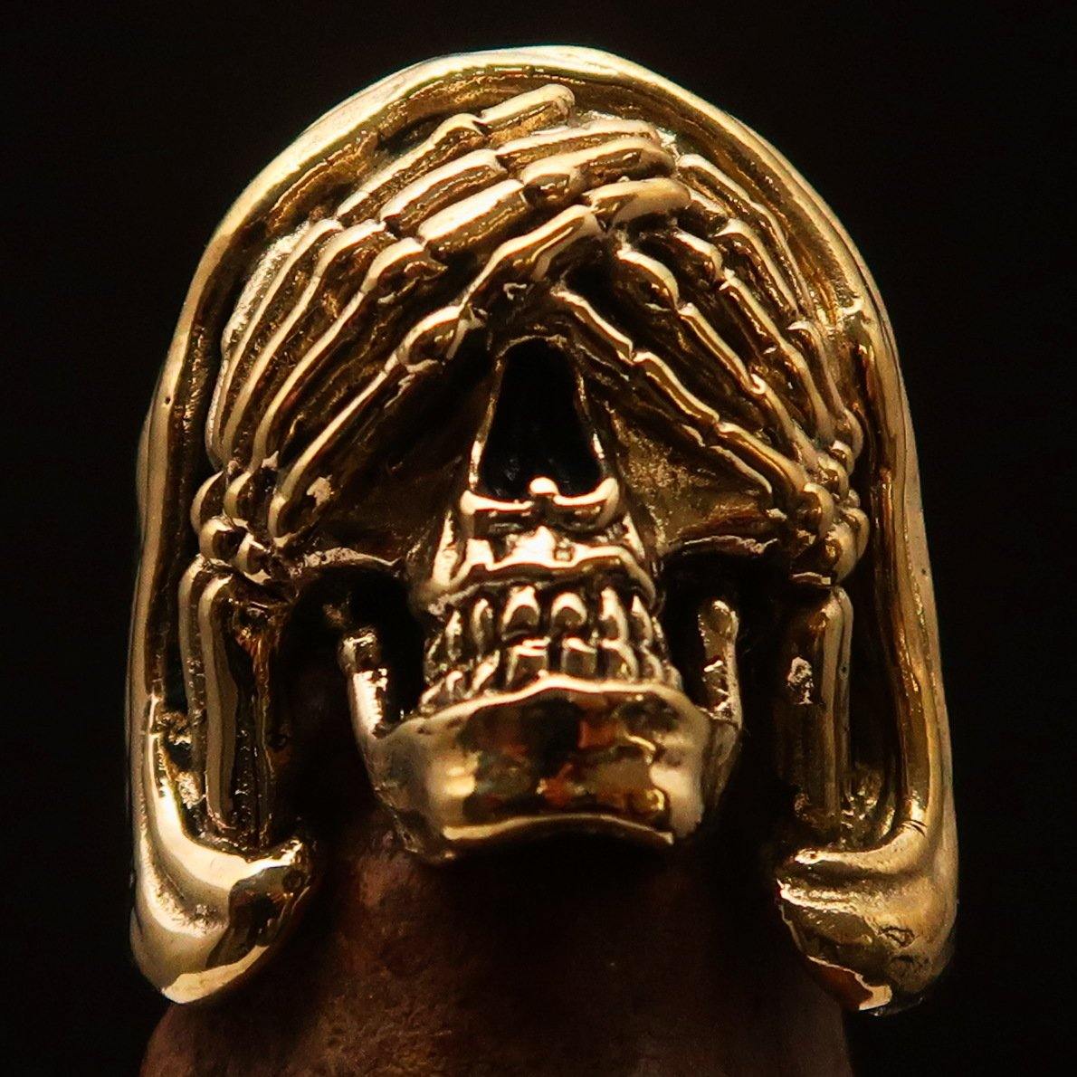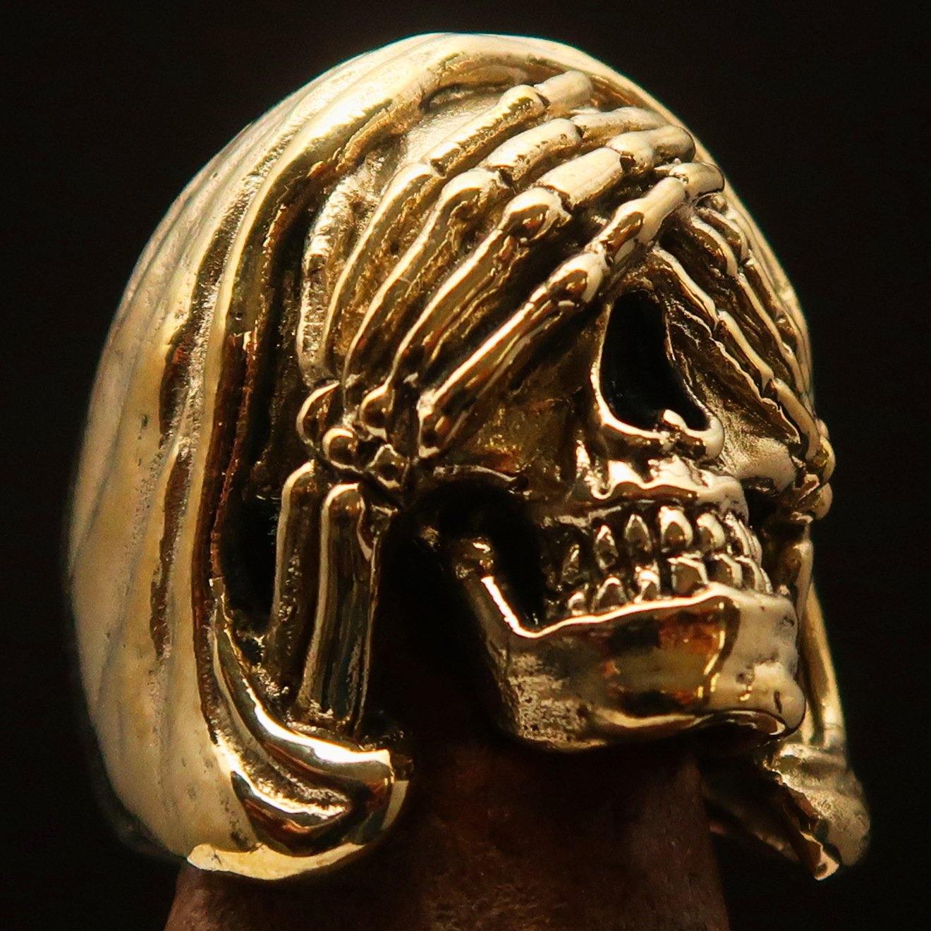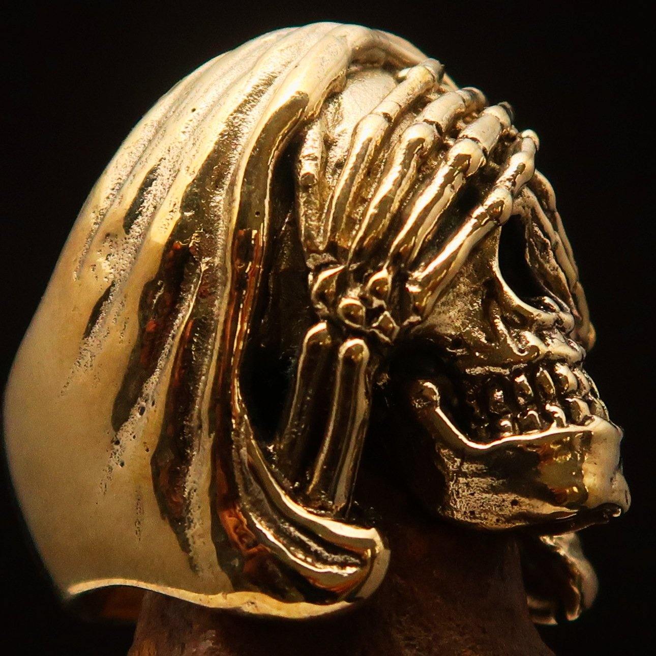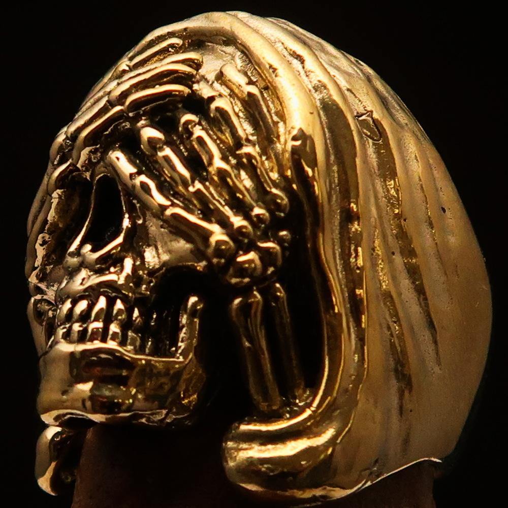 Men's Grim Reaper Skull Ring made of solid brass with high polished and antiqued finish, showcasing intricate skull design.