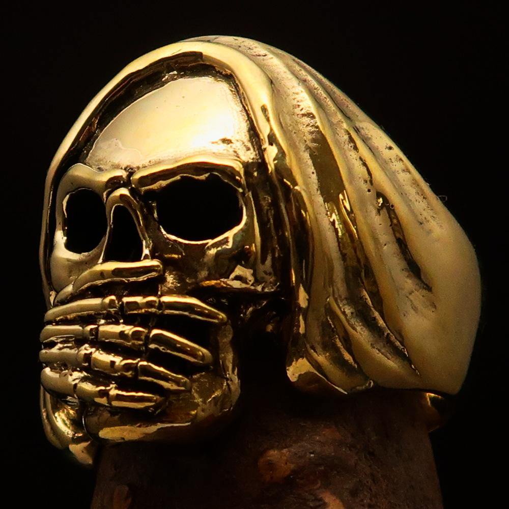 Men's Grim Reaper Skull Ring made of solid brass with high polished and antiqued finish, showcasing intricate skull design.