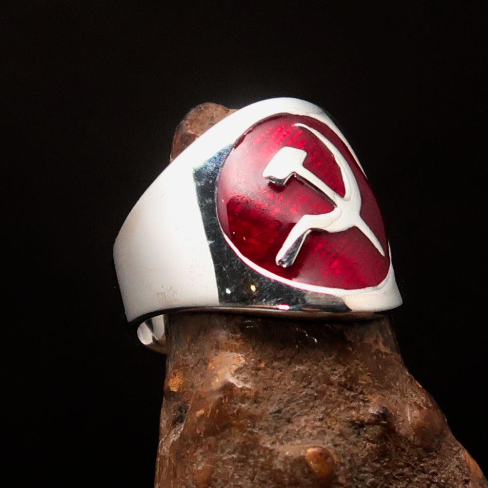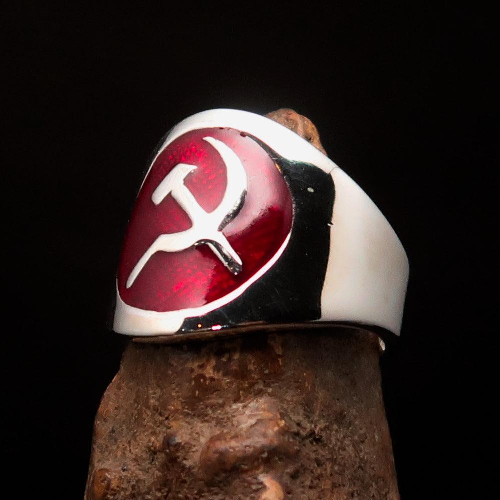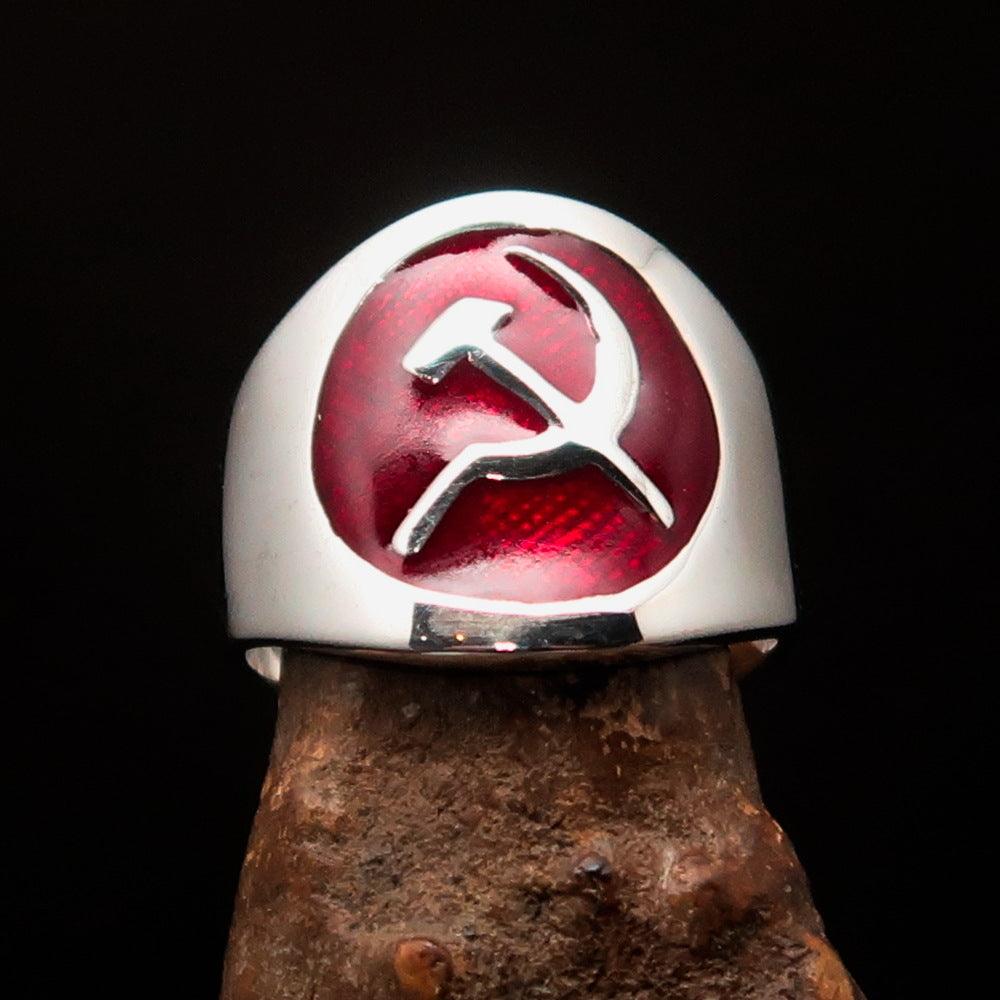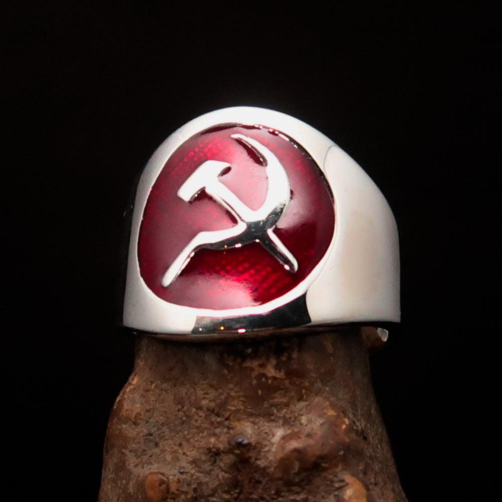 In summary, the Men's Hammer and Sickle Crest Ring in red is a remarkable piece of jewelry that combines quality, style, and versatility. With its solid sterling silver construction, vibrant enamel design, and customizable sizing options, it is the perfect addition to any man's accessory collection. Shop now and experience the elegance and craftsmanship of this unique ring.