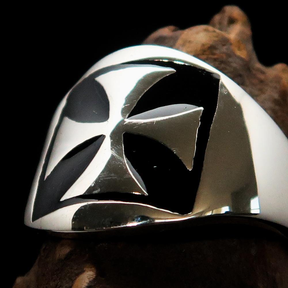 Introducing the Excellent Crafted Men's Iron Cross Biker Ring in Black, made from high-quality solid sterling silver. This striking ring features a polished finish with a bold black enamel design, making it a perfect accessory for bikers and anyone who appreciates unique jewelry. The ring is hallmarked 925, ensuring its authenticity and quality, so you can wear it with confidence.