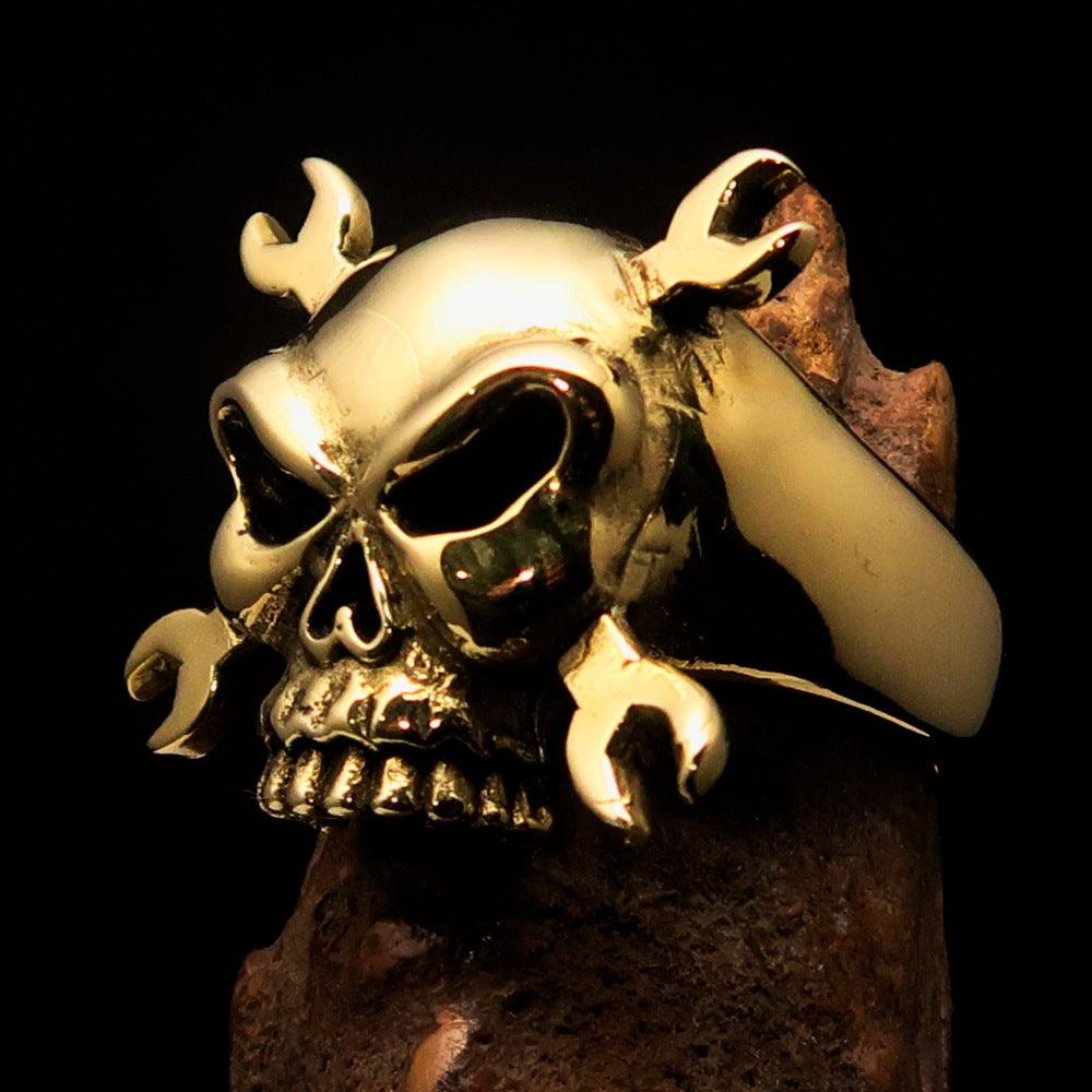The wrench skull design is not only unique but also symbolizes strength and resilience, making it a perfect gift for mechanics, engineers, or anyone who appreciates a rugged aesthetic. The solid brass material ensures that the ring will withstand the test of time, while the high polished finish gives it a sophisticated look. Whether you're wearing it to work or out on the town, this ring is sure to make a statement.