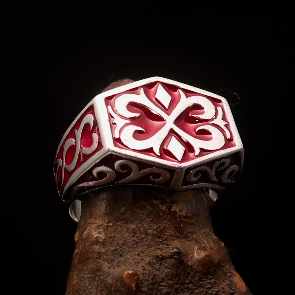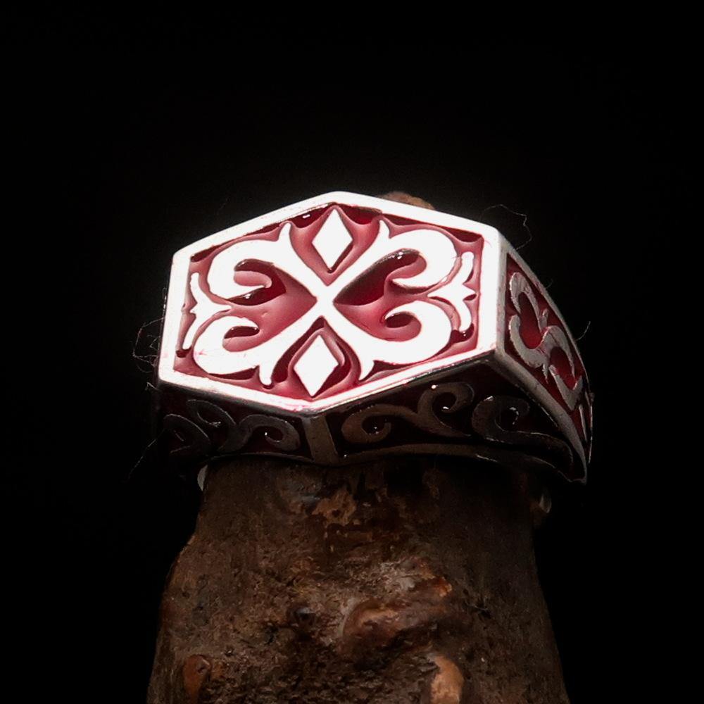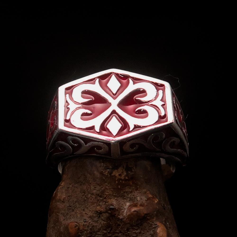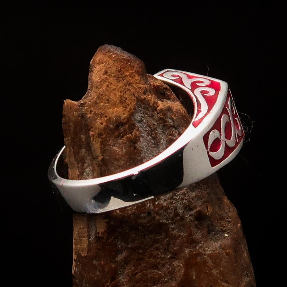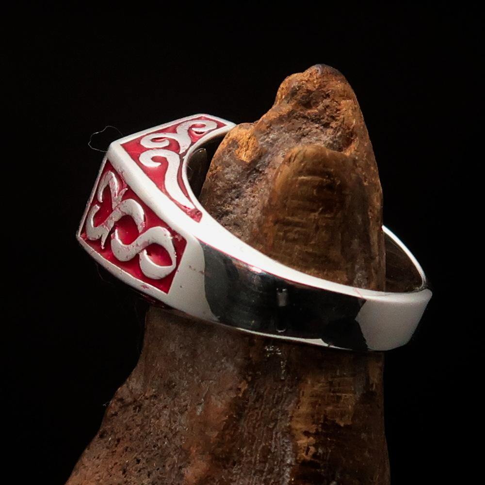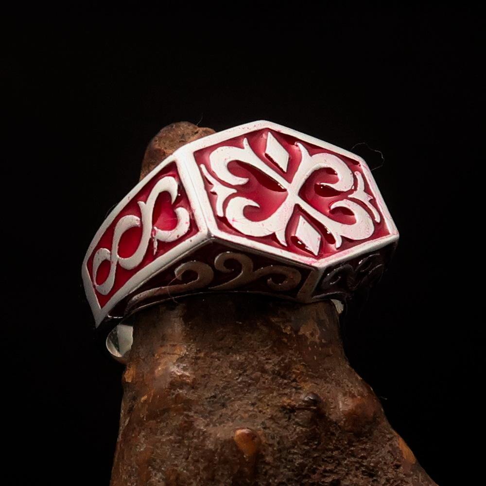 Introducing the Excellent Crafted Men's Medieval Ring featuring a striking red Oriental Crest, meticulously designed for those who appreciate fine jewelry. This ring is made from solid sterling silver, ensuring durability and a luxurious feel. The high-polished finish enhances its elegance, making it a perfect accessory for both casual and formal occasions.