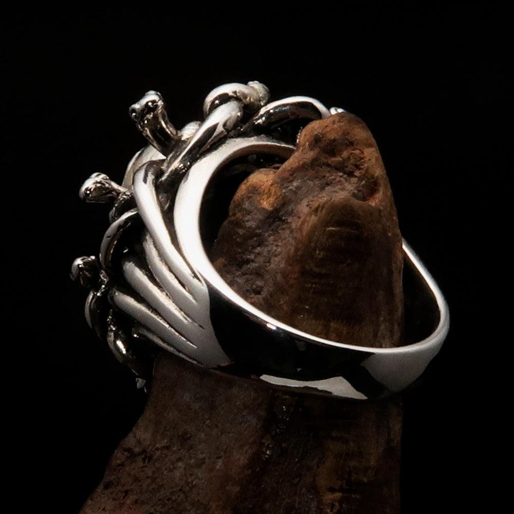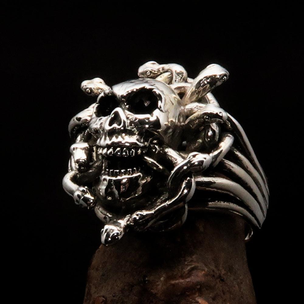 Men's Medusa Head Skull Ring made of antiqued sterling silver, featuring intricate snake designs and a polished finish.
