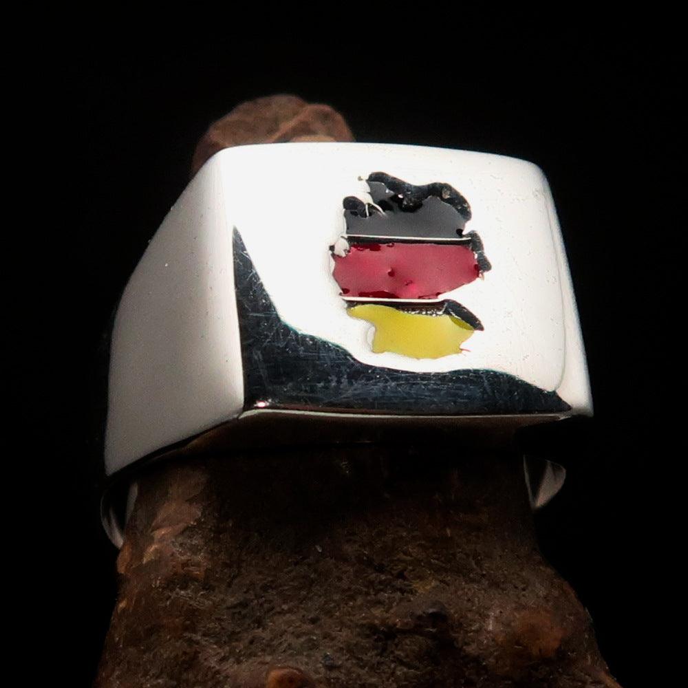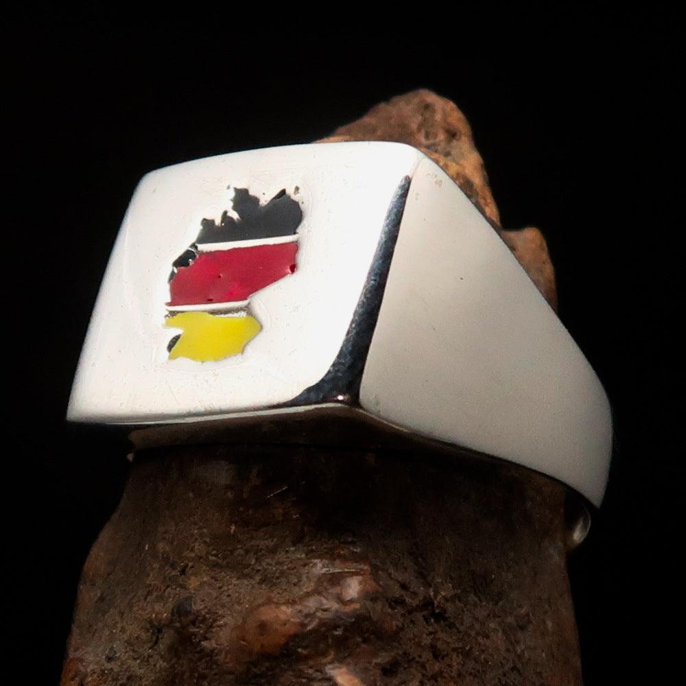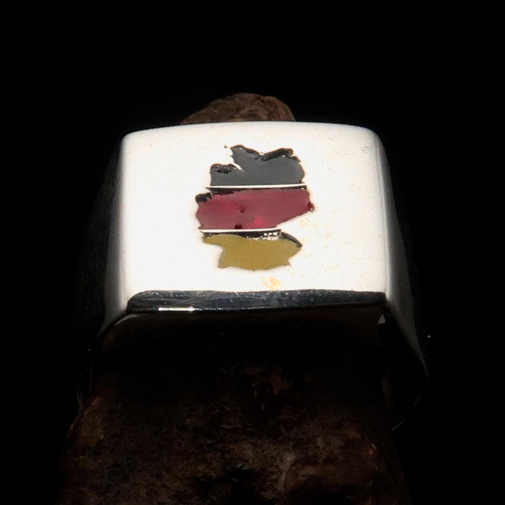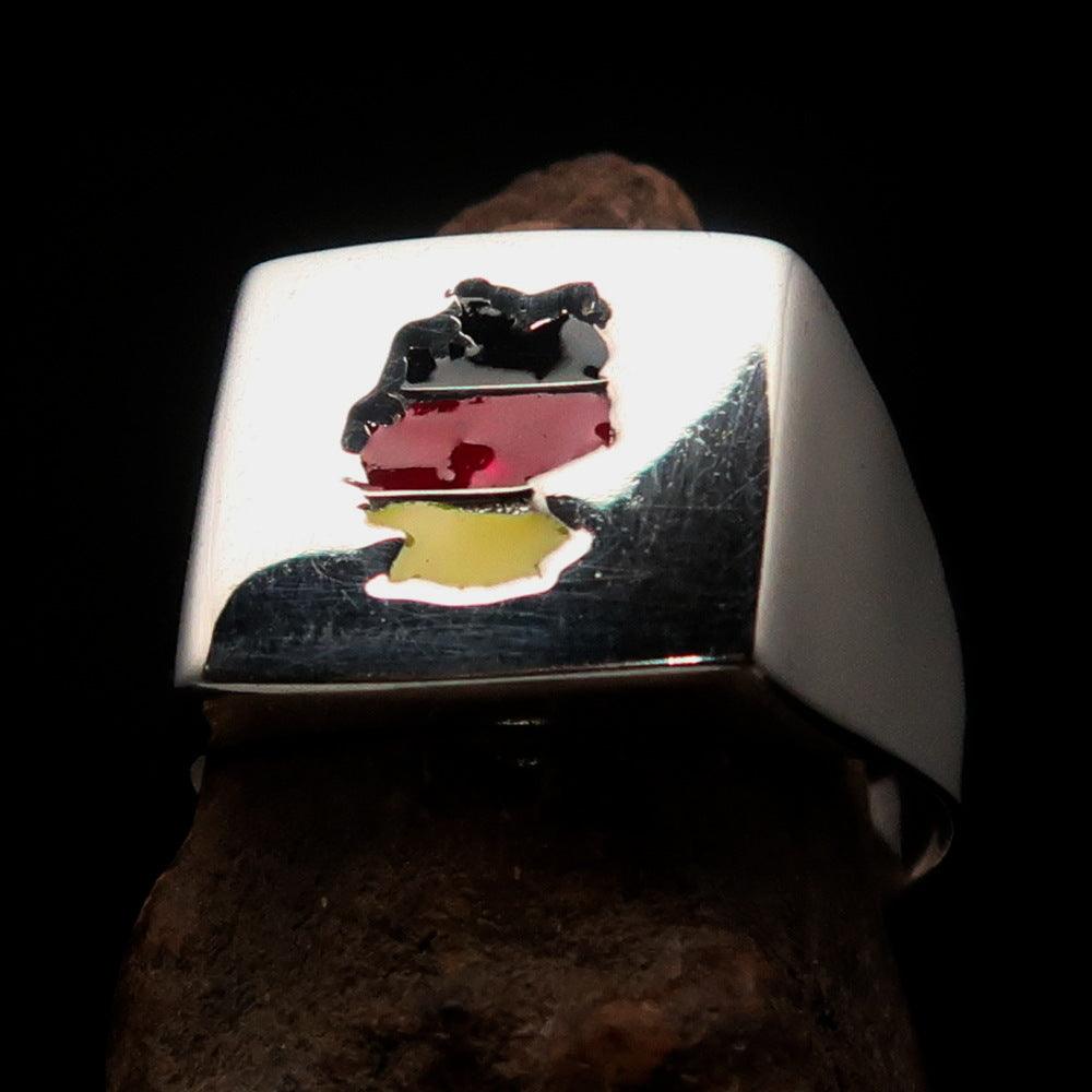 Introducing the beautifully crafted Men's National Flag Ring Germany, a stunning piece of jewelry that showcases your pride in Germany. Made from high-quality sterling silver, this ring features a high polish finish that enhances its elegance and charm. The ring is adorned with vibrant enamel that represents the national flag of Germany, making it a perfect accessory for any occasion.