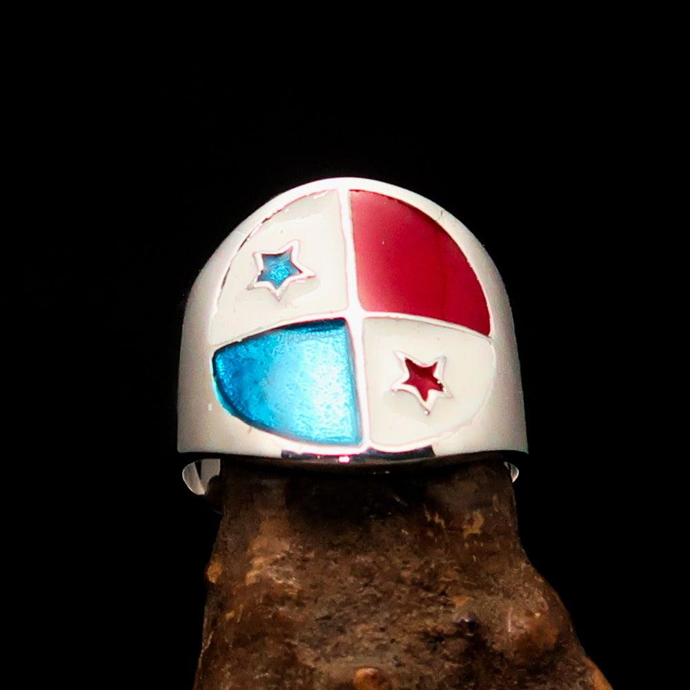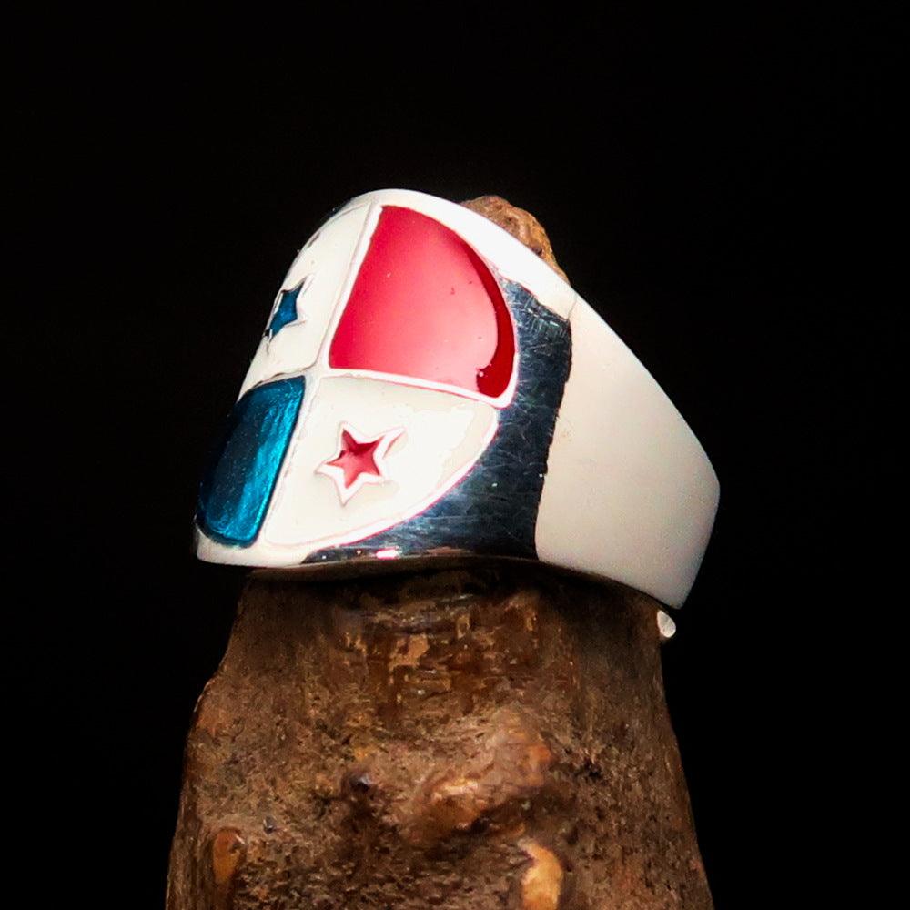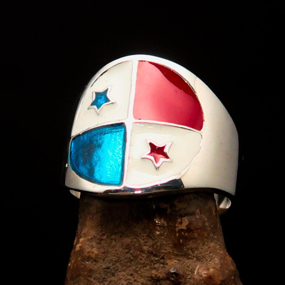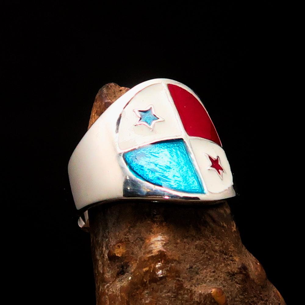 Introducing the exquisite Men's National Flag Ring Panama, a stunning piece of jewelry that combines patriotism with elegance. Crafted from high-quality sterling silver, this ring features a high-polished finish that enhances its beauty and durability. The vibrant enamel detailing showcases the national flag, making it a perfect accessory for those who wish to express their pride and love for their country.