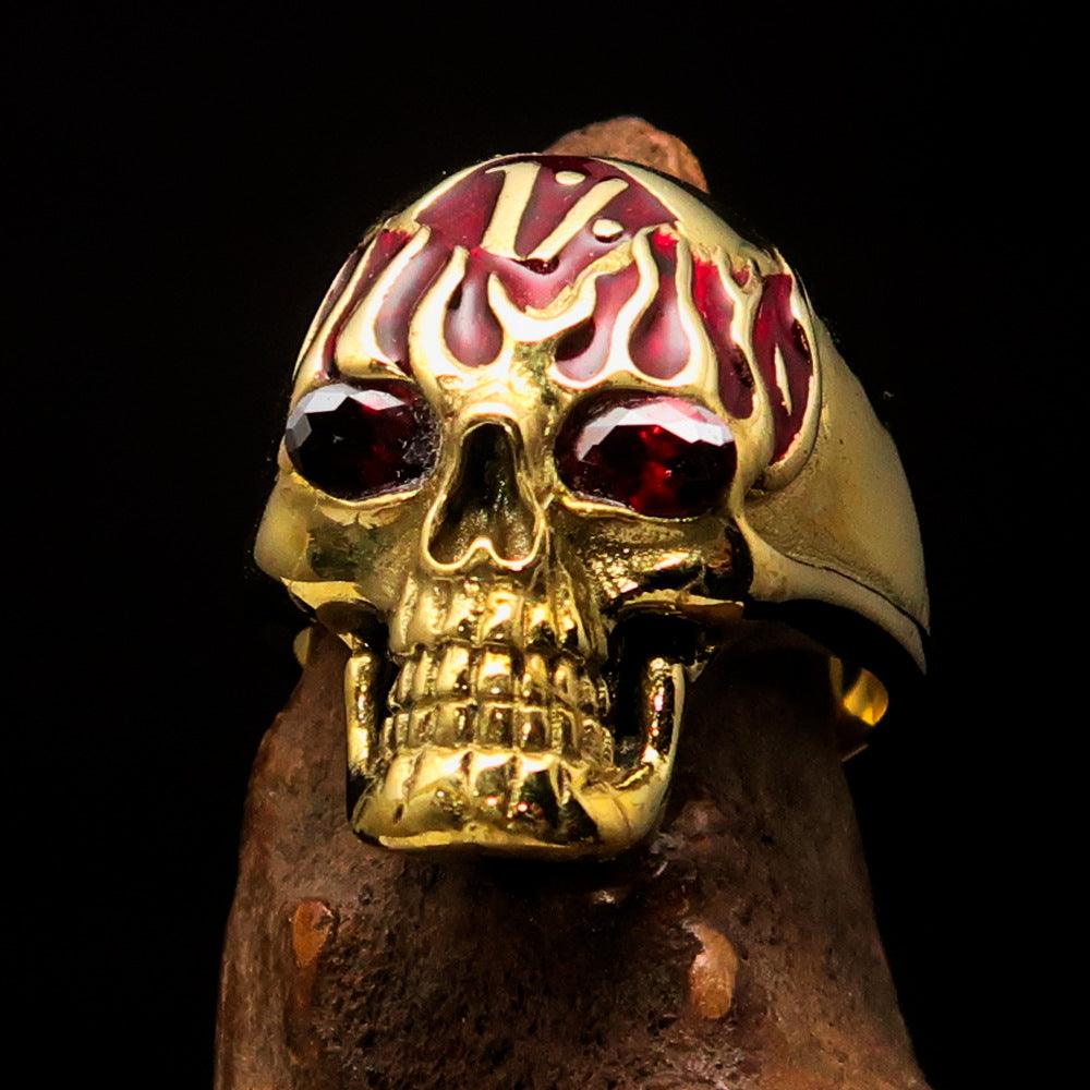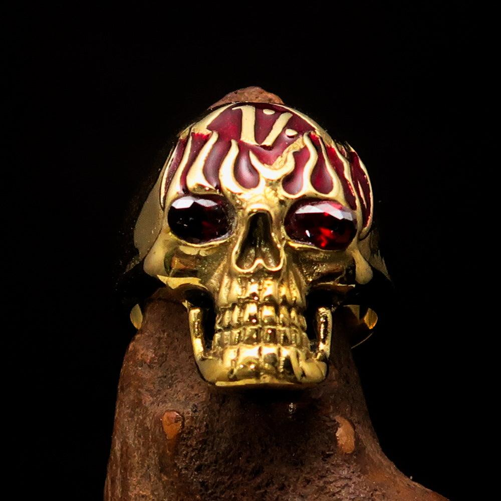 The standout feature of this ring is its eye-catching flaming skull design, which is complemented by vibrant red enamel. The skull symbolizes rebellion and strength, making it an ideal accessory for bikers and anyone who appreciates edgy fashion. The eyes of the skull are adorned with red cubic zirconias, measuring 6 mm x 4 mm, adding a touch of sparkle and intensity to the overall look.