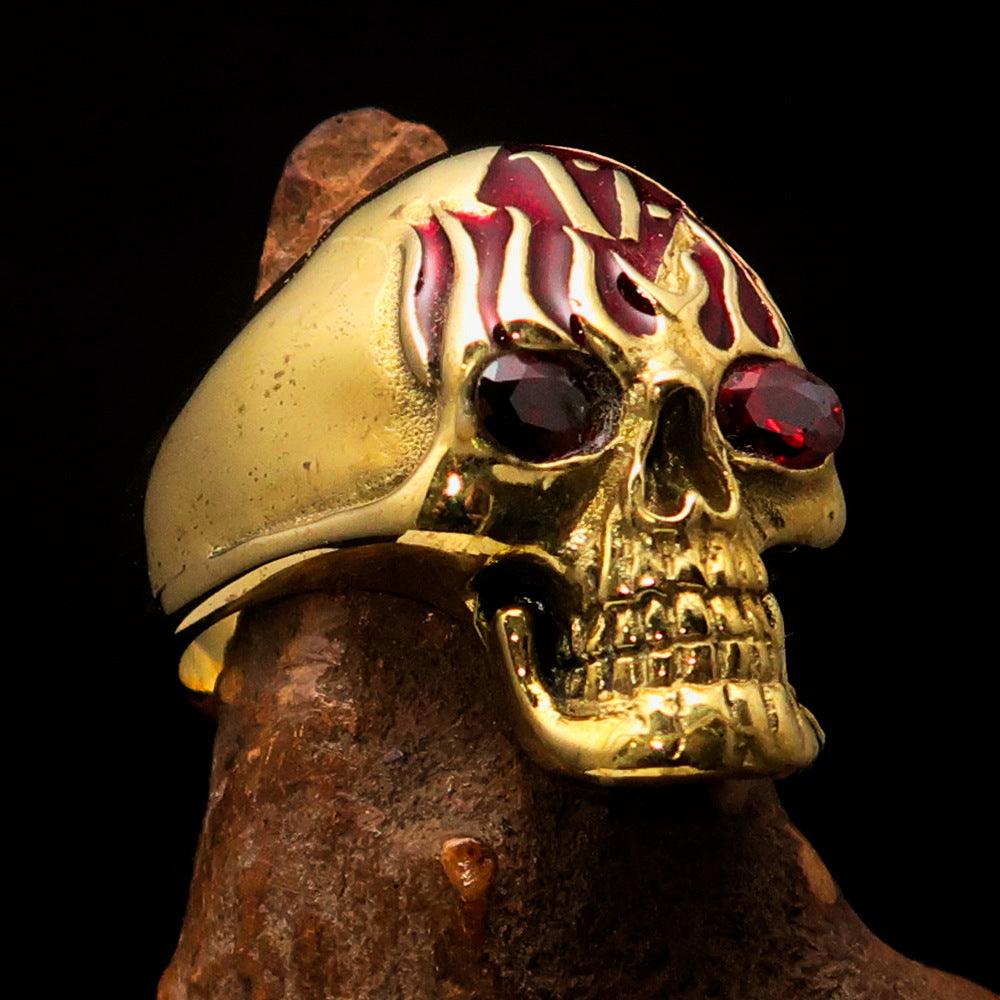 Introducing the Men's 1% Flaming Skull Outlaw Ring, a stunning piece of jewelry that combines bold design with exceptional craftsmanship. This ring is perfect for those who embrace the outlaw spirit and want to make a statement. Made from solid brass, this ring is not only durable but also features a mirror-polished finish that enhances its striking appearance.