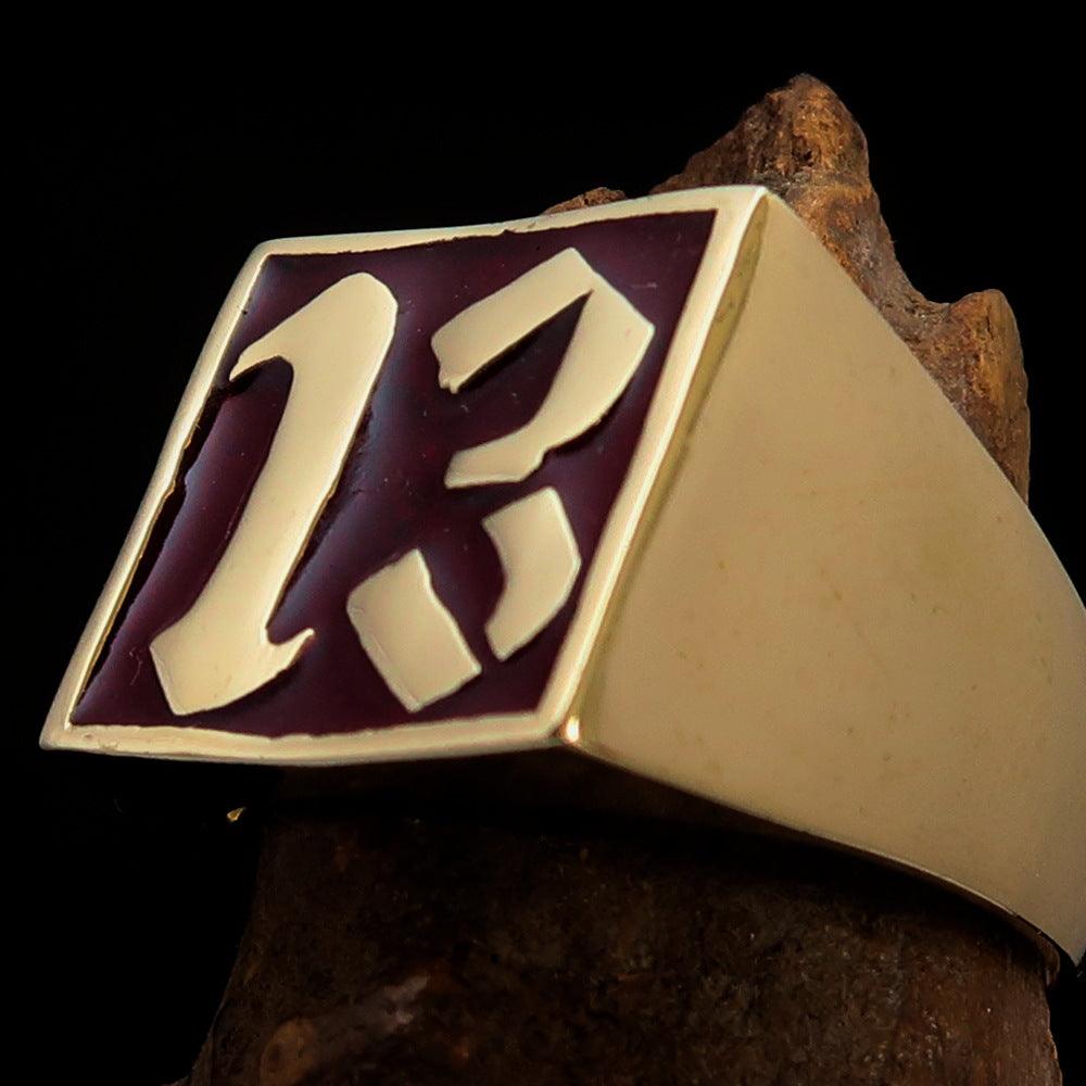 Introducing the exquisite Men's Red Lucky Number 13 Biker Ring, a stunning piece of jewelry that combines style, durability, and a touch of luck. Crafted from solid brass, this ring is designed to withstand the test of time while making a bold statement. The mirror-polished surface, adorned with vibrant red enamel, adds a striking contrast that is sure to catch the eye of anyone who sees it.