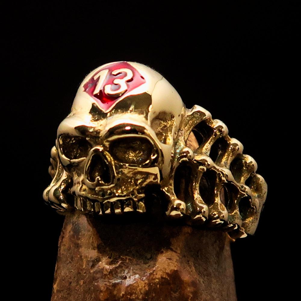 Introducing the Excellent Crafted Men's Skull and Bones Ring featuring a bold red Number 13 design, meticulously made from solid brass. This unique ring is not just a piece of jewelry; it’s a statement of style and individuality. The vibrant red enamel adds a striking contrast to the brass, making it an eye-catching accessory for any occasion.