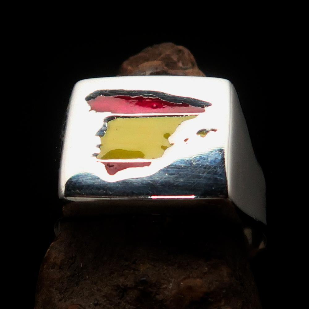 Introducing our exquisitely crafted Men's Spanish Flag Ring, a stunning piece of jewelry that showcases your pride in Spain. Made from high-quality sterling silver, this ring features a vibrant enamel design of the Spanish flag, making it a perfect accessory for any occasion. The ring is hallmarked 925, ensuring its authenticity and quality, and it is engraved with the RCRN logo, a mark of excellence in craftsmanship.