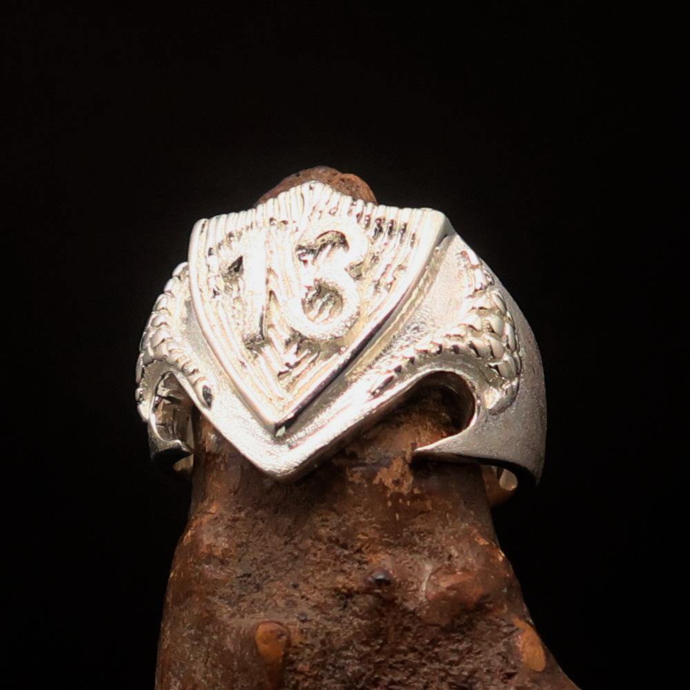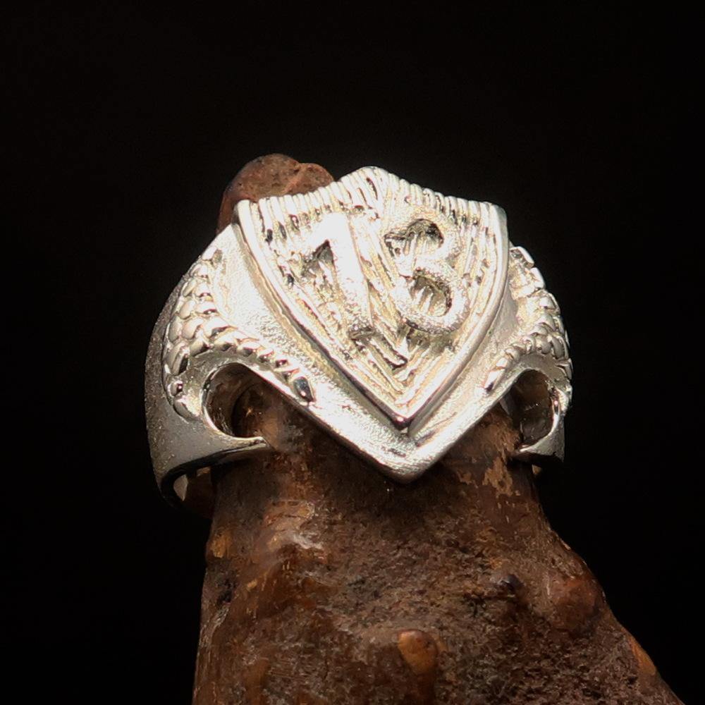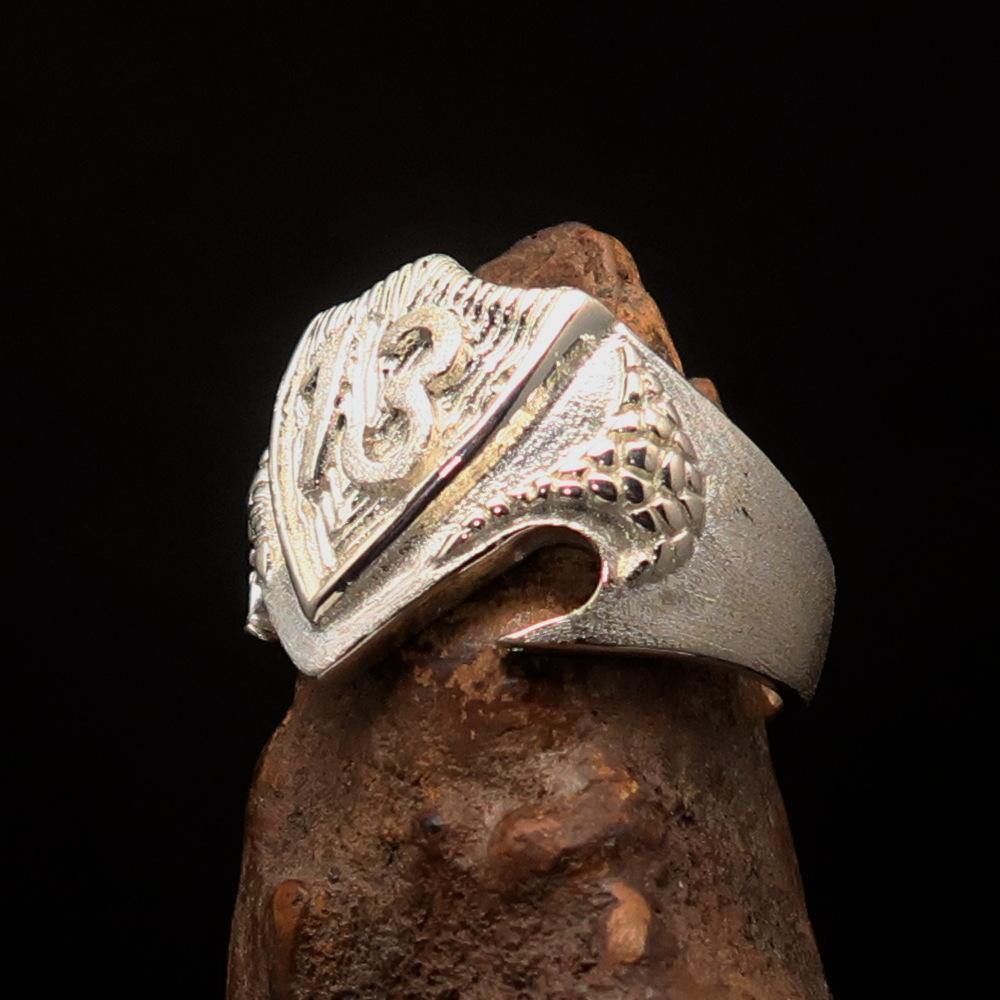 Introducing the Excellent Crafted Men's Two-Tone Matte Lucky Number 13 Shield Ring, a stunning piece of jewelry that combines elegance and individuality. Made from solid sterling silver, this ring is designed for those who appreciate quality craftsmanship and unique style. The two-tone matte finish adds a modern touch, making it a perfect accessory for any occasion.