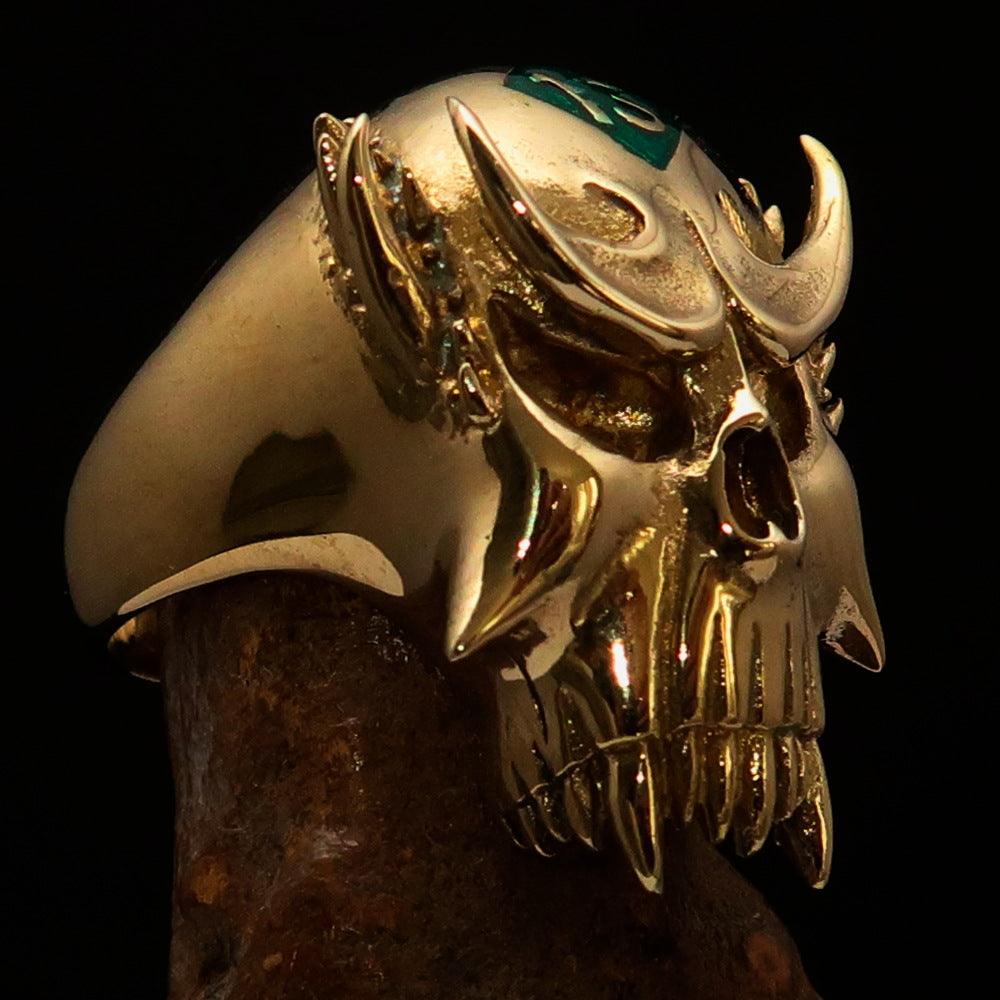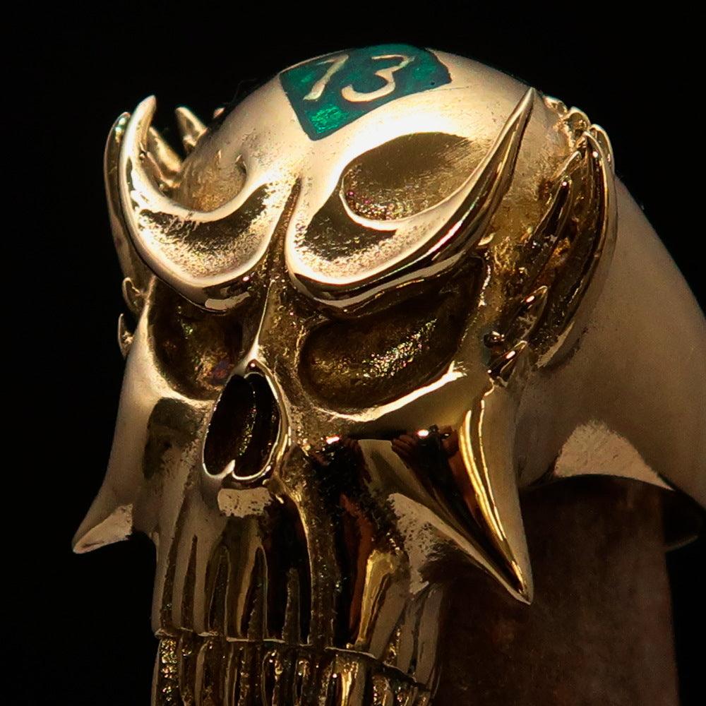 Introducing the Excellent Crafted Men's Vampire Skull Ring with Green Diamond, a stunning piece of jewelry that combines artistry and craftsmanship. This ring is made from solid brass, ensuring durability and a high-quality finish that will last for years to come. The high polished surface is complemented by vibrant green enamel, making it a standout accessory for any occasion.