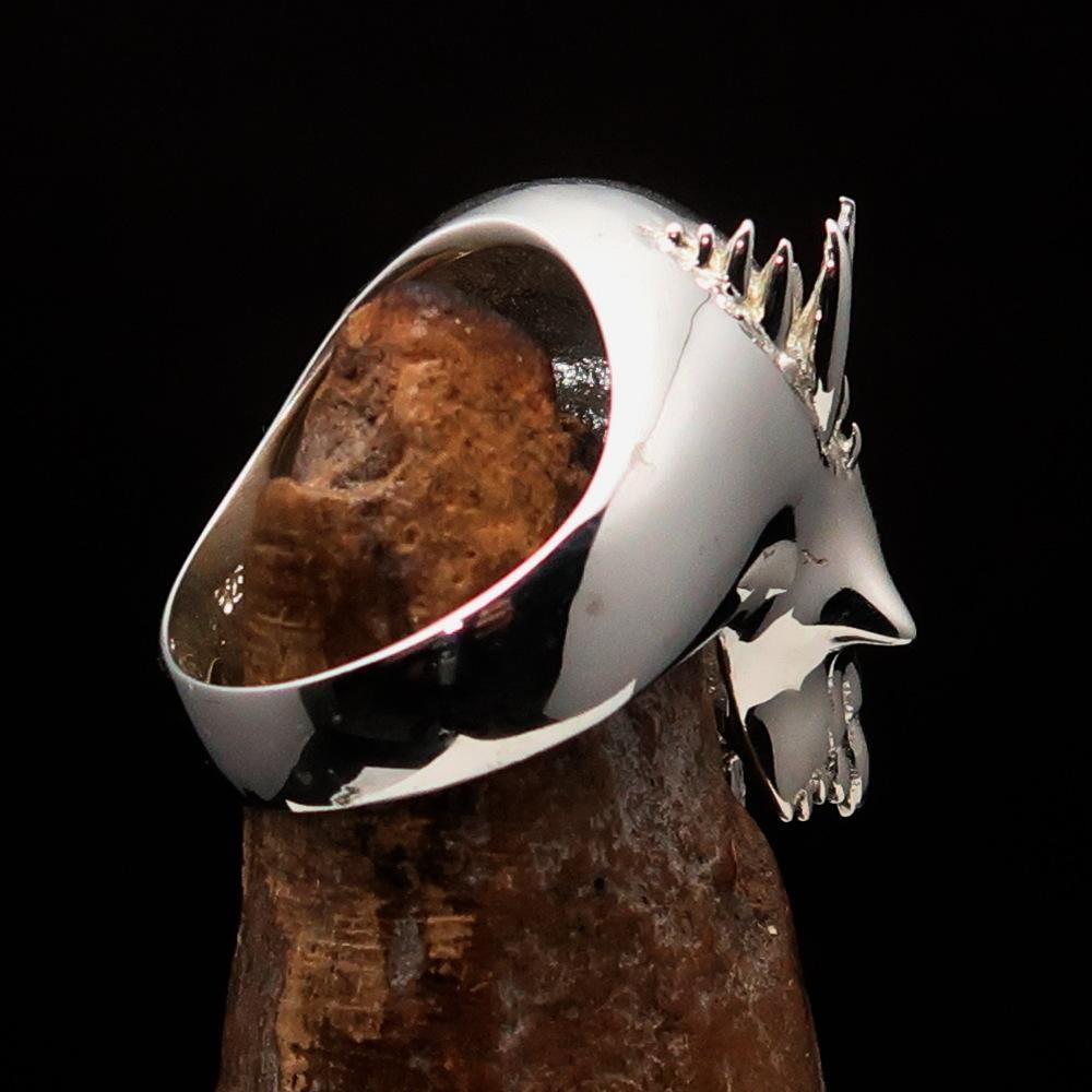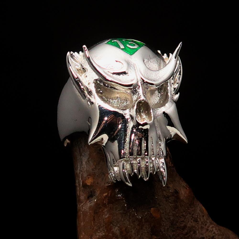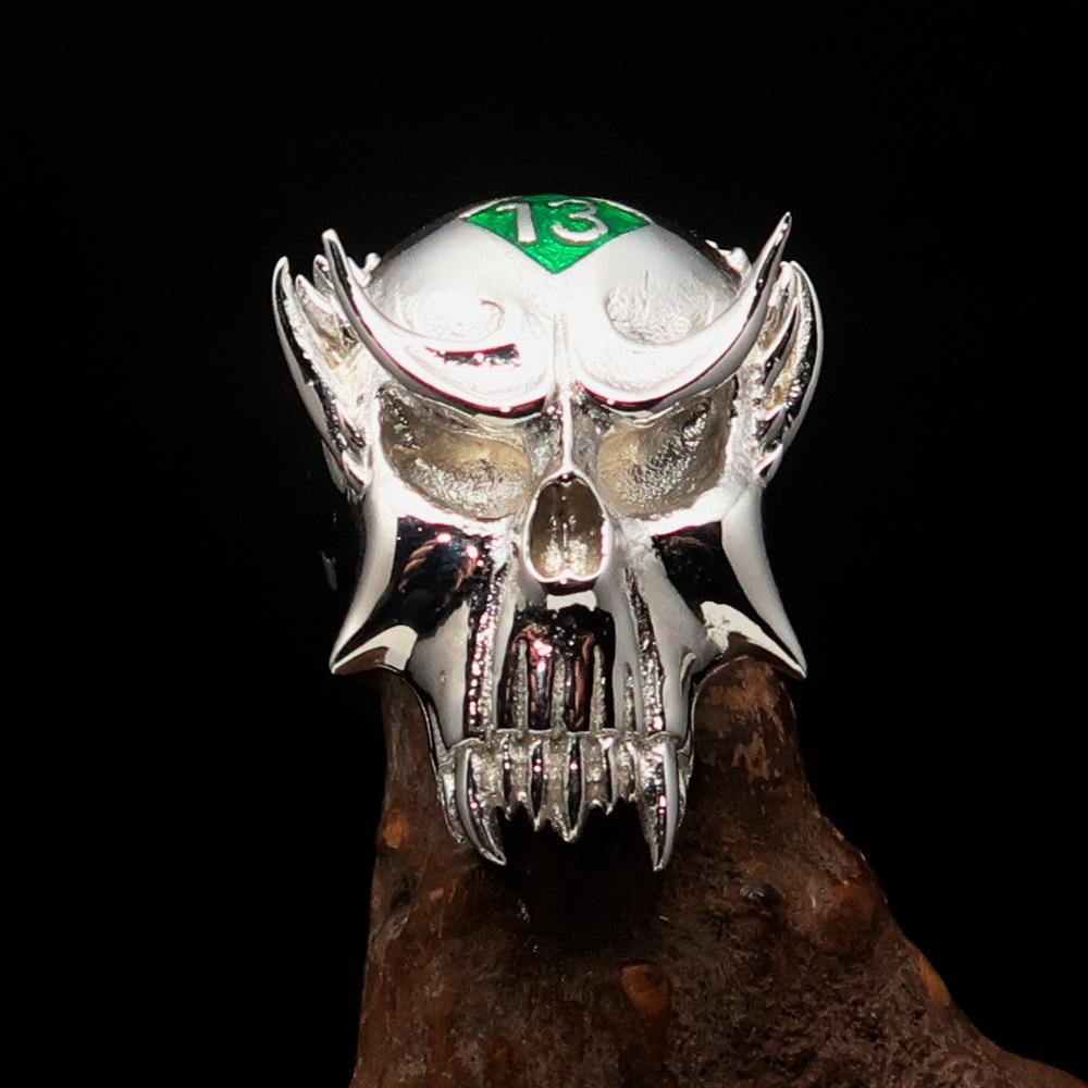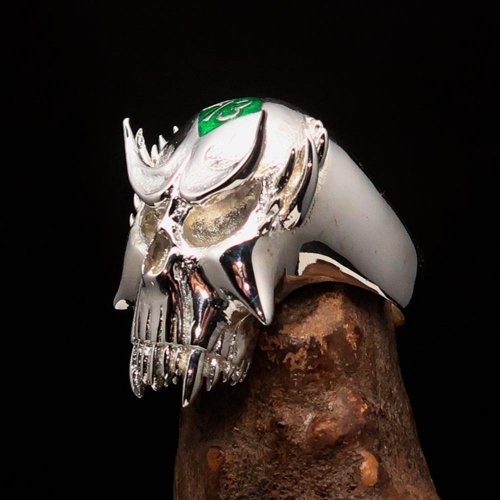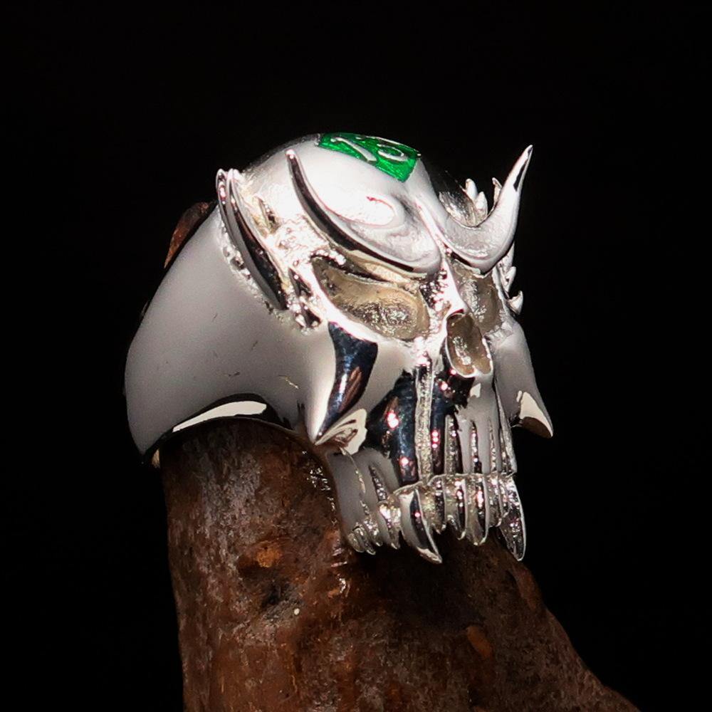 Introducing the Excellent Crafted Men's Vampire Skull Ring with Green Diamond, a stunning piece of jewelry that combines artistry and elegance. Made from solid sterling silver, this ring is not only durable but also showcases a unique design that is sure to turn heads. The high polished finish enhances its aesthetic appeal, making it a perfect accessory for any occasion.