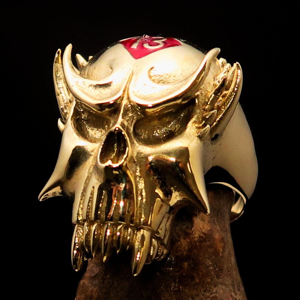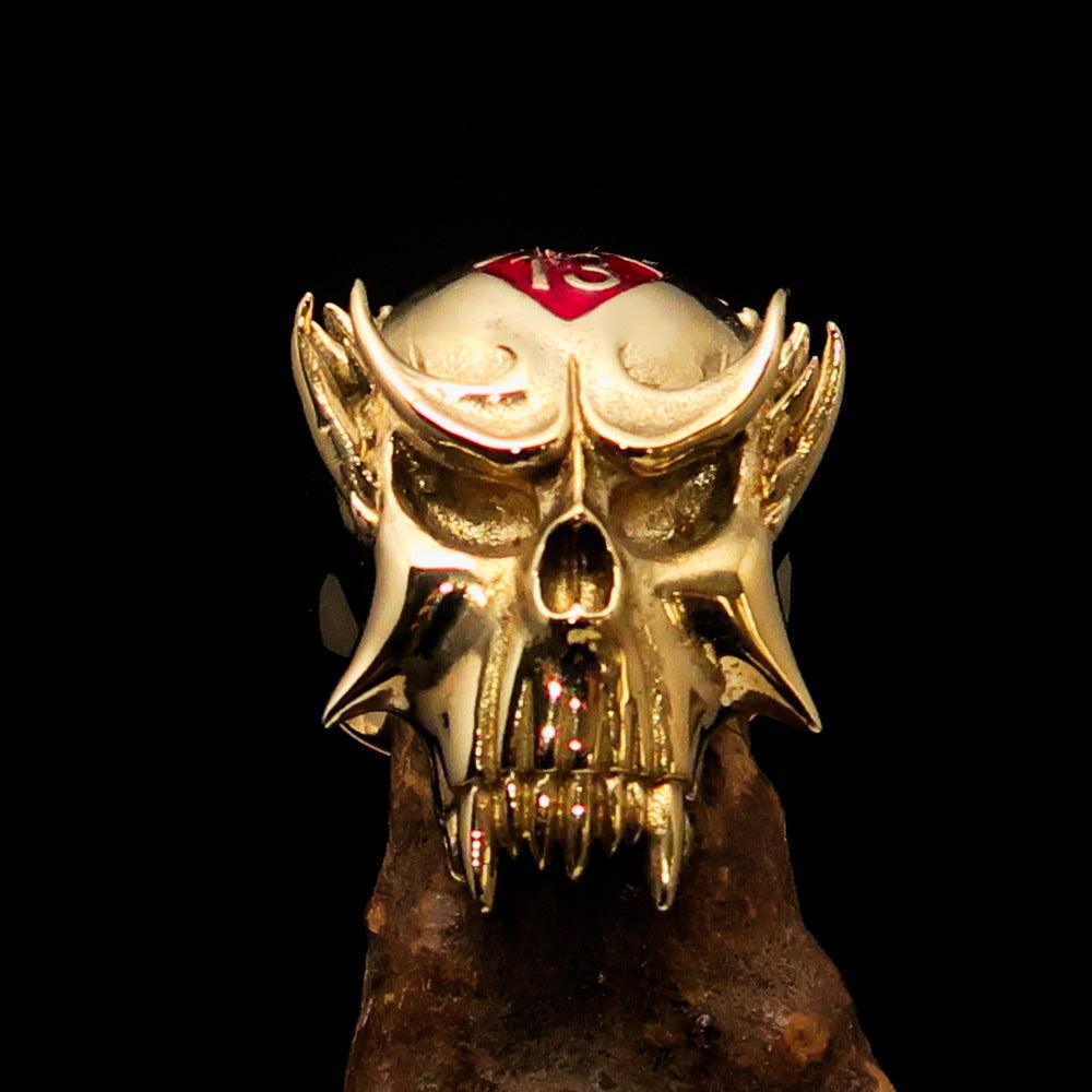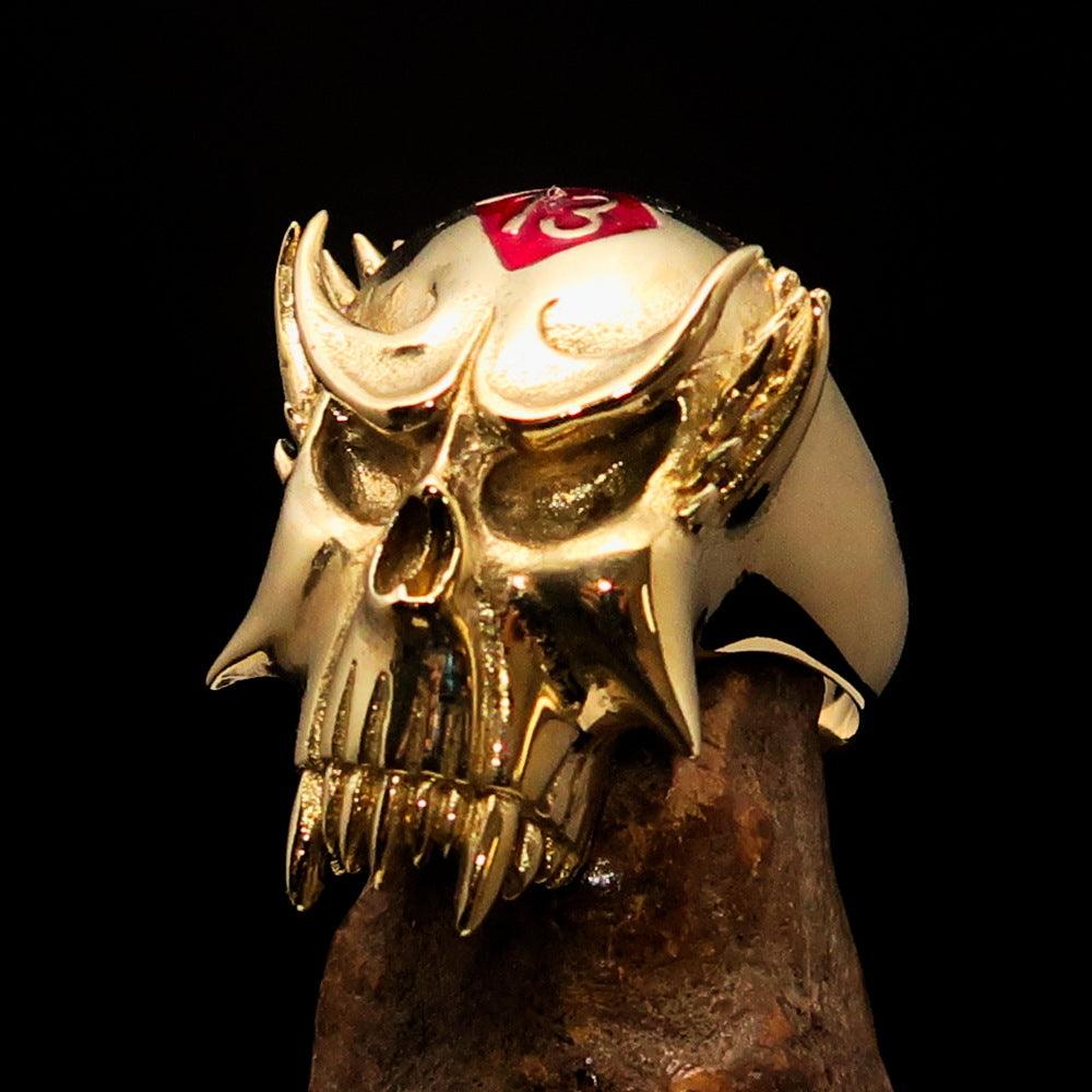 Men's Vampire Skull Ring crafted from solid brass with red diamond accents, featuring a high polished finish and unique design.