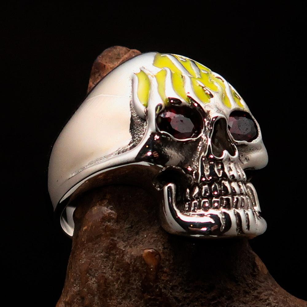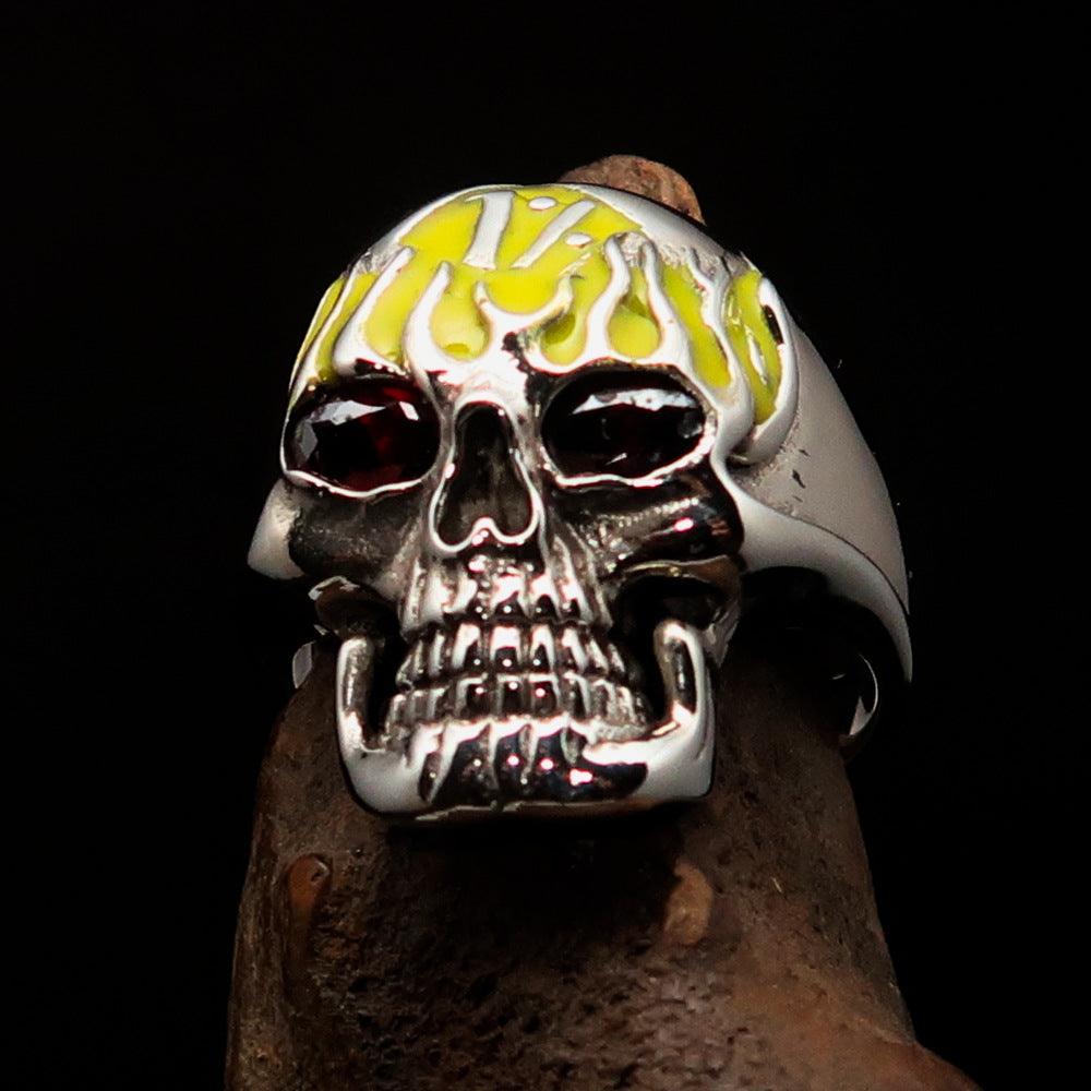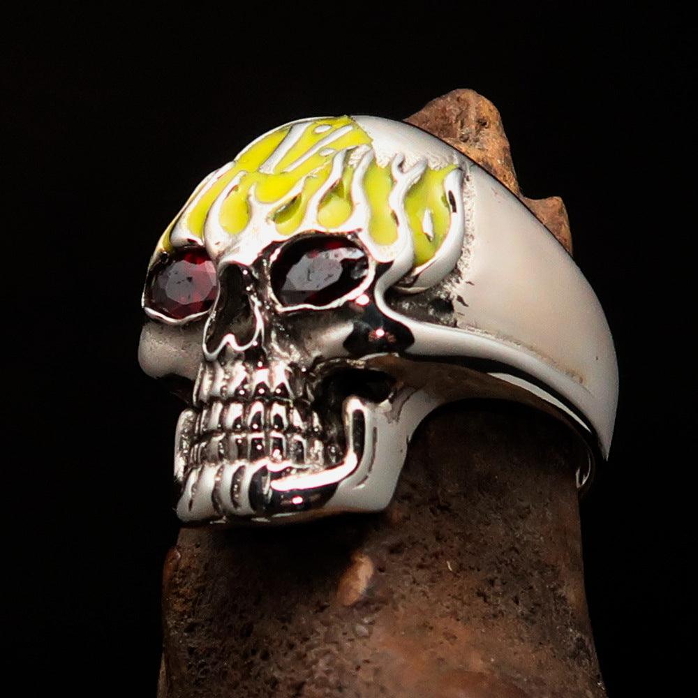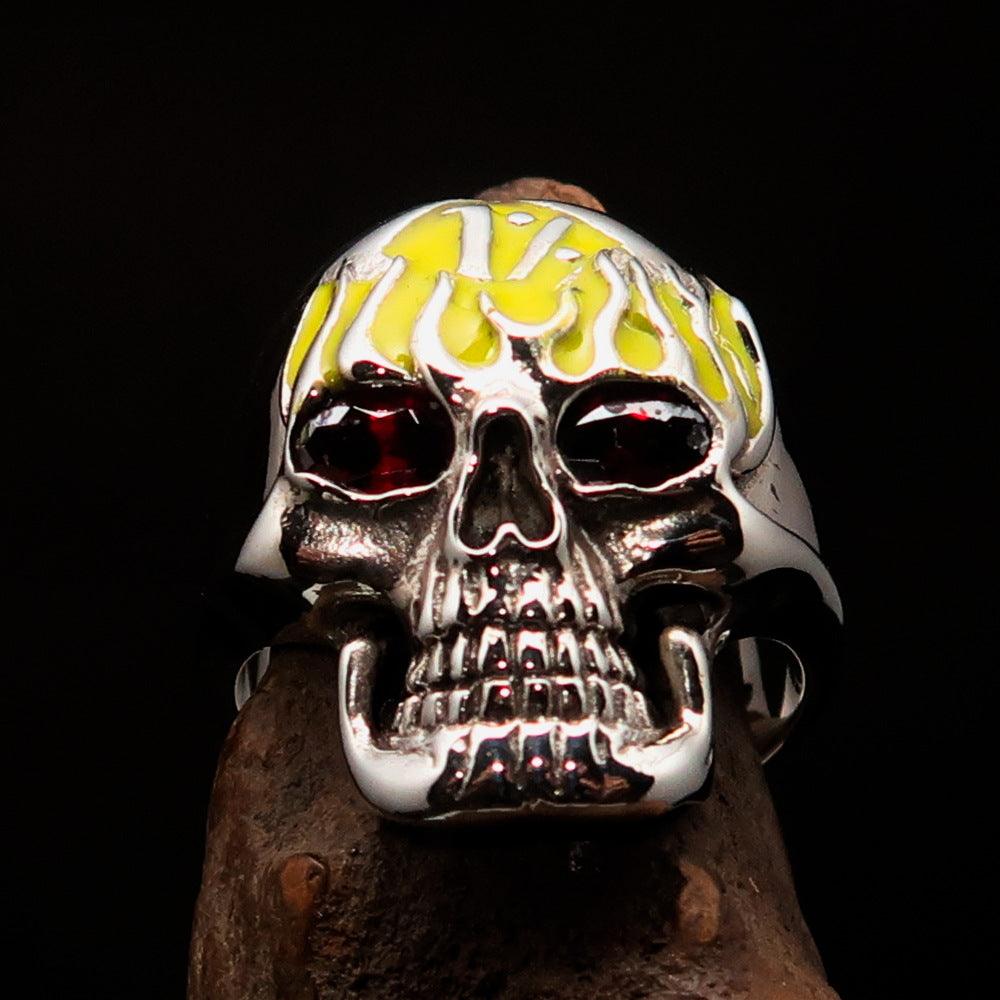 Choosing the Men's Yellow 1% Flaming Skull Outlaw Ring means investing in a piece that is not only stylish but also made with care and precision. Our commitment to quality ensures that you receive a product that meets your expectations. The combination of solid sterling silver, vibrant colors, and unique design makes this ring a must-have for anyone looking to enhance their jewelry collection.