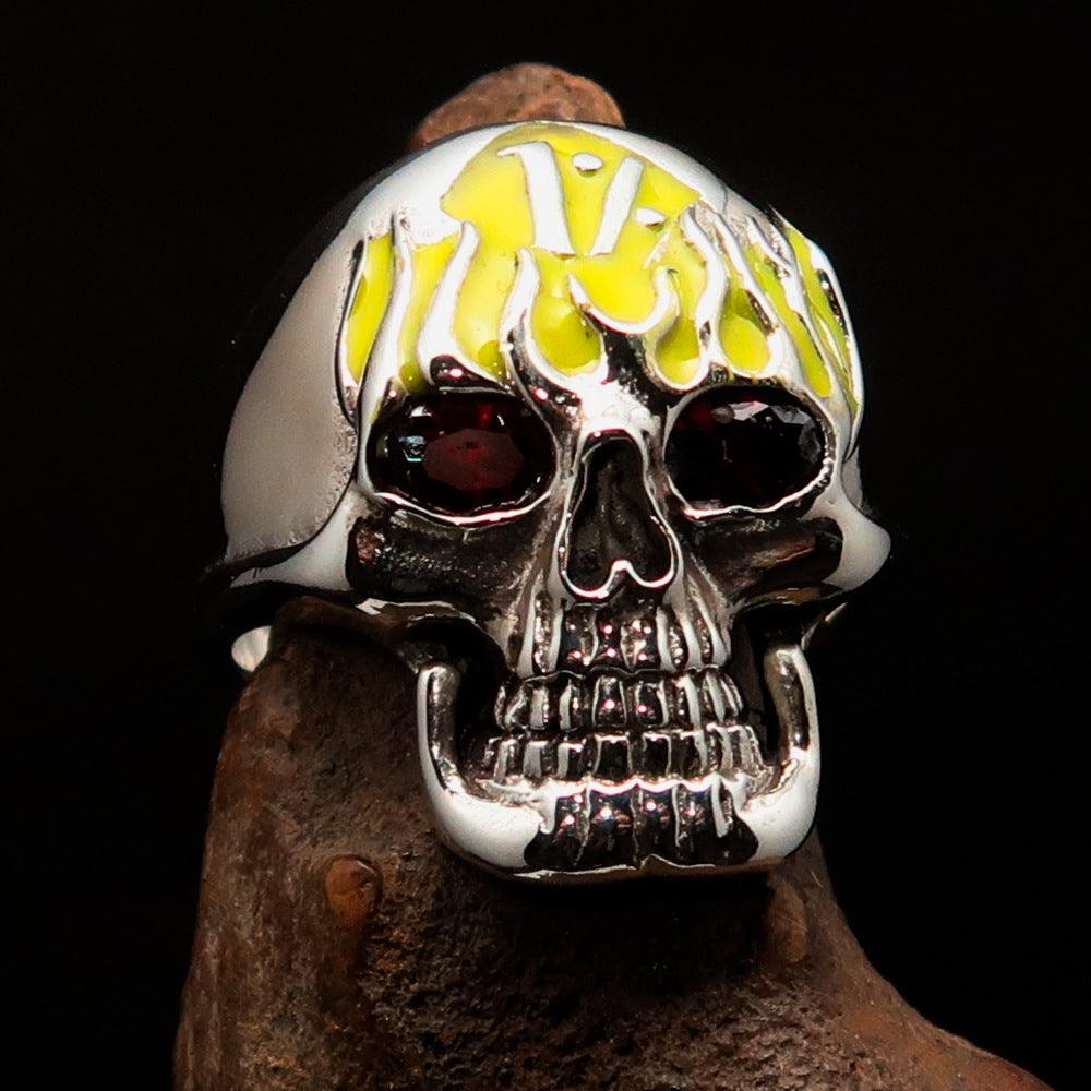 Introducing the Men's Yellow 1% Flaming Skull Outlaw Ring, a stunning piece of jewelry that combines bold design with high-quality craftsmanship. Made from solid sterling silver, this ring is not only durable but also features a mirror-polished finish that enhances its striking appearance. The vibrant yellow enamel adds a unique touch, making it a perfect accessory for bikers and those who appreciate edgy fashion.