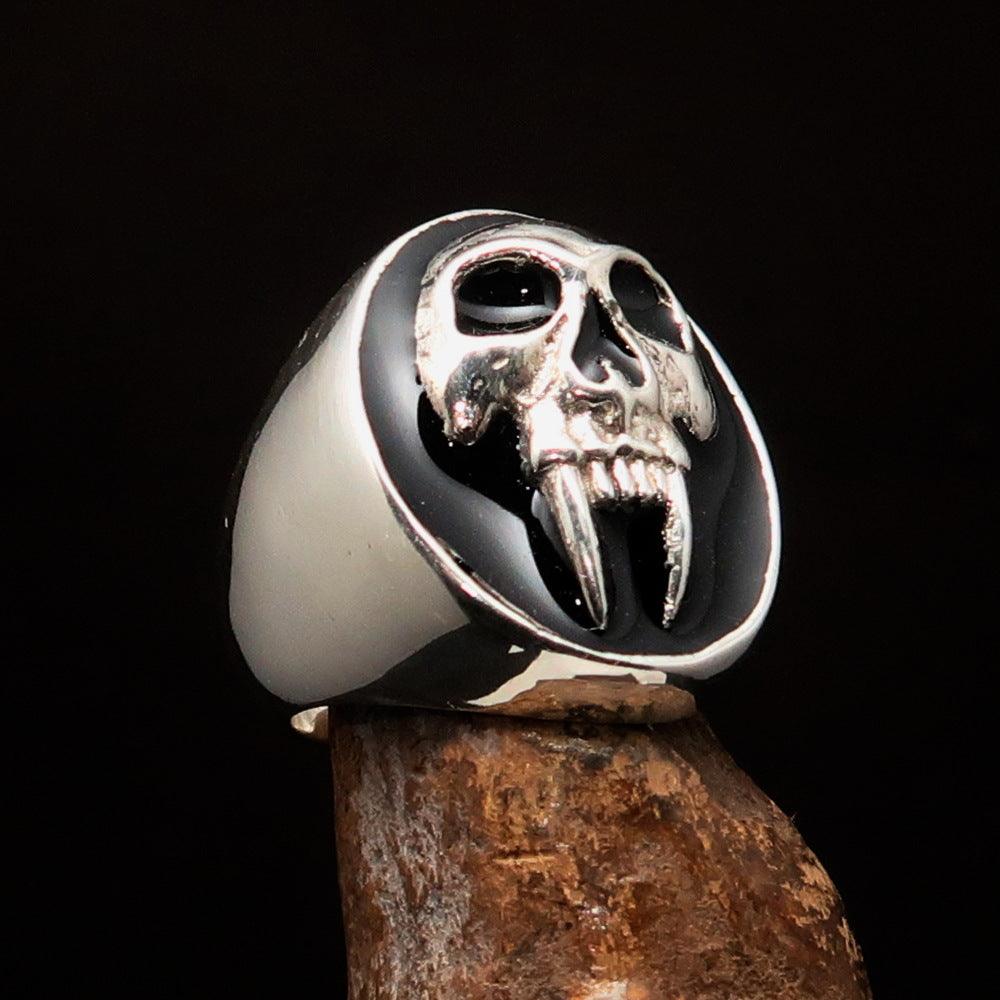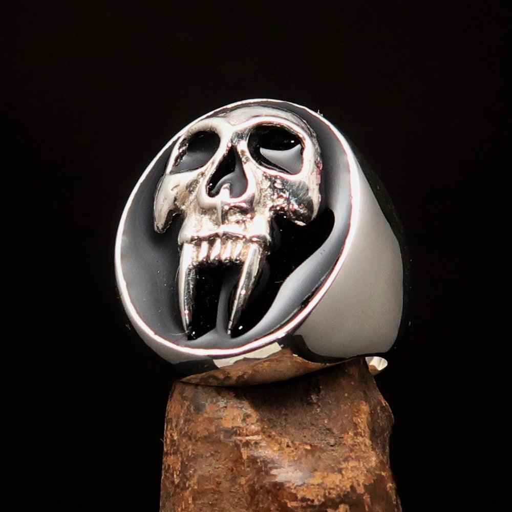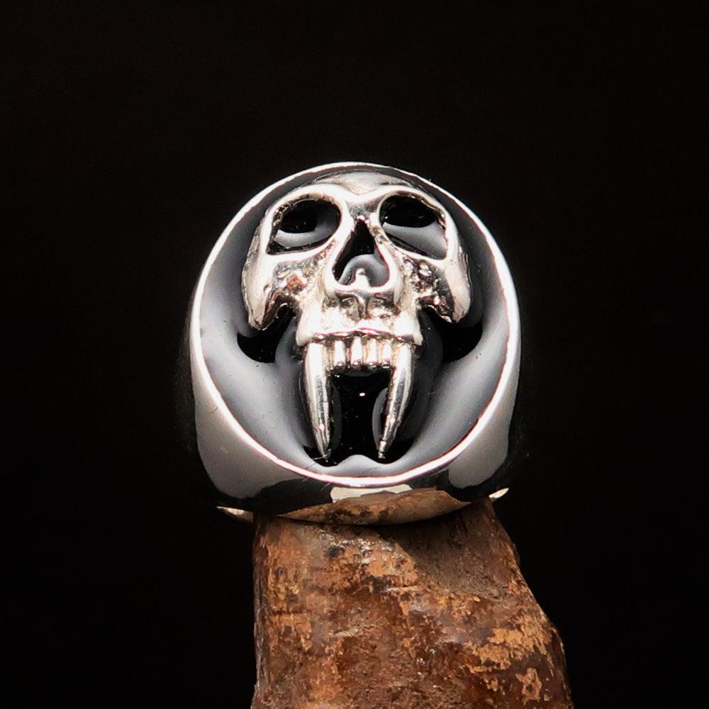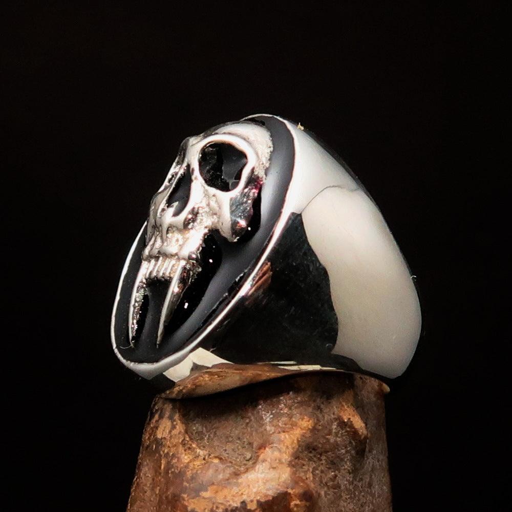 Introducing the Excellent Crafted Oval Men's Black Vampire Skull Ring, a stunning piece of jewelry that combines elegance with a touch of the macabre. Made from solid sterling silver, this ring is not only a statement piece but also a testament to fine craftsmanship. The high-polished finish, complemented by striking black enamel, gives it a unique and eye-catching appearance that is sure to turn heads.