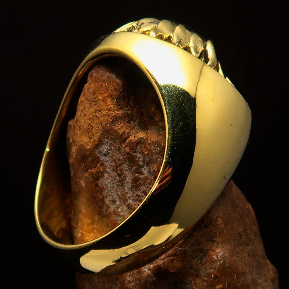 The ring features a high polish finish that not only enhances its aesthetic appeal but also provides a sleek and sophisticated look. This shiny surface reflects light beautifully, making the ring stand out even more. The combination of the polished brass and the vibrant red CZ eyes creates a striking contrast that is sure to catch the eye of anyone who sees it.