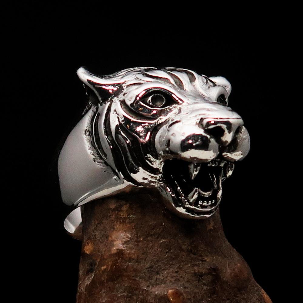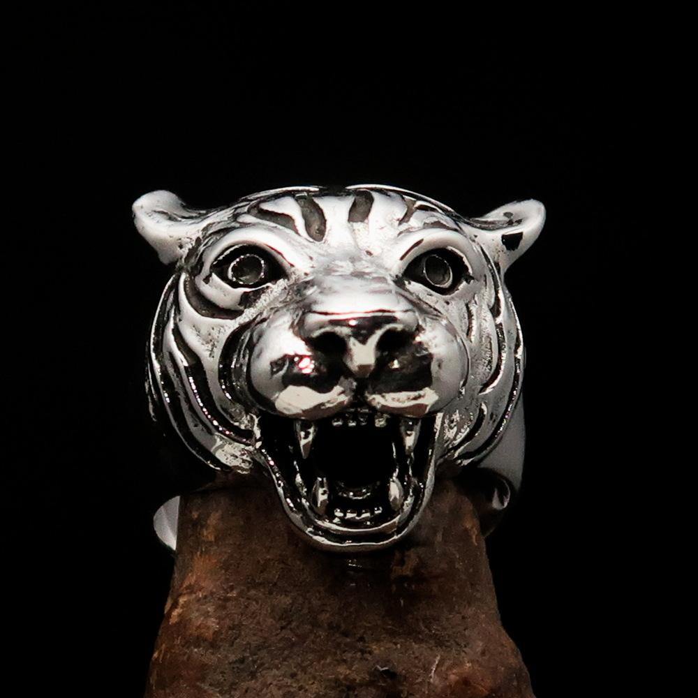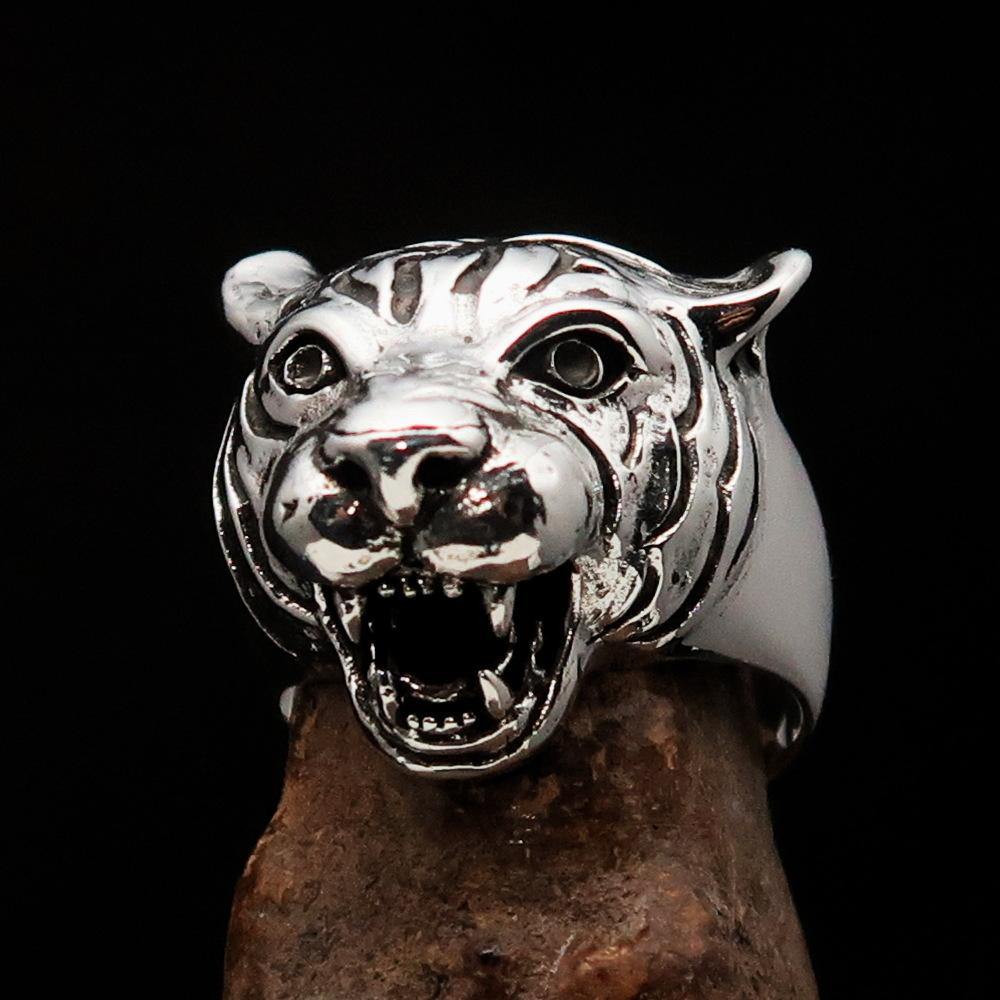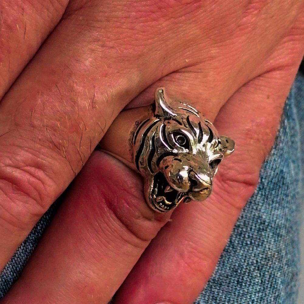The ring has been carefully antiqued and high polished, giving it a unique and eye-catching look. The combination of these finishes enhances the intricate details of the tiger head, making it a true statement piece. Whether you are dressing up for a special event or looking to add flair to your everyday outfit, this ring is versatile enough to suit any style.