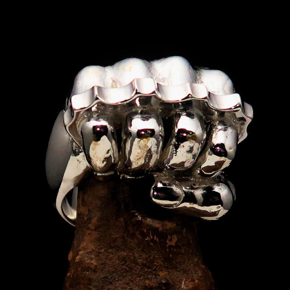 A beautifully crafted sterling silver biker ring featuring a knuckle duster fist design, showcasing its antiqued and polished finish.