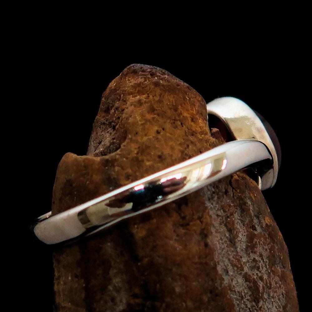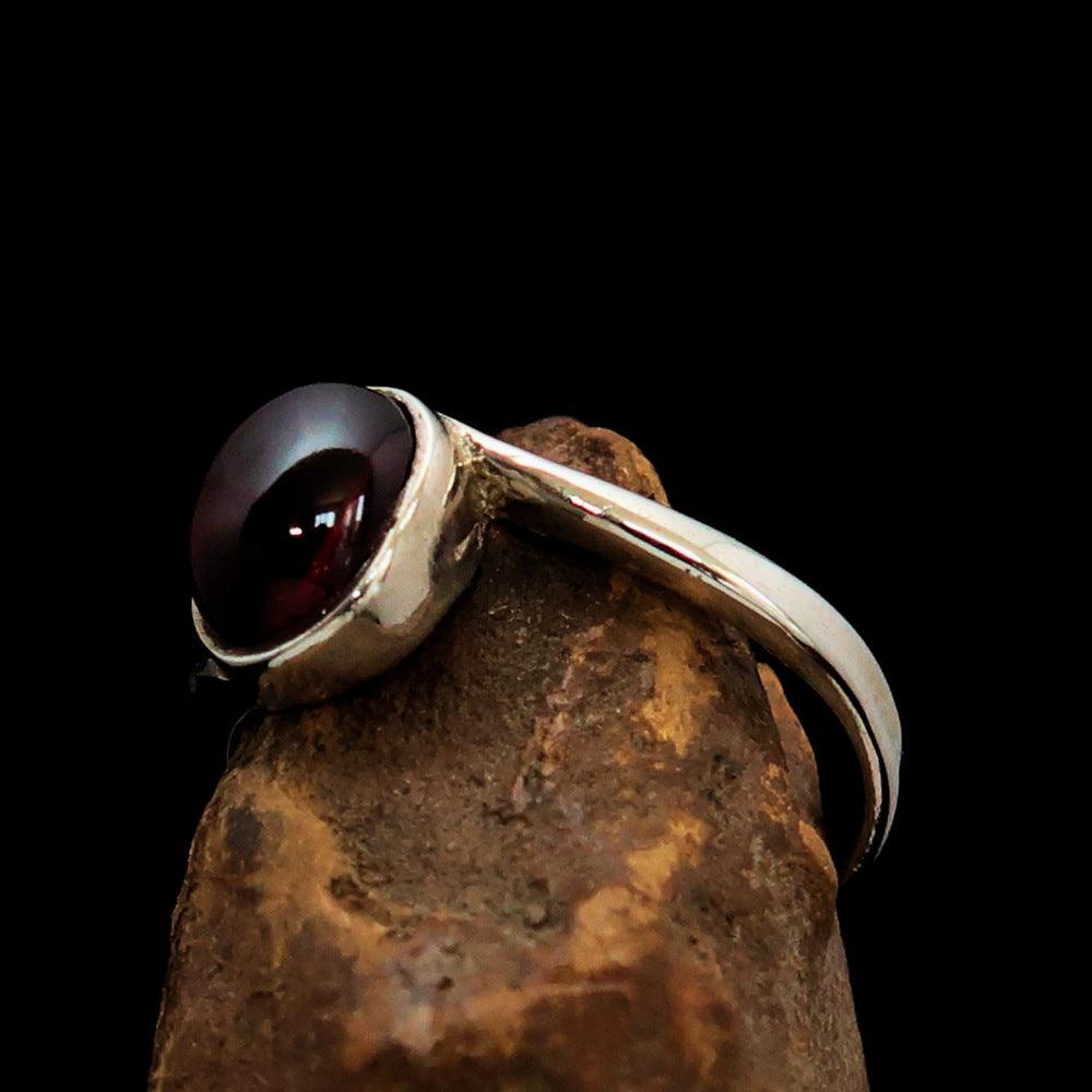 Introducing our beautifully crafted Women's Ring, showcasing a striking red Garnet Cabochon set in solid Sterling Silver. This ring is not only a piece of jewelry but a statement of elegance and sophistication. The vibrant red garnet gemstone is known for its rich color and is believed to symbolize love and passion, making it a perfect gift for yourself or a loved one.