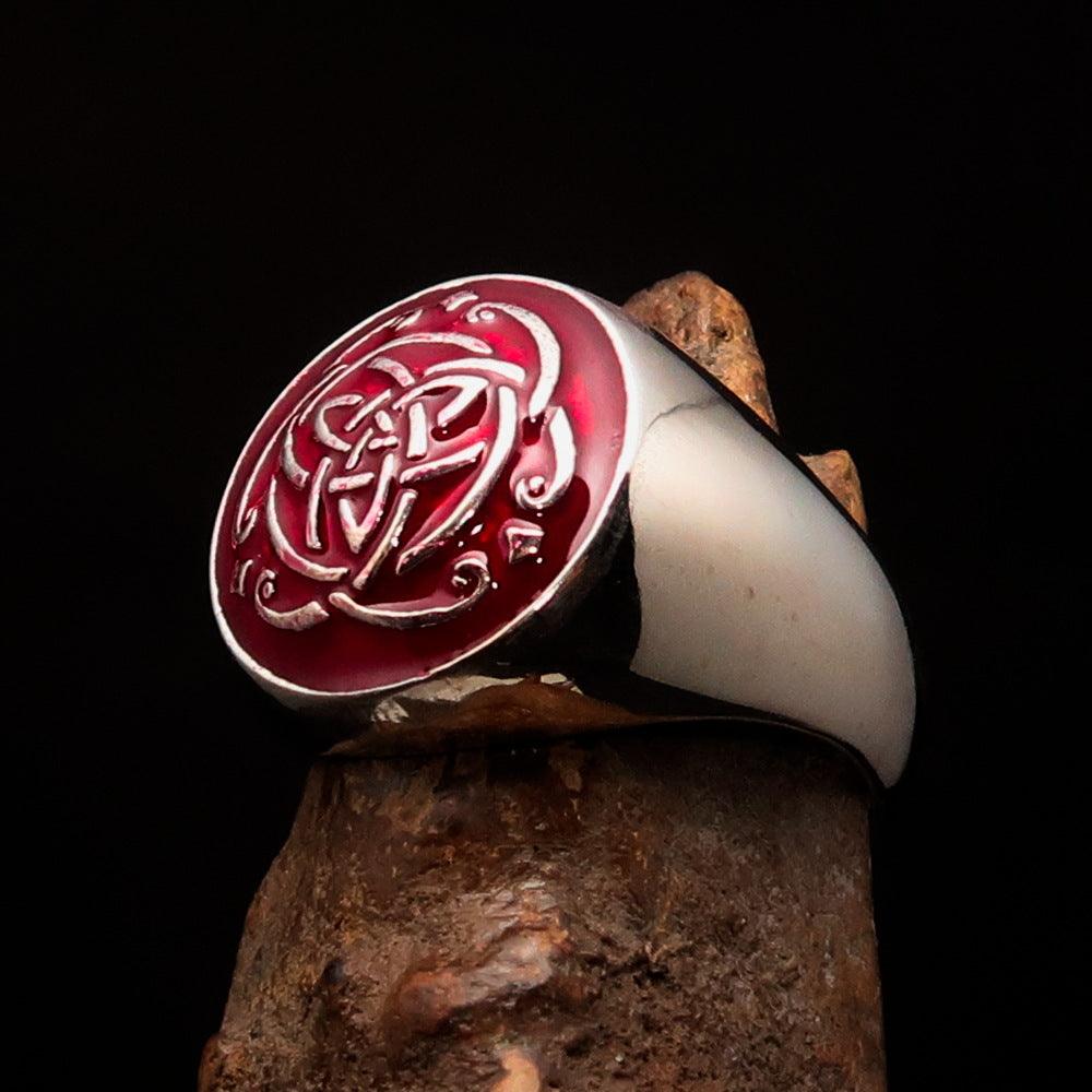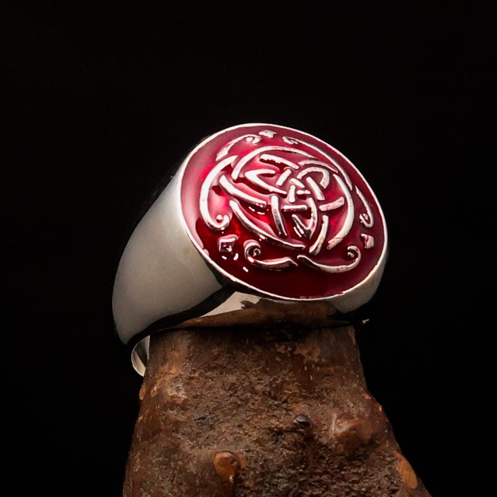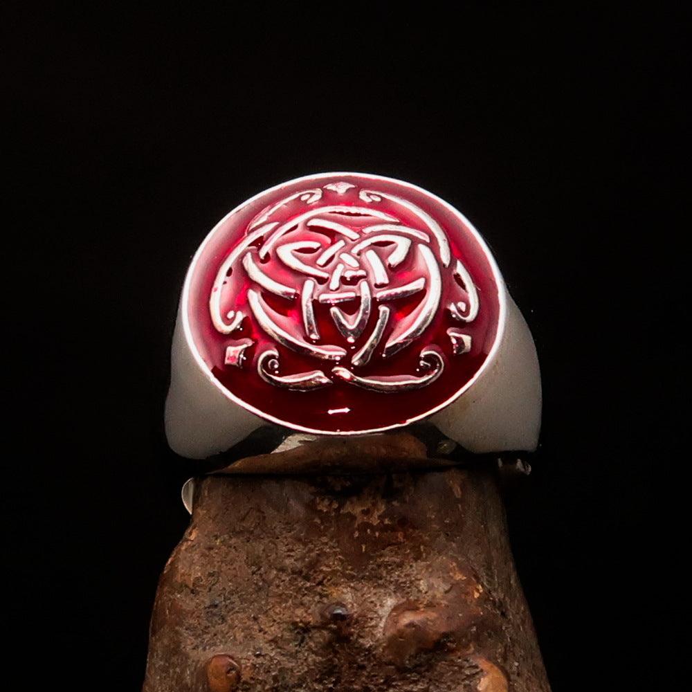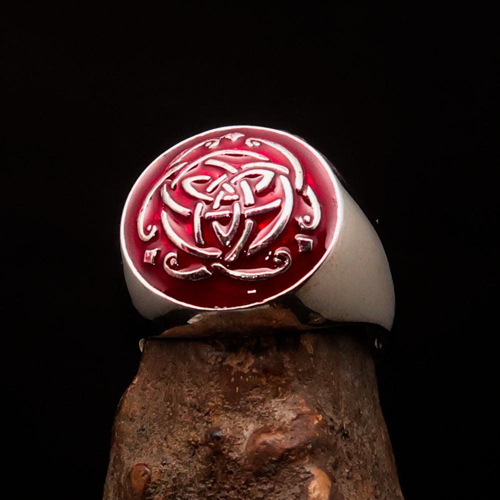 A beautifully crafted sterling silver men's ring featuring a red Celtic Triquetra Knot design, polished to a high shine.